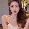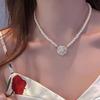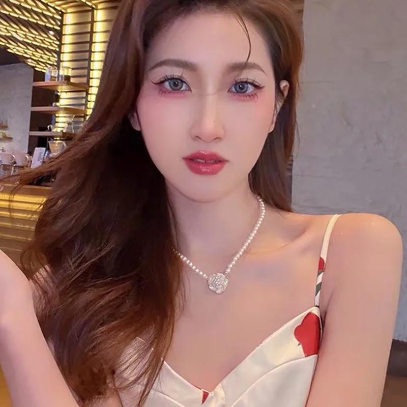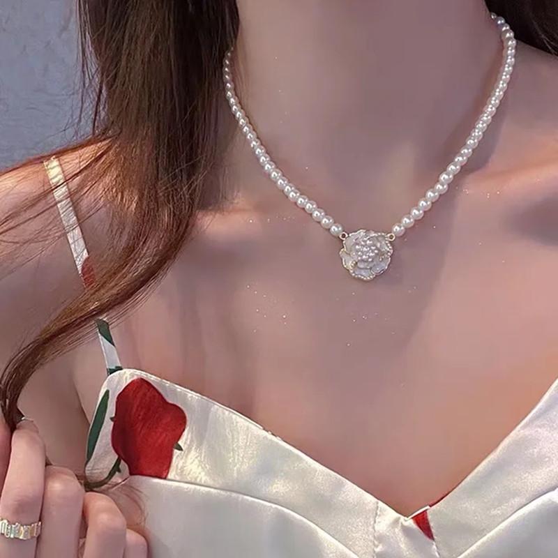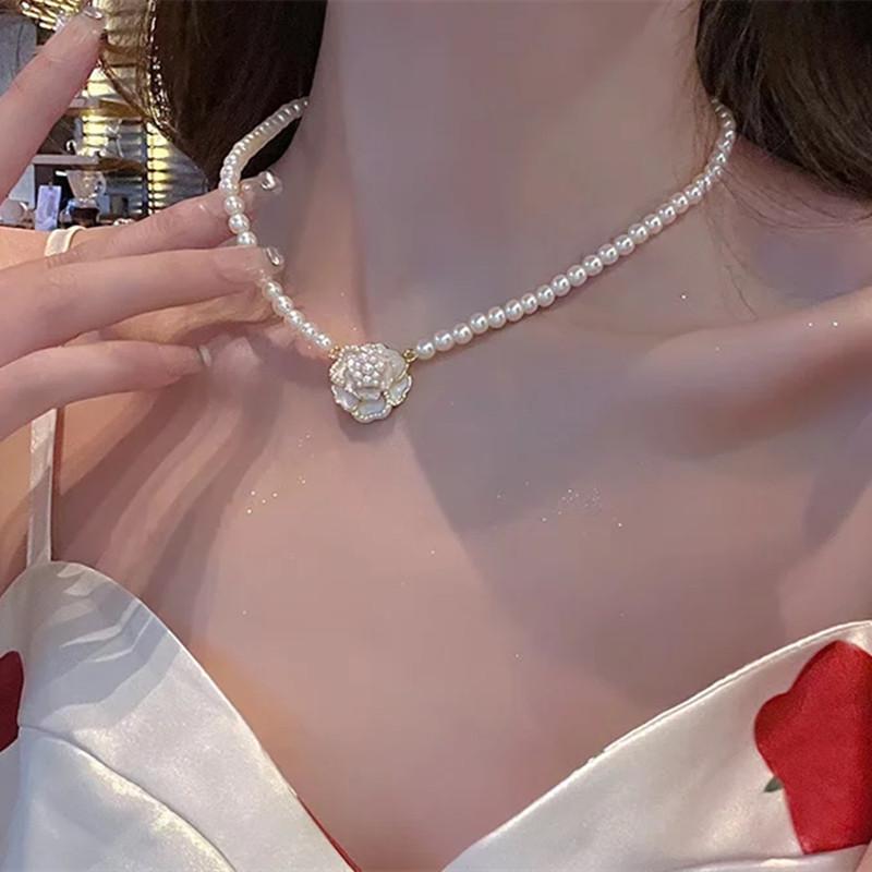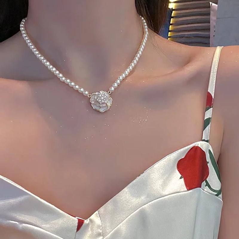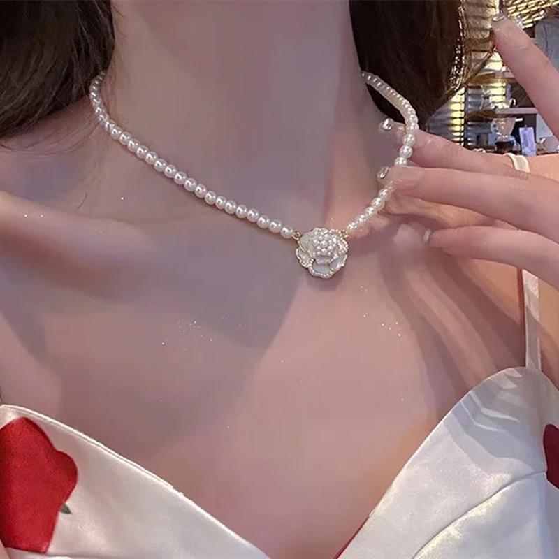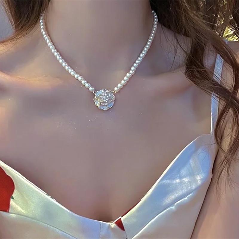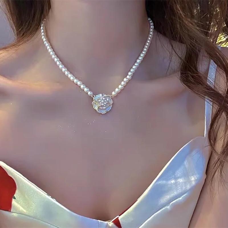Collar de perlas de camelia retro francés para mujer, elegante diseño de nicho, estilo palacio, elegante collar con cadena de clavícula a la moda.