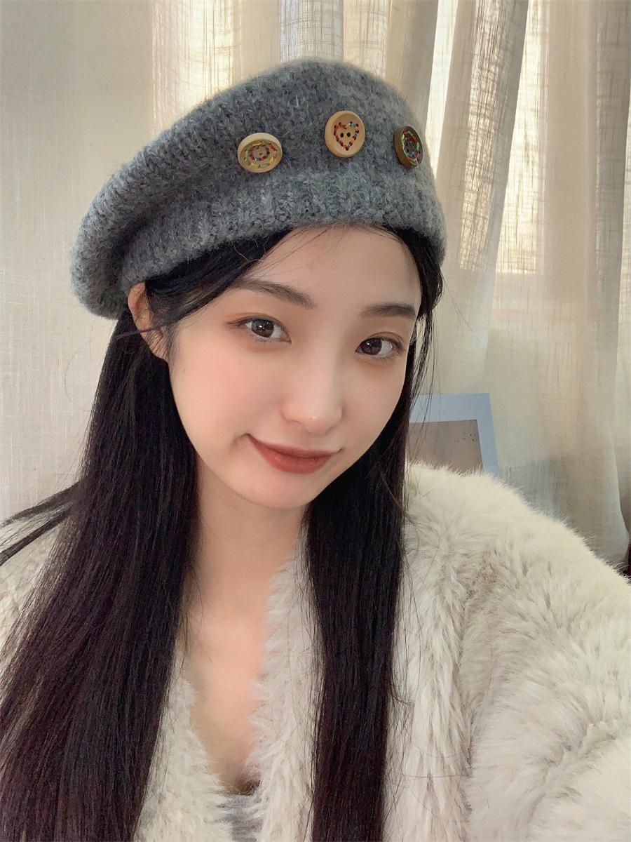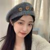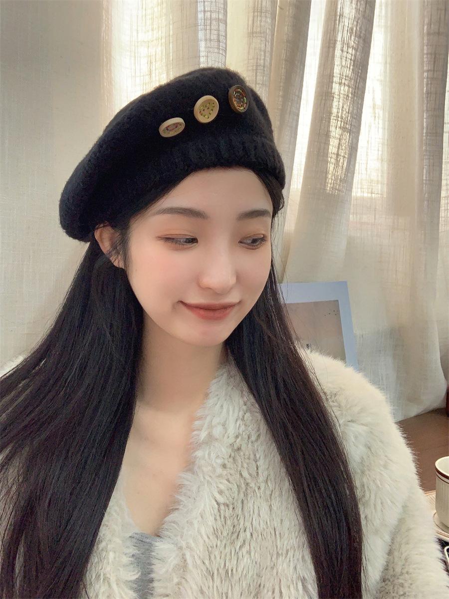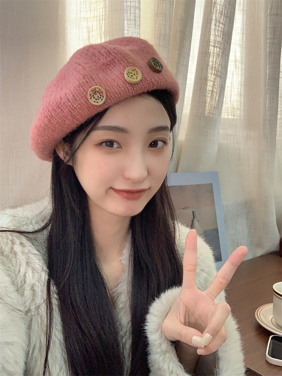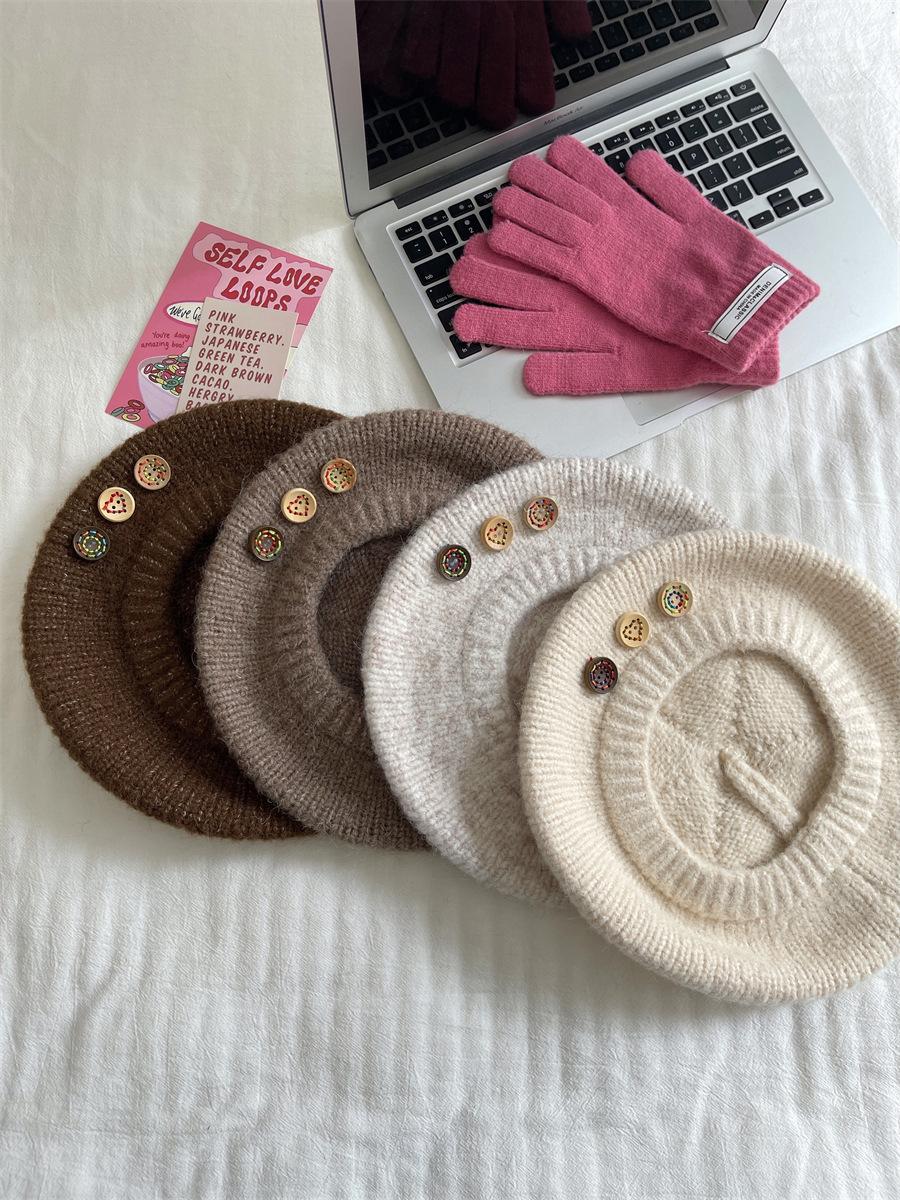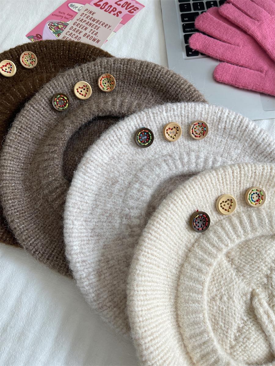 Boina de punto con botones de estilo perezoso para mujer, estilo japonés, otoño e invierno, retro, dulce, versátil, de moda, pintor, sombrero de calabaza