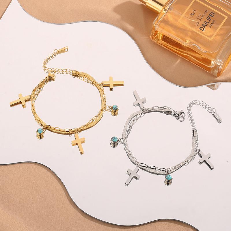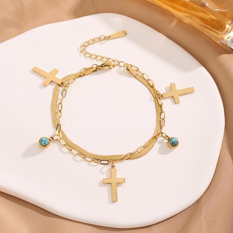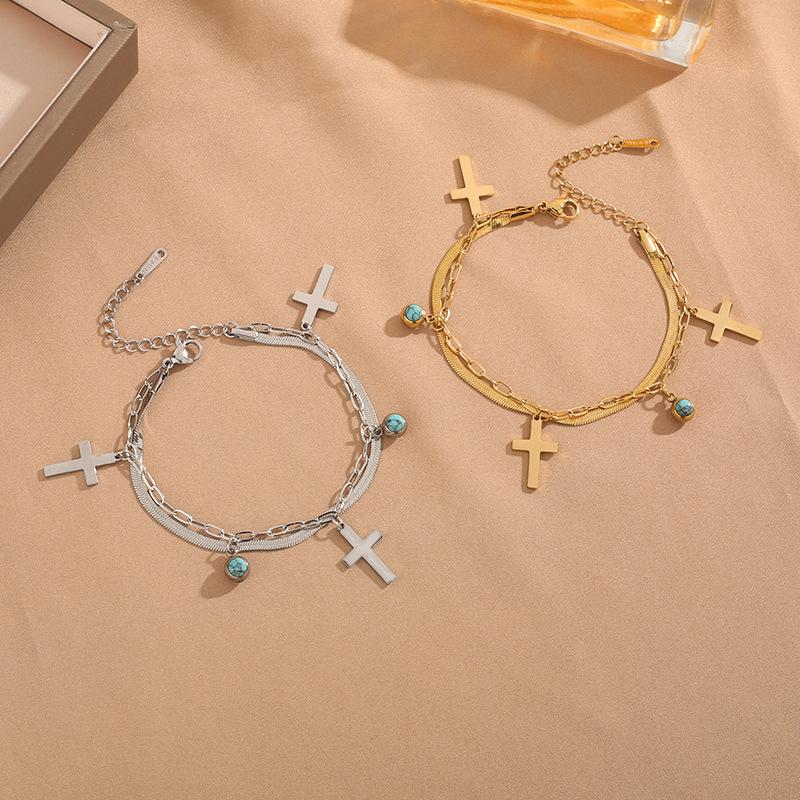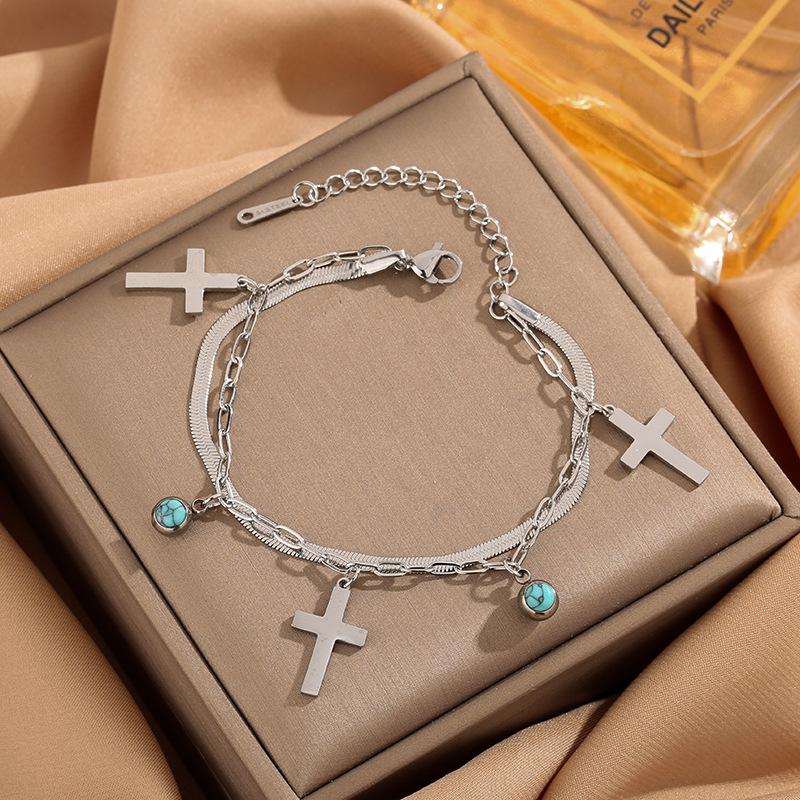 Nueva Pulsera Europea y Americana de Acero Inoxidable con Cruz de Doble Capa, Colgante Personalizado, Pulsera de Turquesa, Nicho para Mujer, Lujo Ligero Vintage