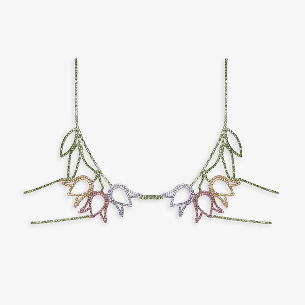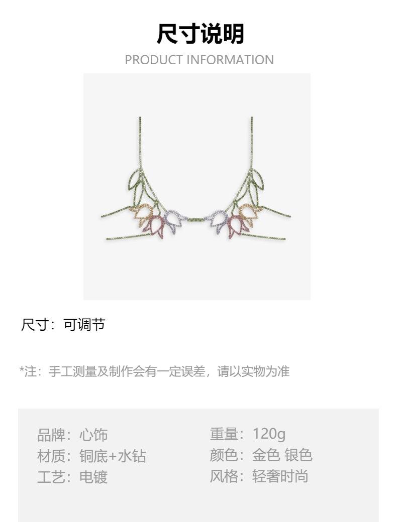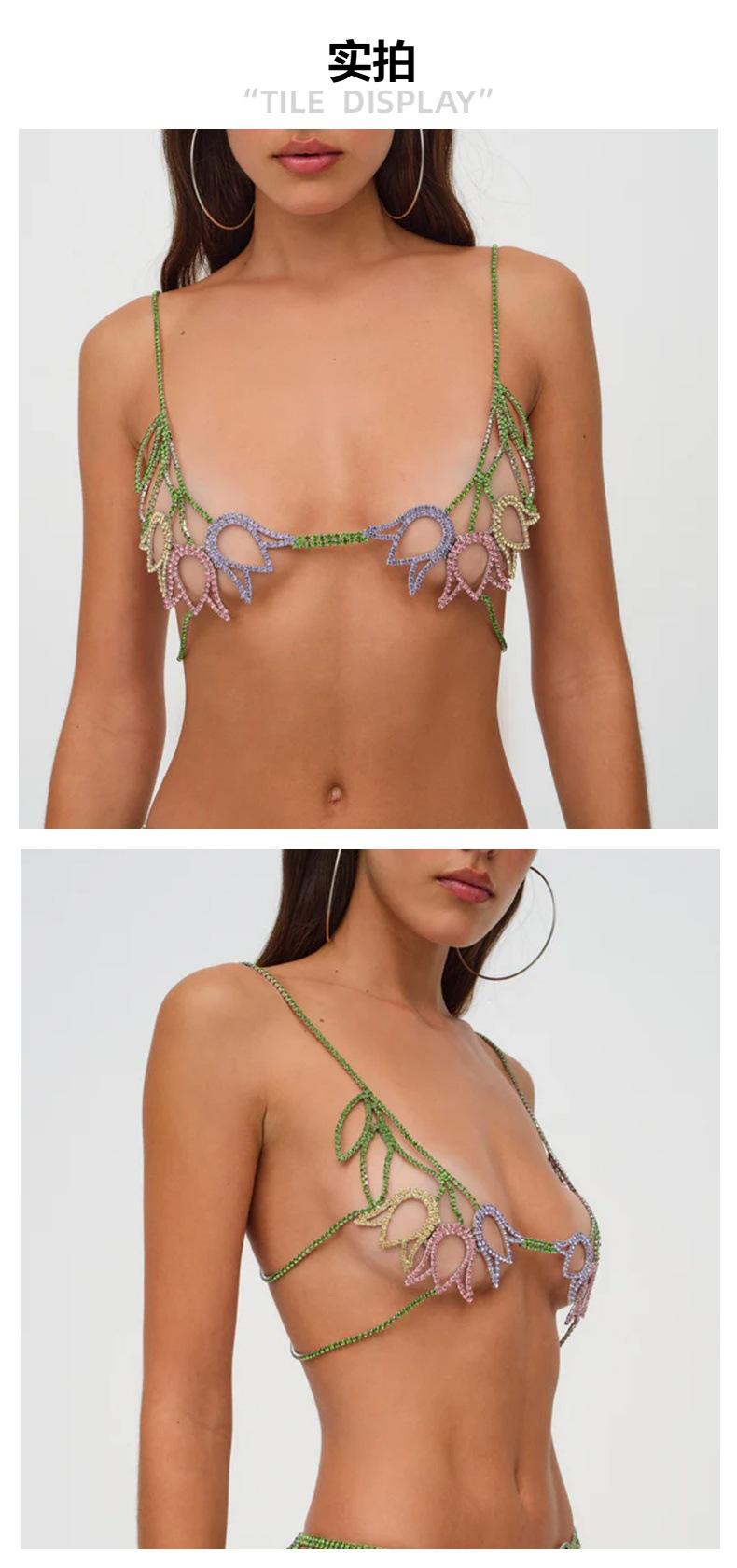 Nueva cadena de pecho con sujetador de rosas coloridas de Amazon, cadena corporal sexy con diamantes de imitación para discotecas europeas y americanas.