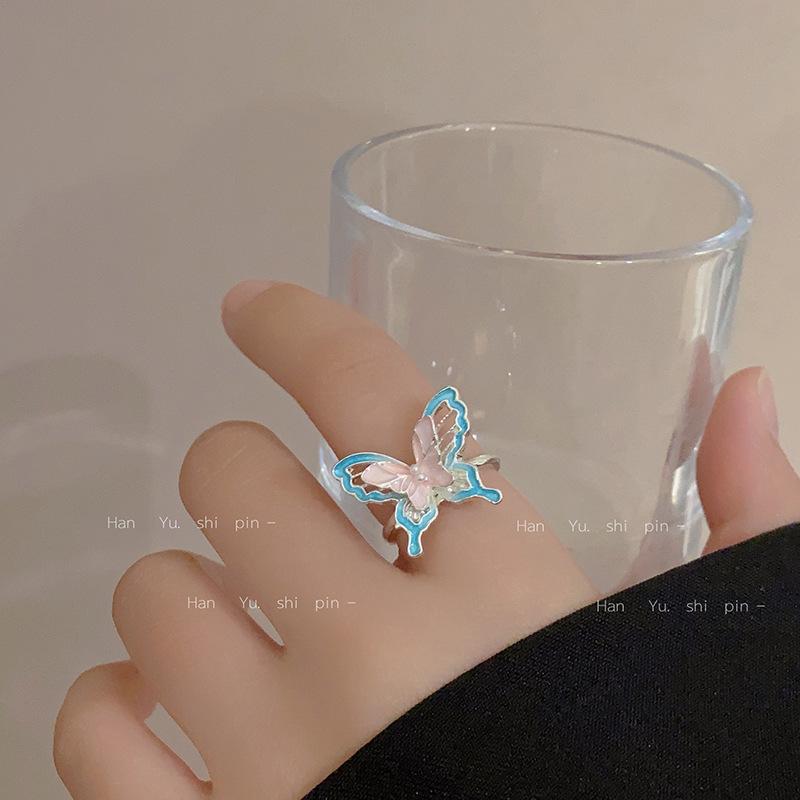Lujo Ligero Sentido de Alta Gama Anillo de Mariposa Bicolor con Goteo de Aceite Moda Dulce Anillo de Dedo Abierto Mariposa Zhuang Zhou Meng Elegante Combinación con Todo