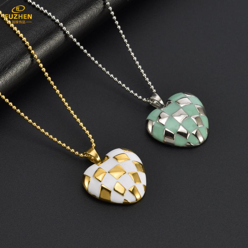 ![]() Collar de moda OL de corazón de melocotón con colgante de amor de tablero de ajedrez de esmalte de alta venta europeo y americano, cadena para clavícula de acero de titanio chapada en oro k para hombres y mujeres