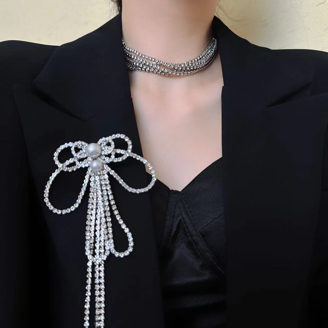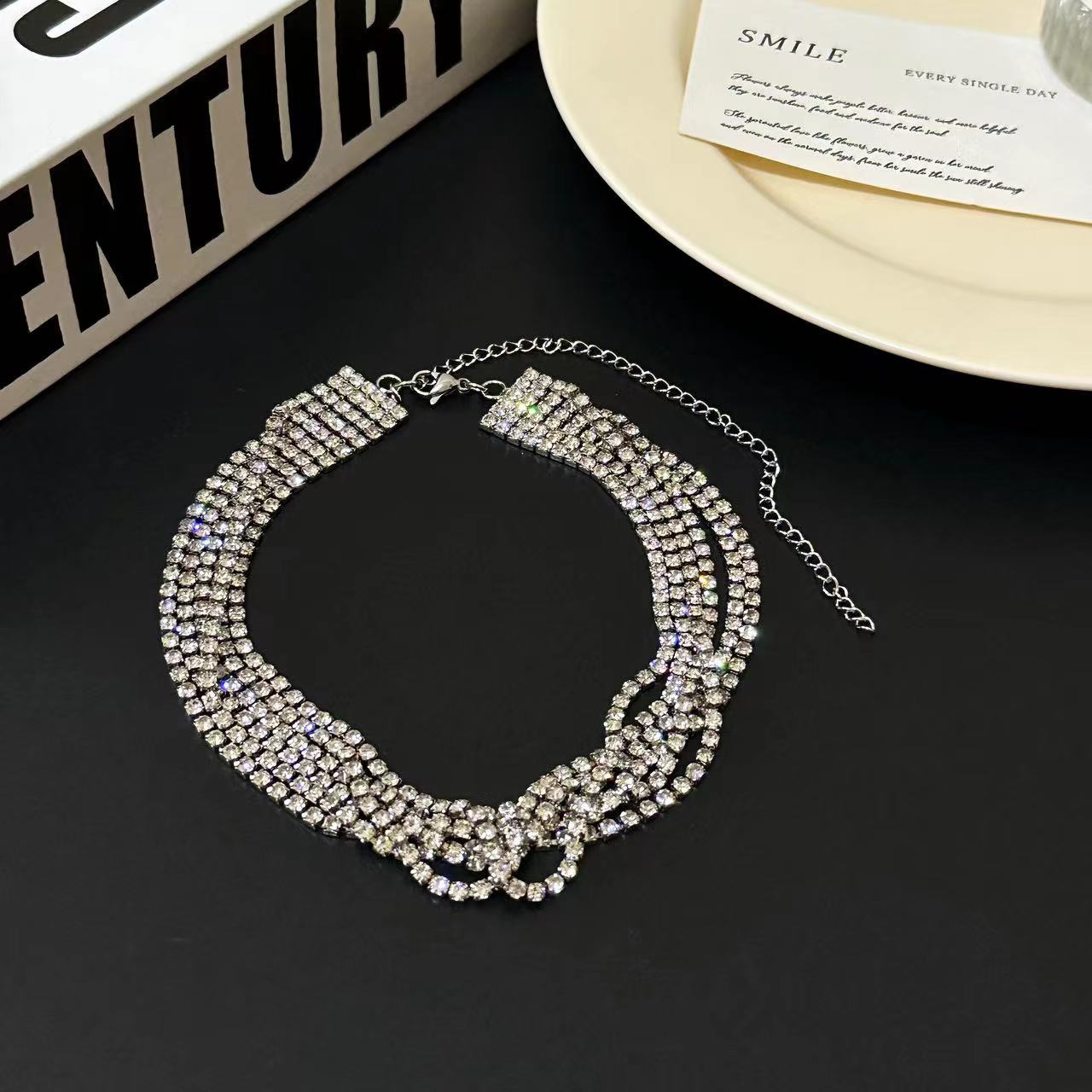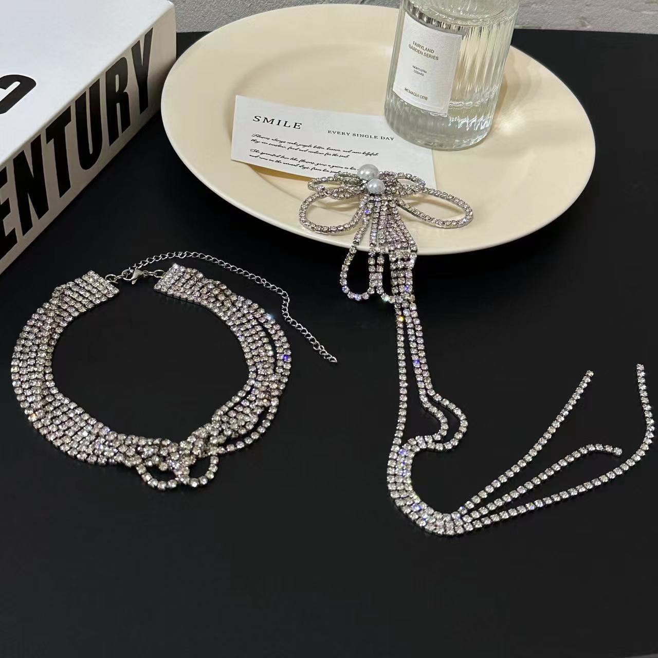 Collar multiusos con lazo de diamantes de lujo francés ligero para mujer, elegante cadena de clavícula de nicho, collar de moda de alta gama.