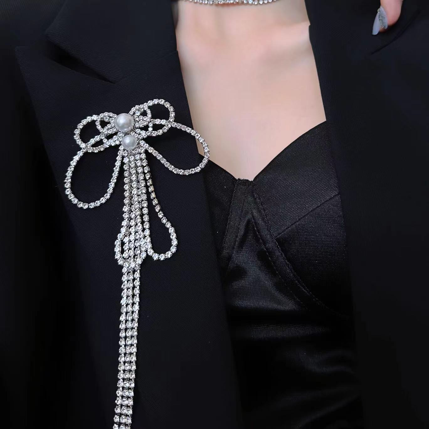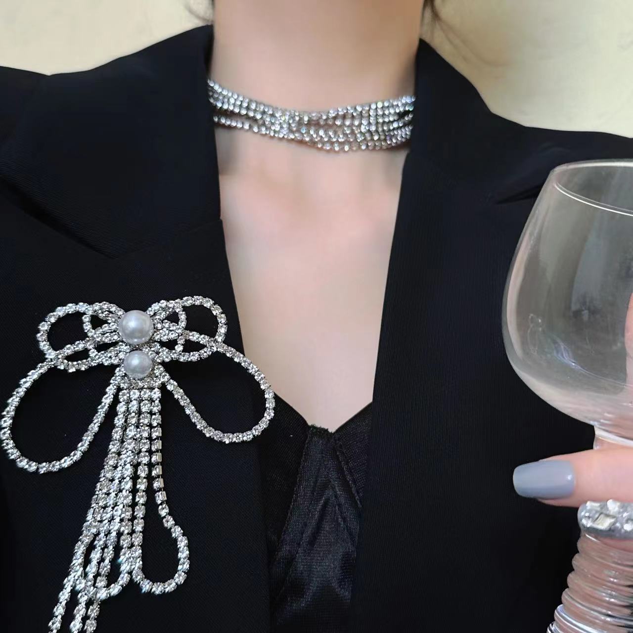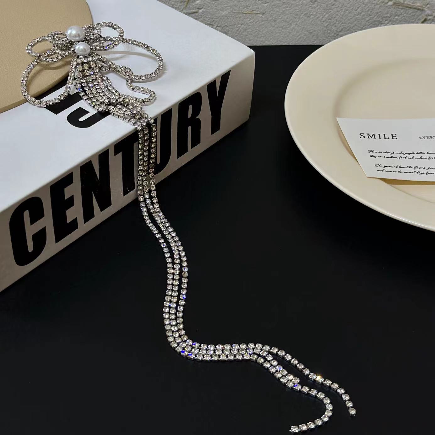 Collar multiusos con lazo de diamantes de lujo francés ligero para mujer, elegante cadena de clavícula de nicho, collar de moda de alta gama.