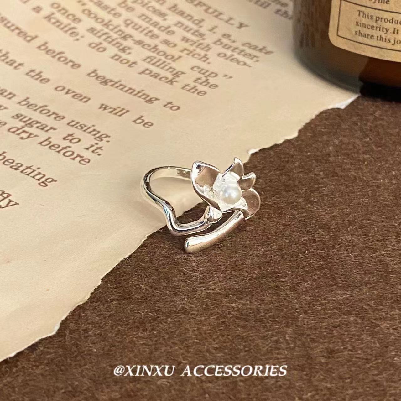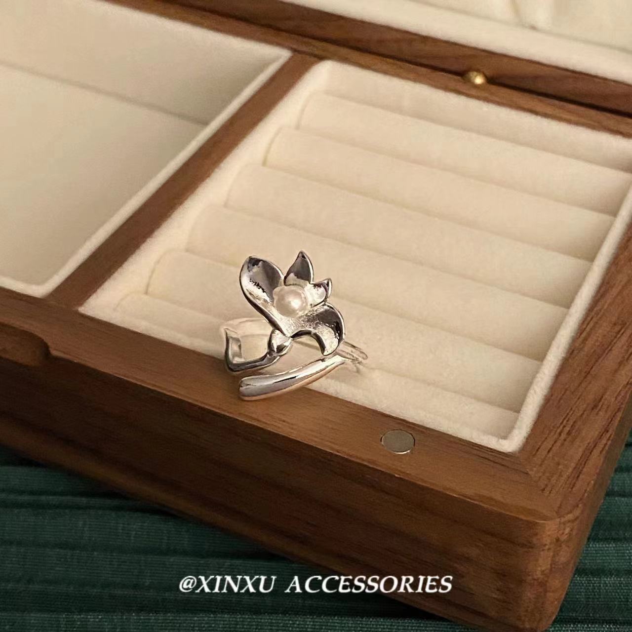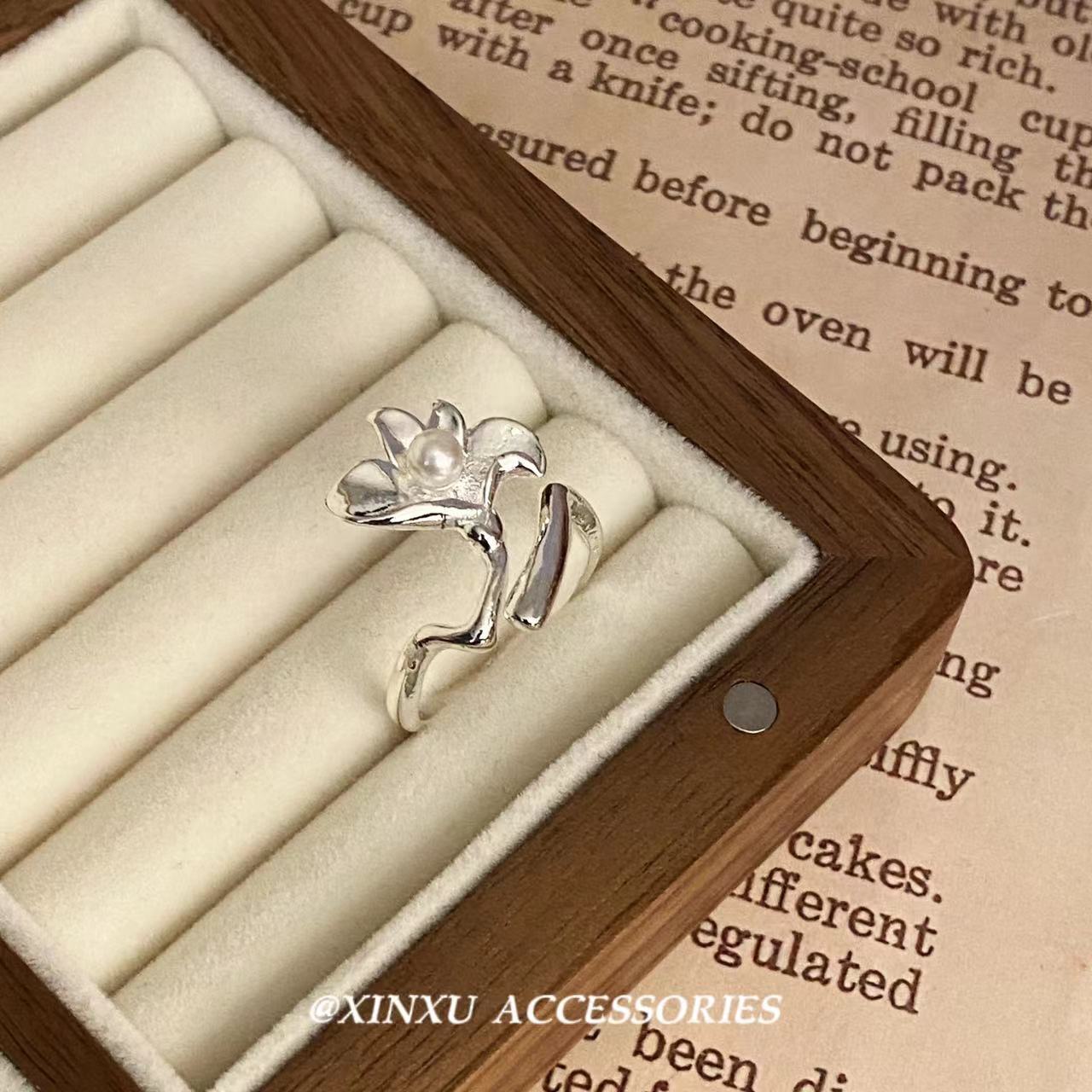 Anillo abierto de magnolia de estilo moderno, nuevo diseño de nicho chino, temperamento ligero, lujo, alta gama, anillo combinable, ajustable.