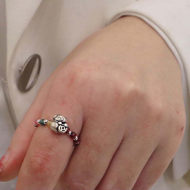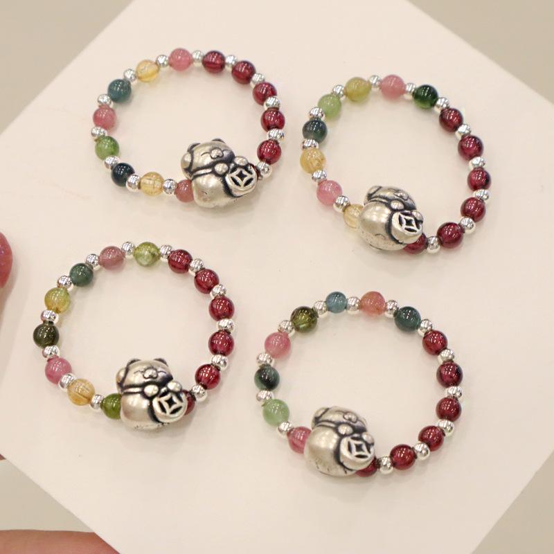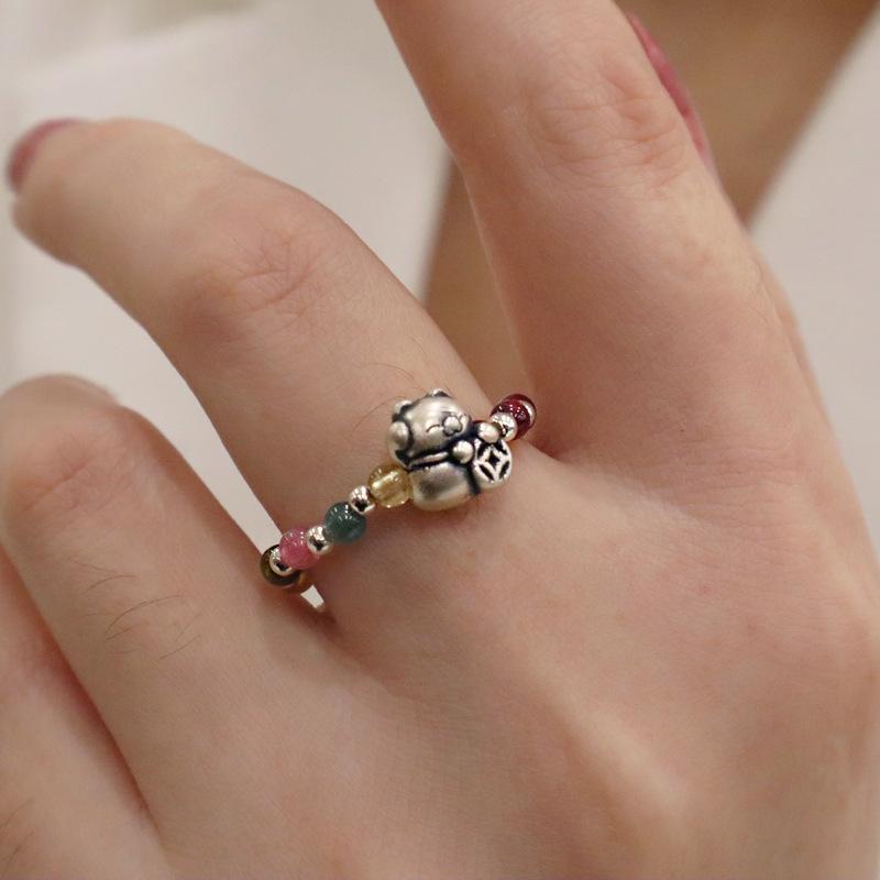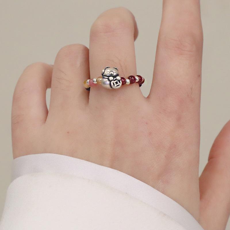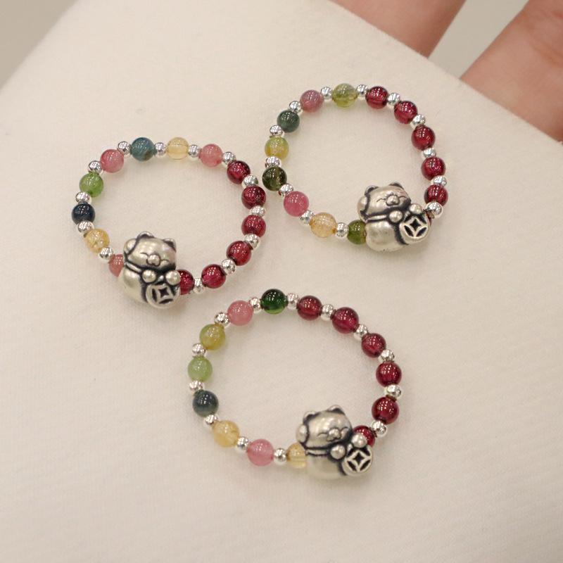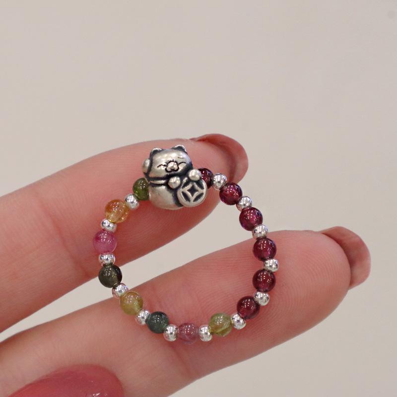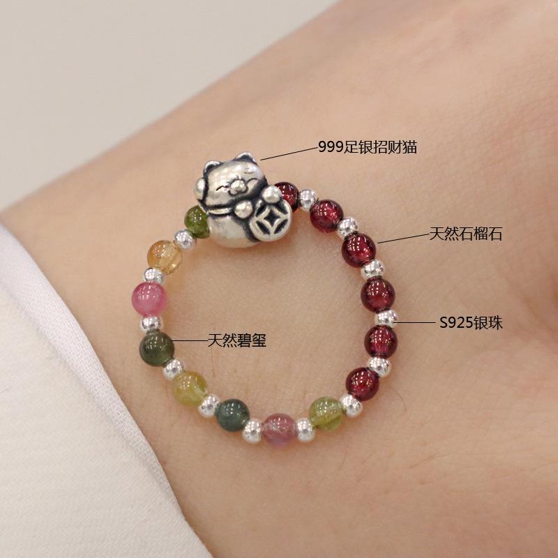 Anillo de Turmalina Granate Natural Plata 999 Dinero Gato de la Suerte Elástico Accesorios para Mujer Cuentas de Plata