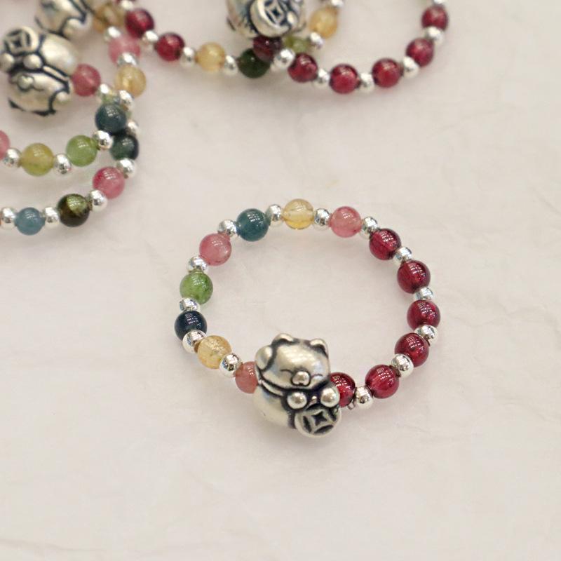 Tourmaline Garnet 999 Silver Lucky Cat Ring