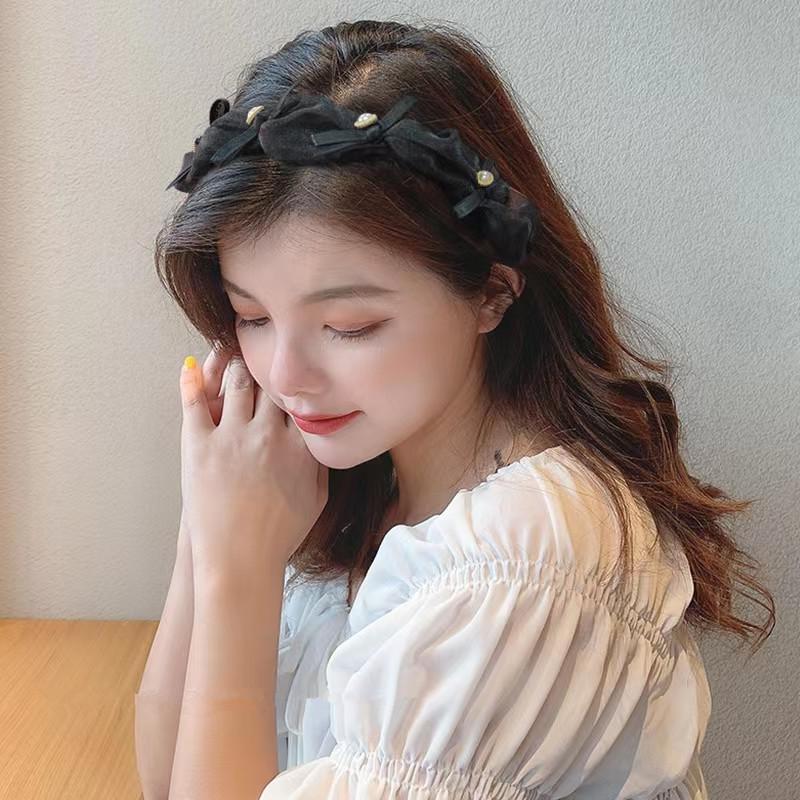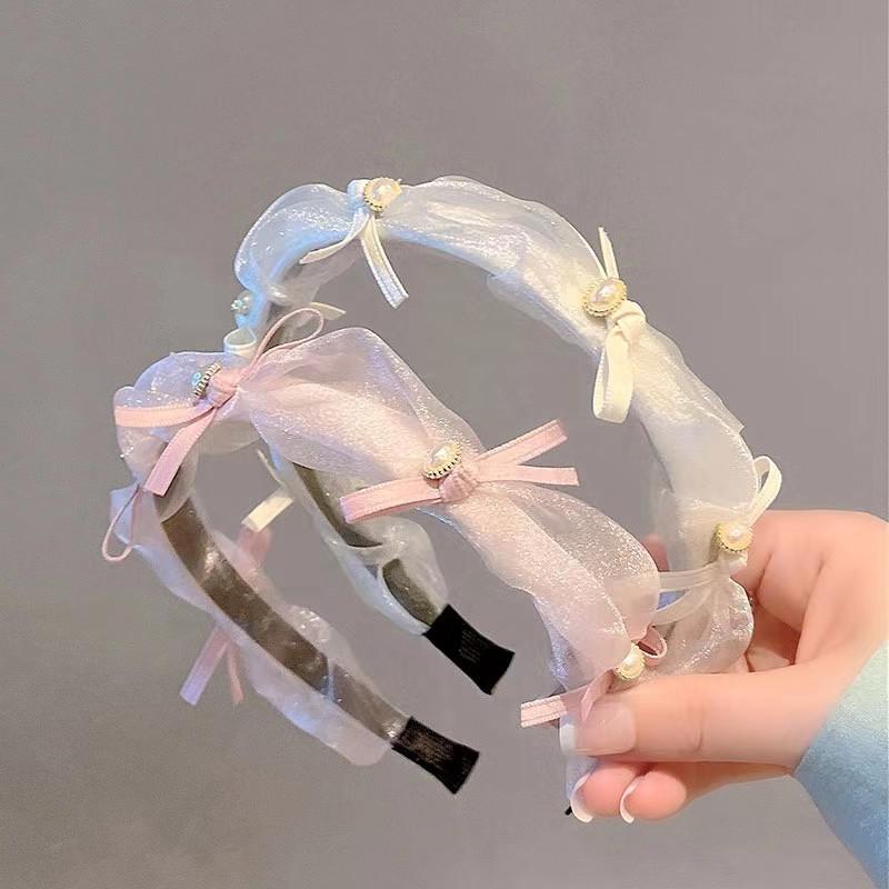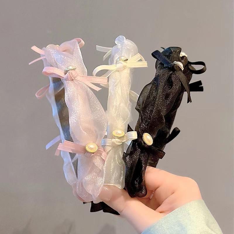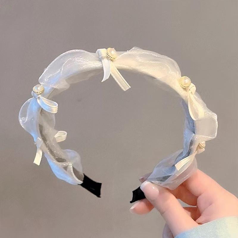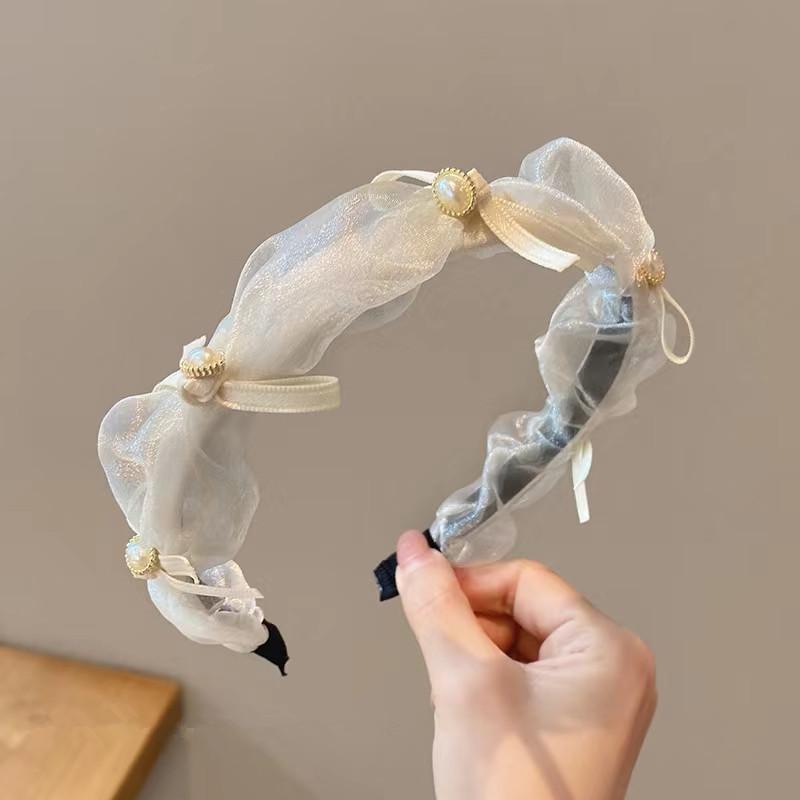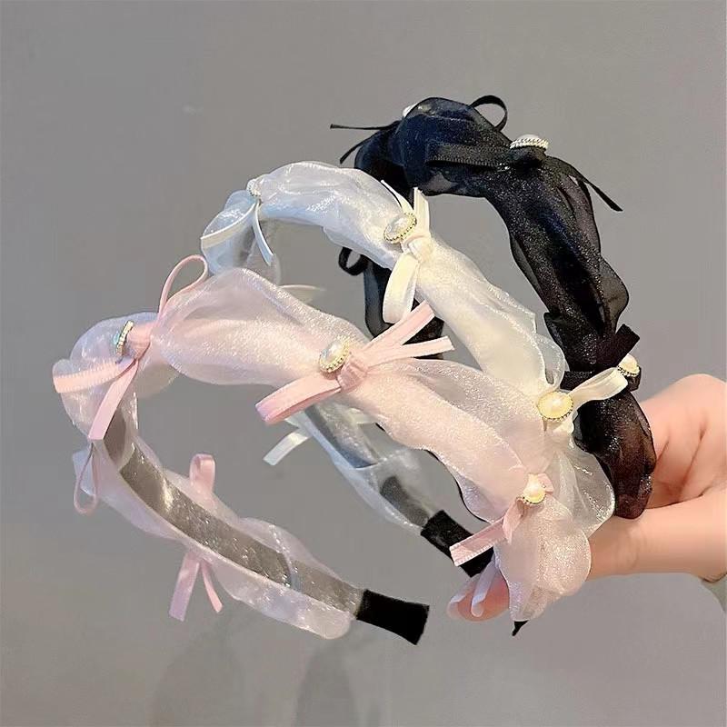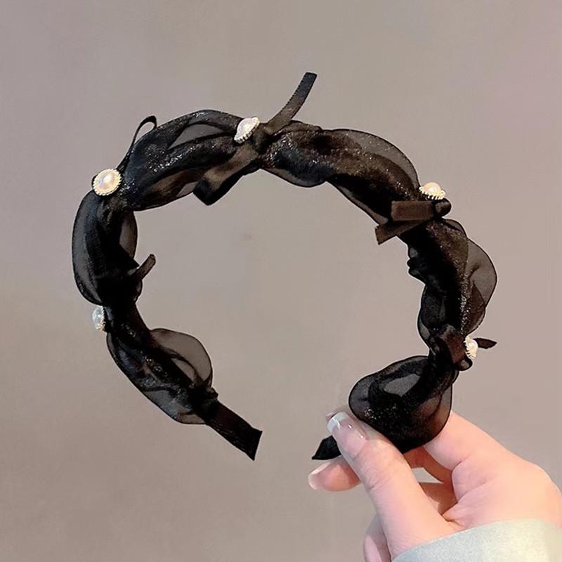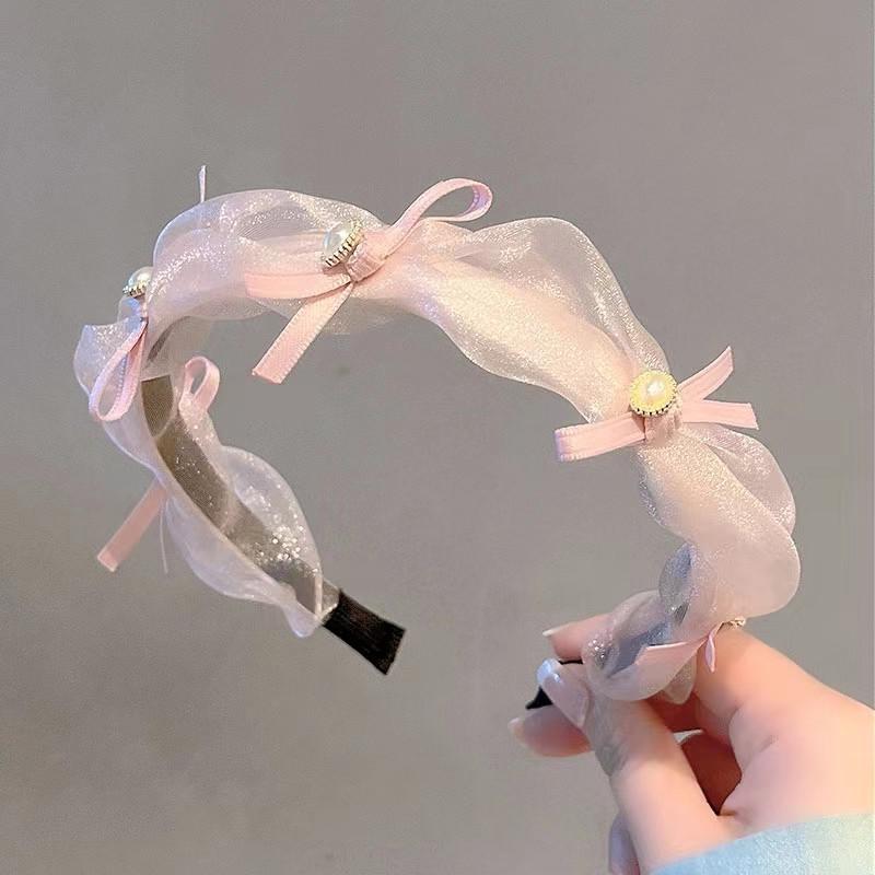 Diadema de malla con lazo de perla para mujer, estilo coreano, bonita y dulce, estilo vintage francés.