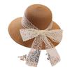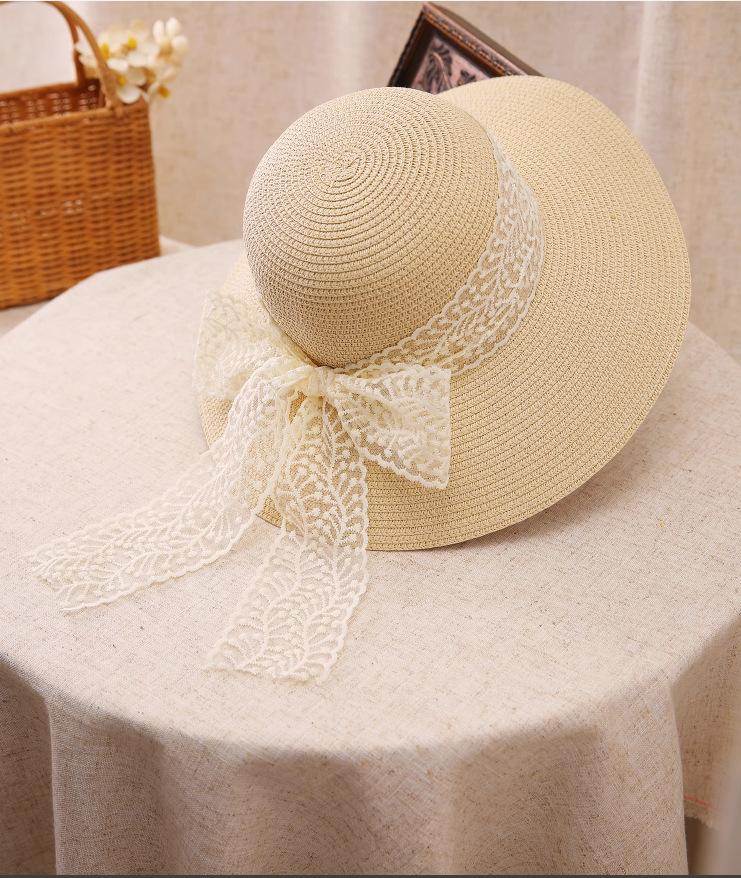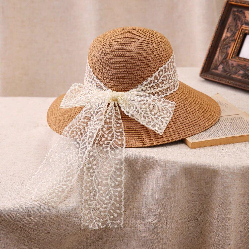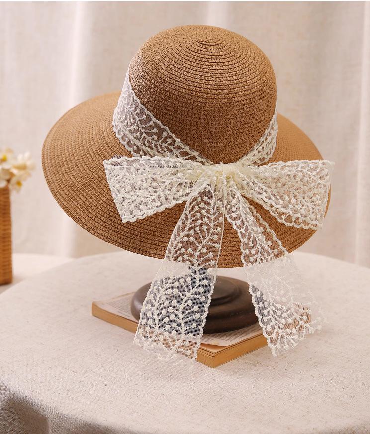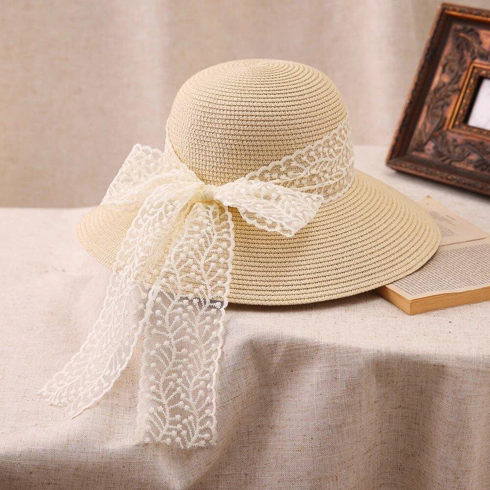 YT lace bow hat-beige, YT Lace Bow Straw Hat-Khaki