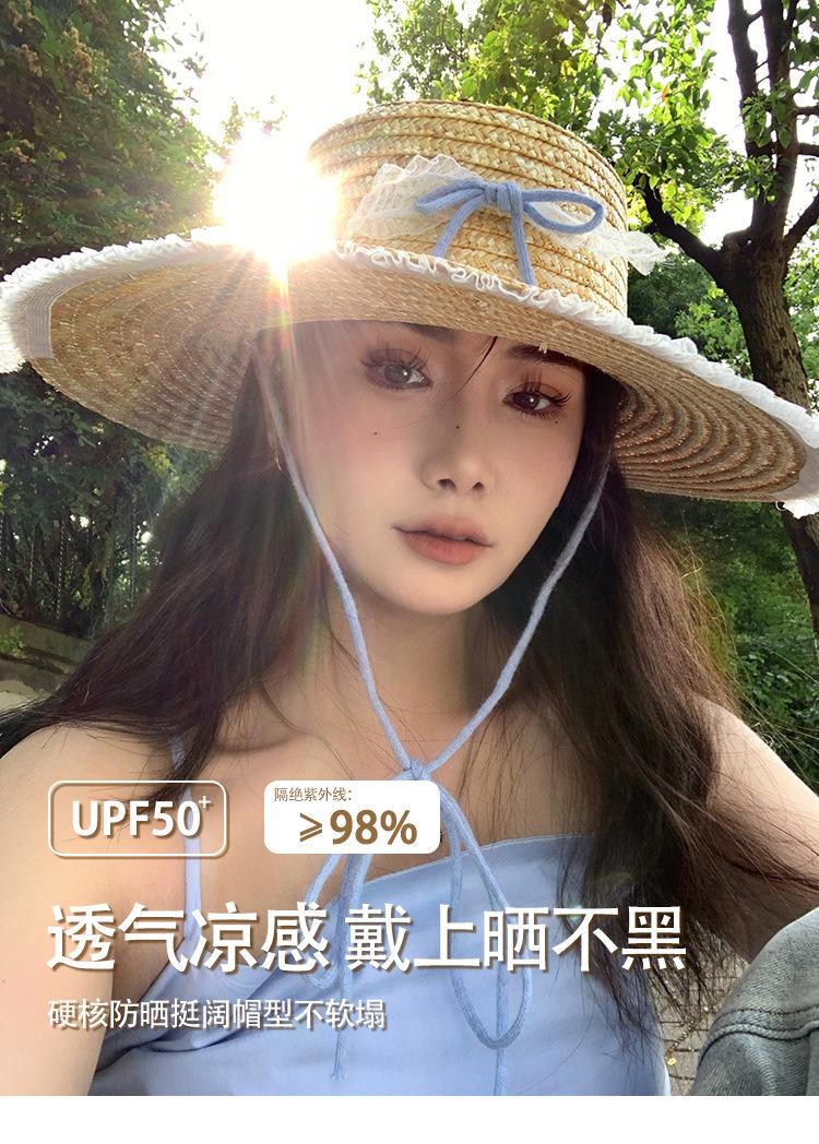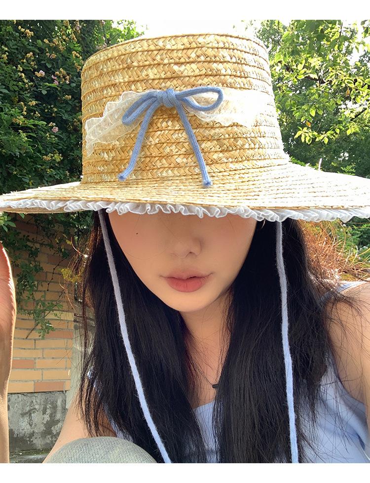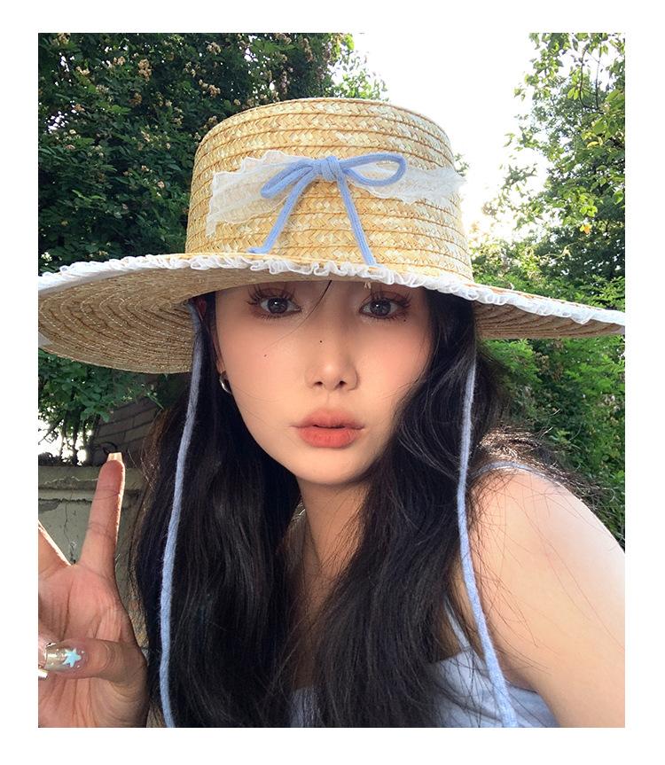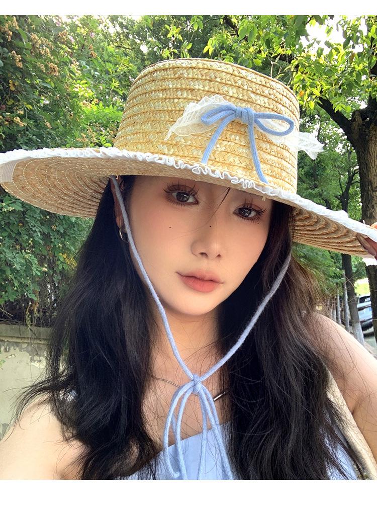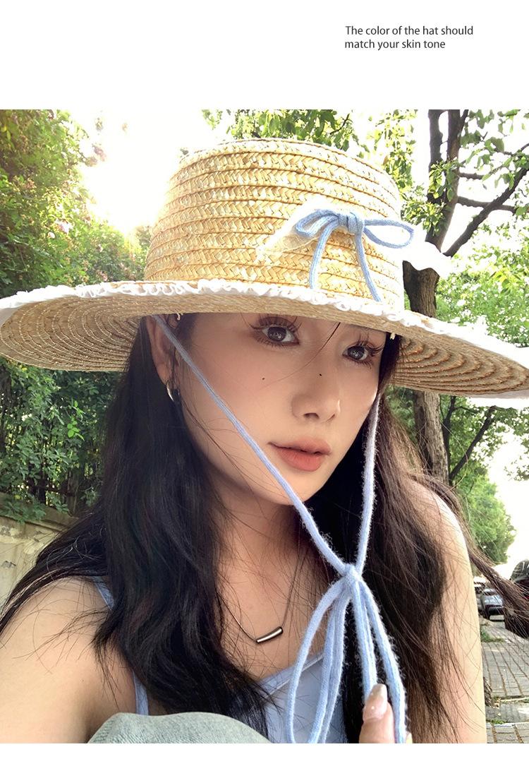 Sombrero de Paja con Encaje de Lazo Francés para Viajes de Verano y Vacaciones Marítimas Sombrero de Protección Solar Sombrero de Paja de Ala Ancha para el Sol