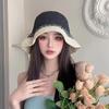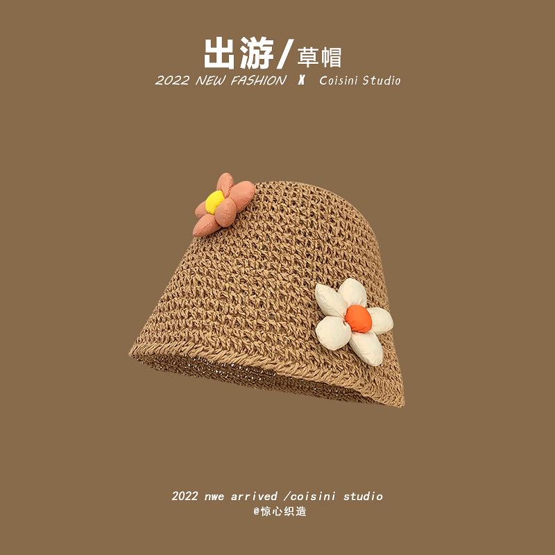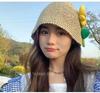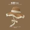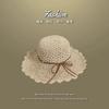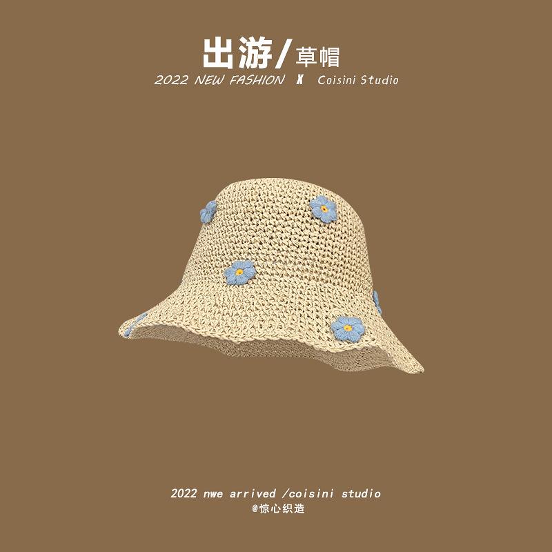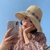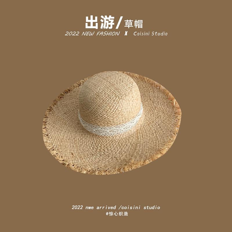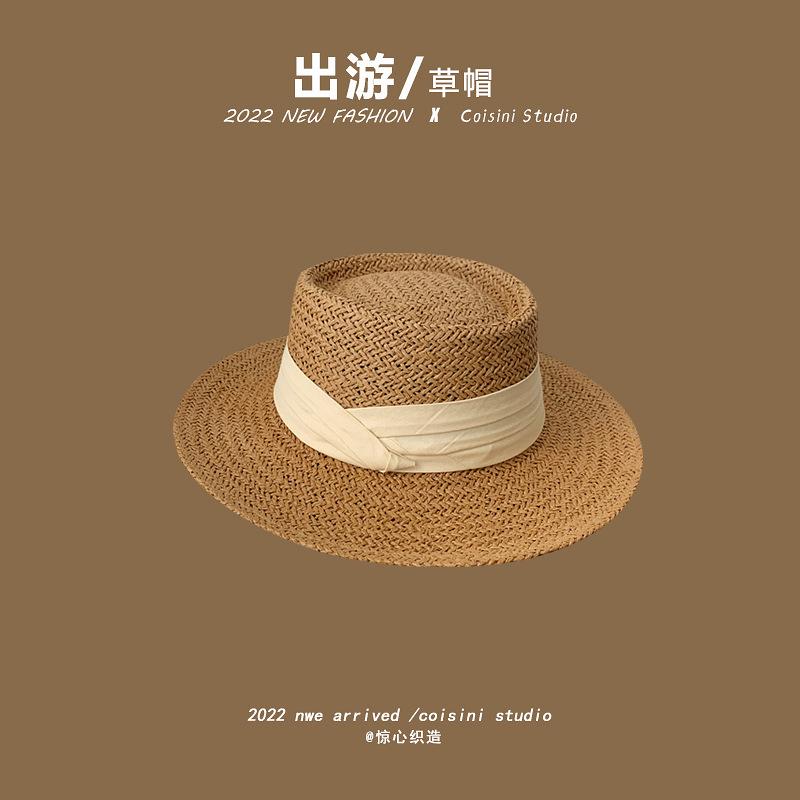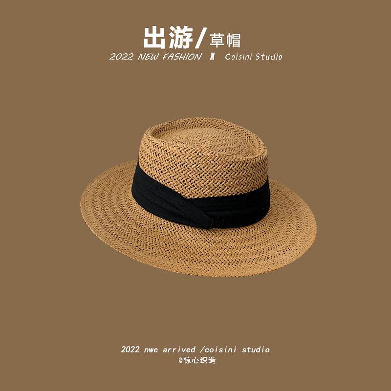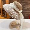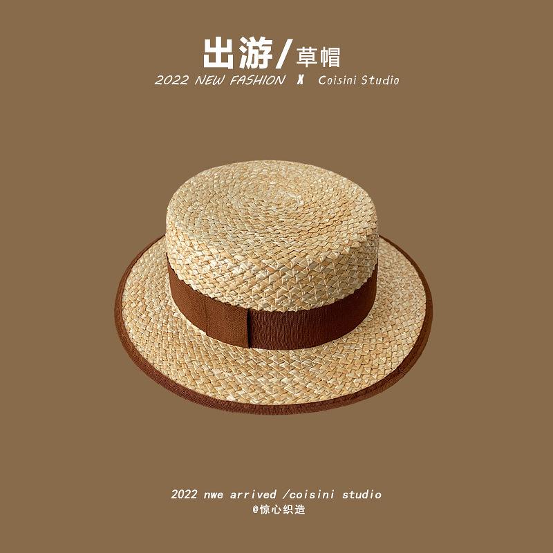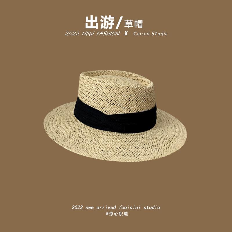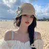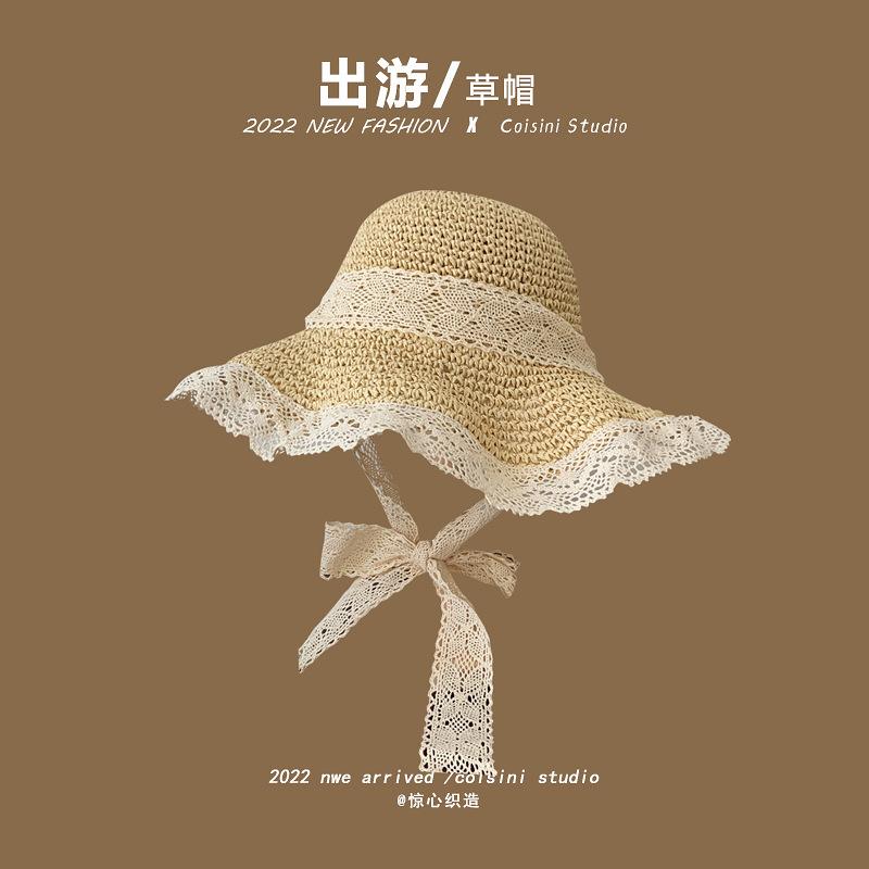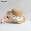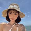 Sombrero de paja con encaje de flores y perlas estilo japonés para mujer, sombrero de copa plana para viaje de primavera y verano.