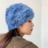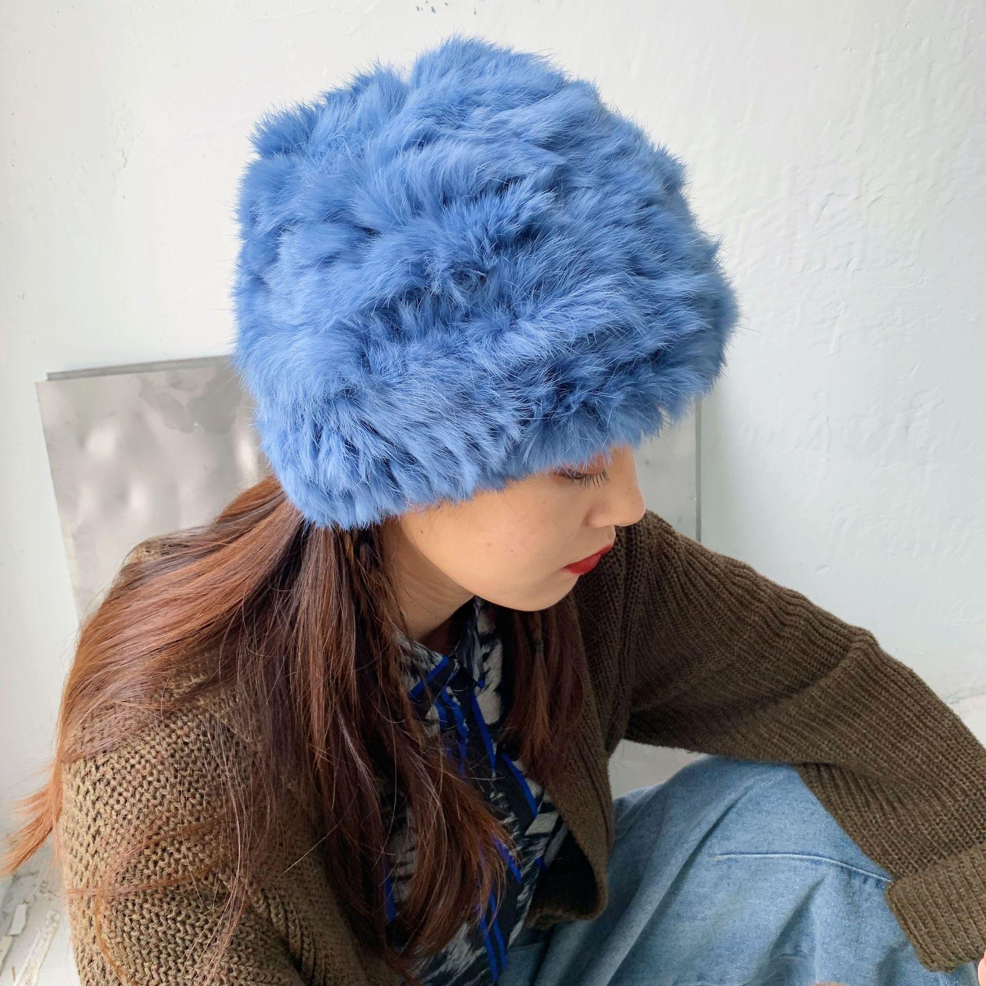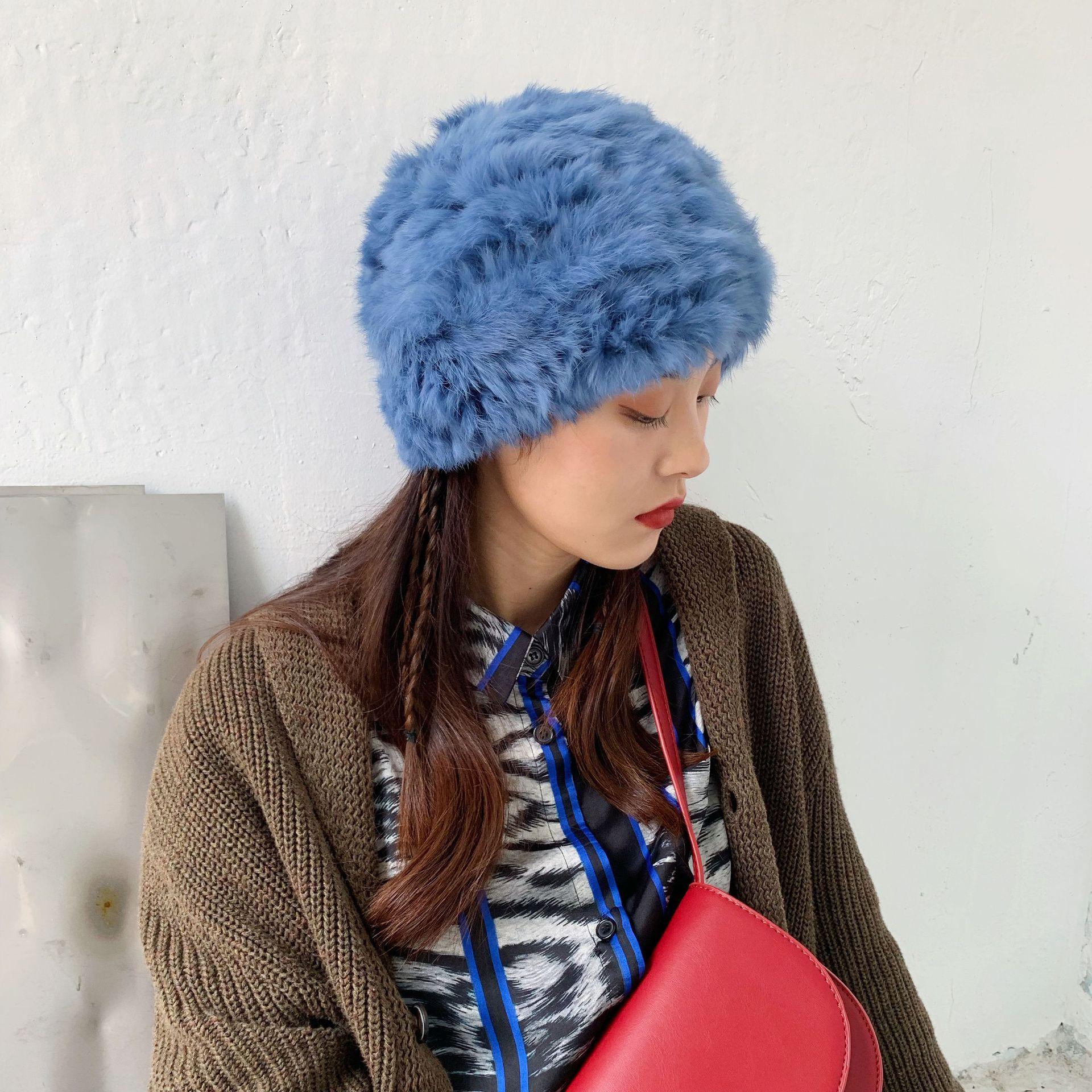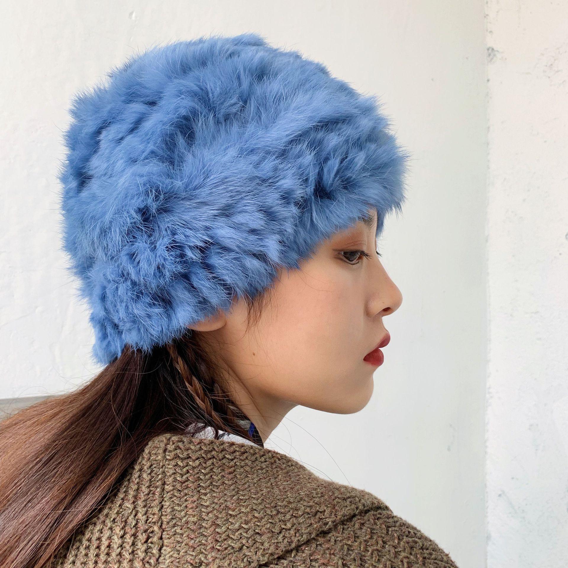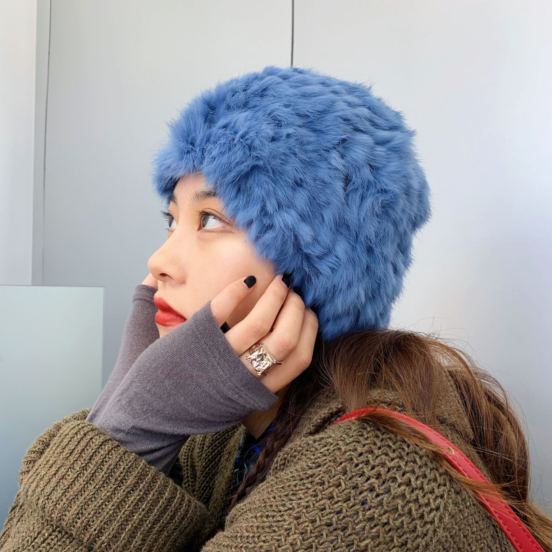 Gorro de piel de conejo auténtico antiguo tejido a mano para mujer, gorro de lana cálido con orejas, gorro de punto, moda de otoño e invierno.