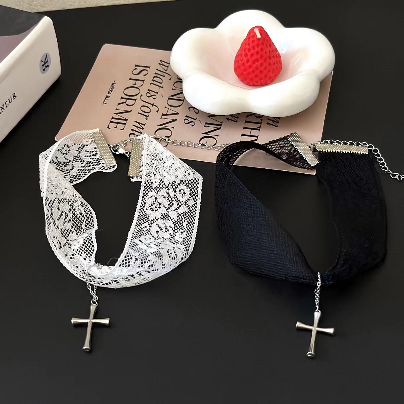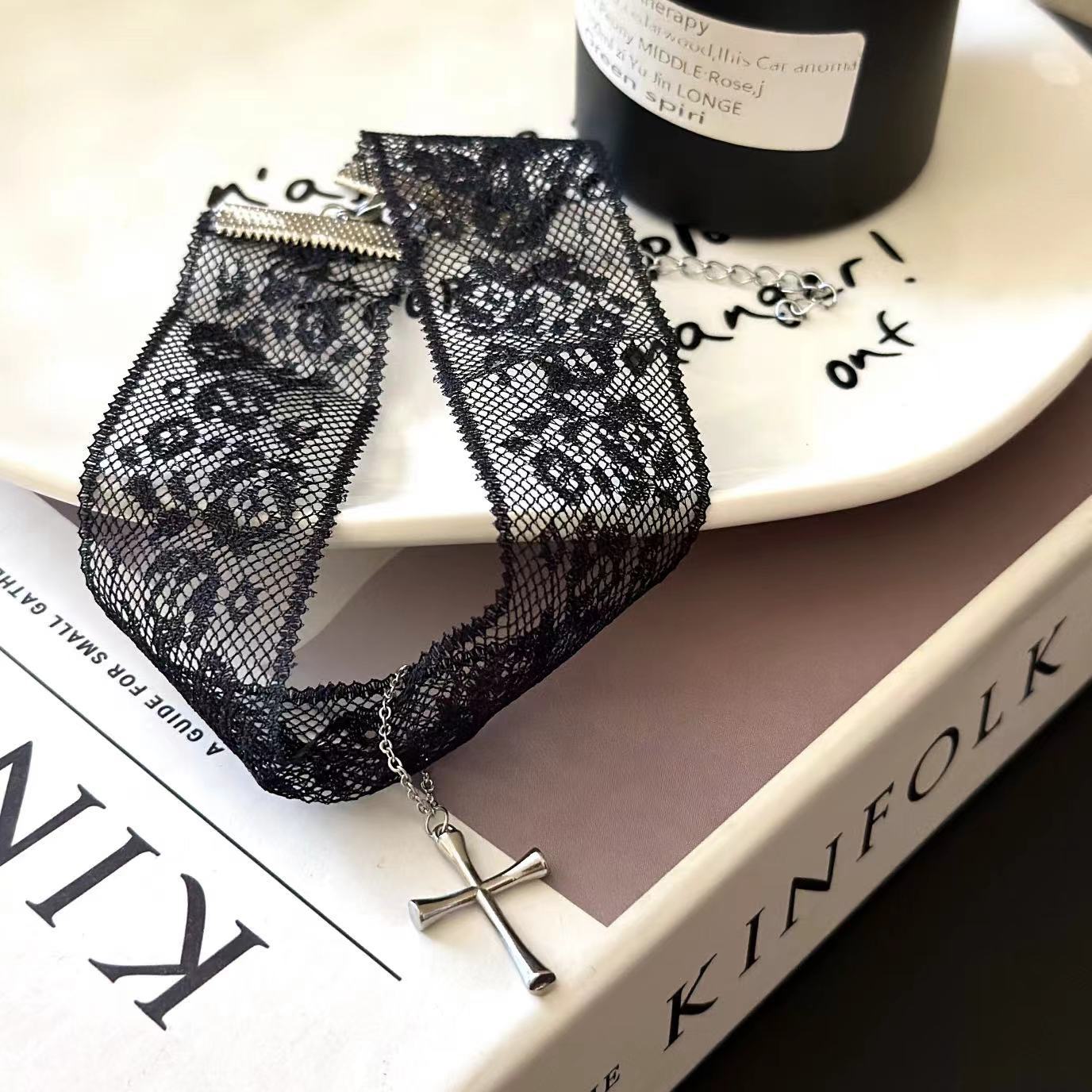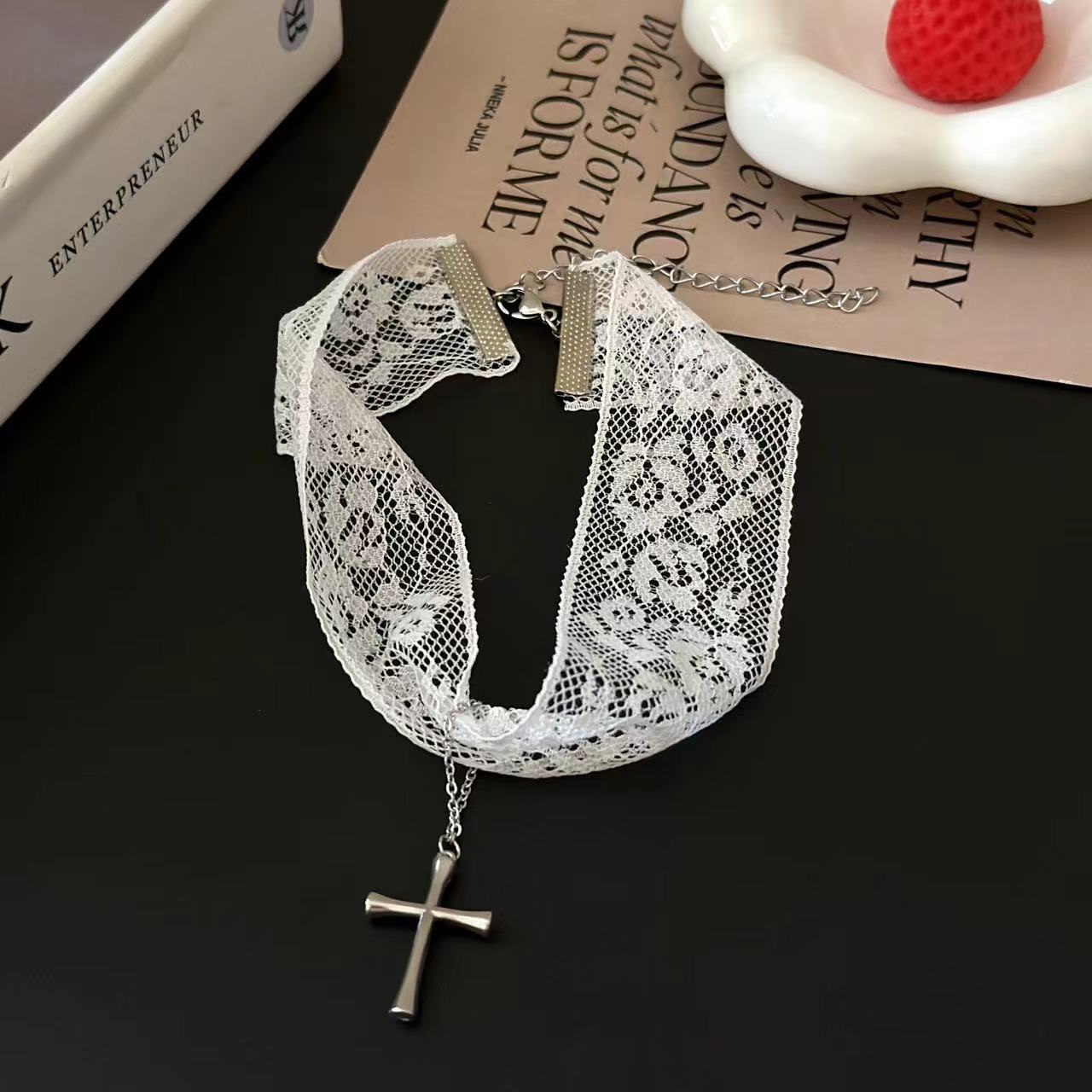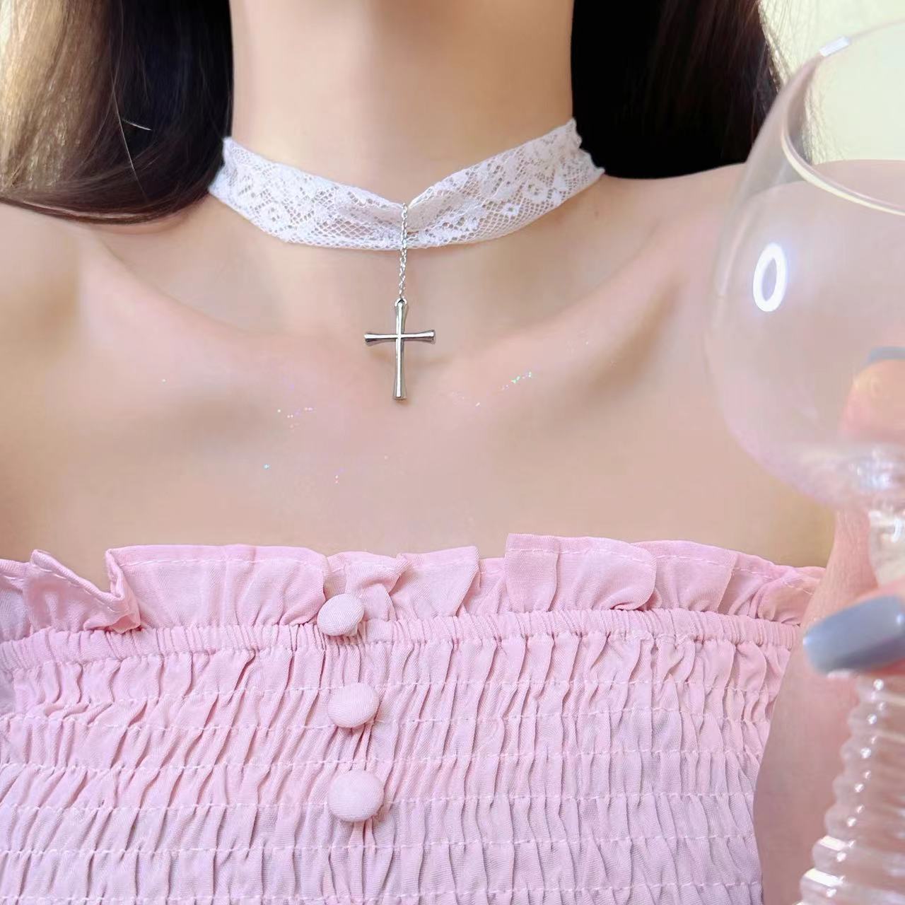 Elegante collar con colgante de cruz y encaje de hada francesa, estilo gargantilla, elegante y femenino, con un dulce y fresco viento.