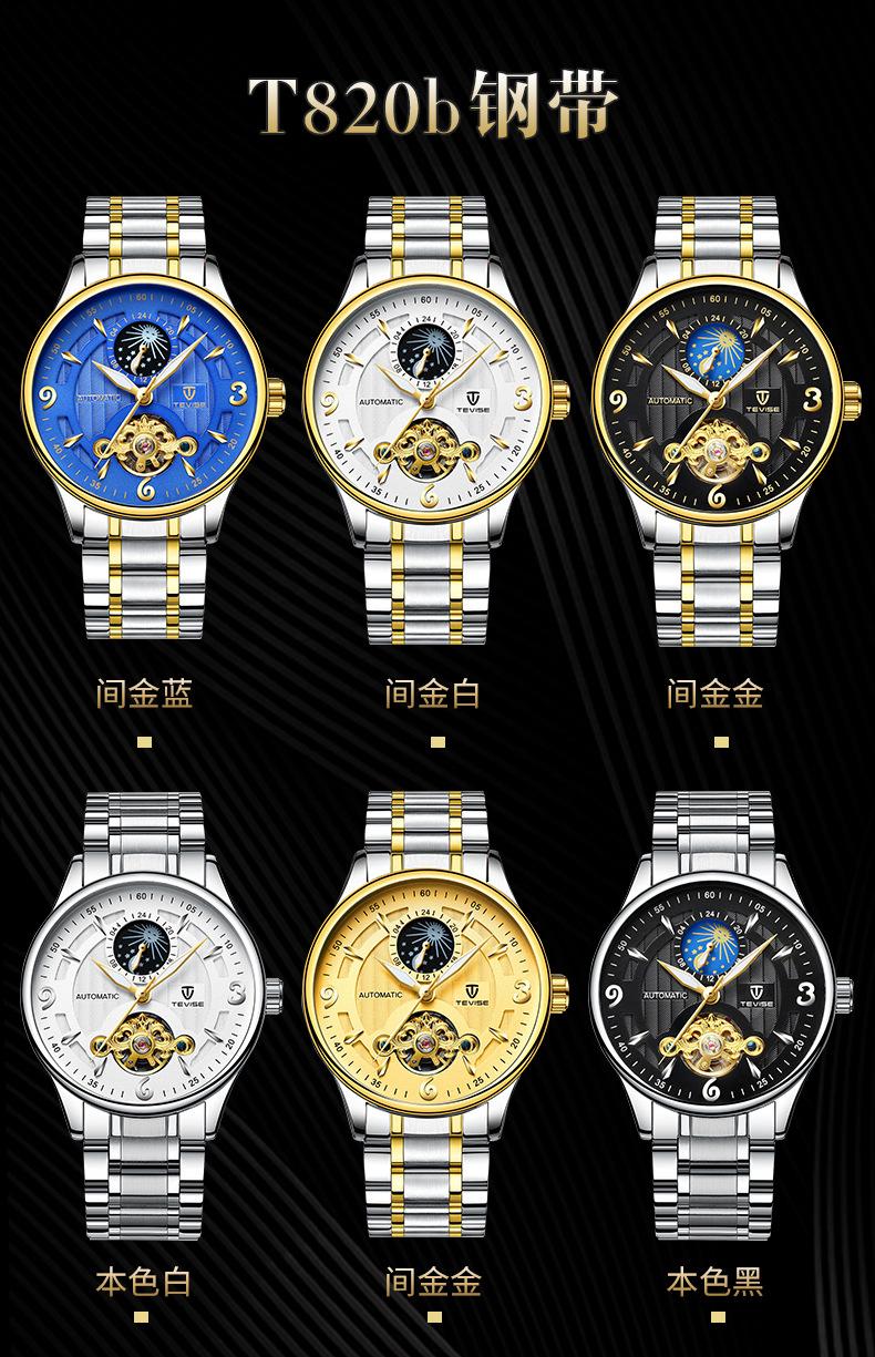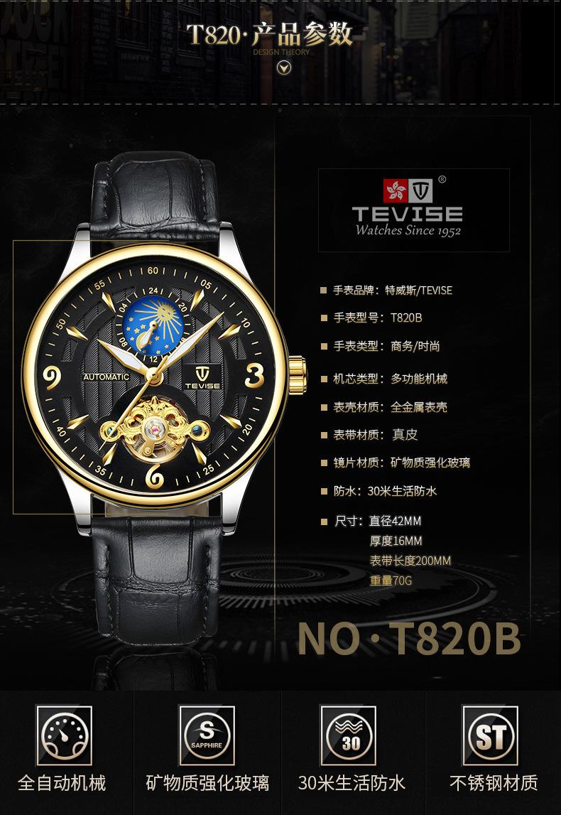 Reloj Mecánico Automático Suizo Tevise Fase Lunar Tourbillon para Hombre Reloj Casual Impermeable Modelo Clásico