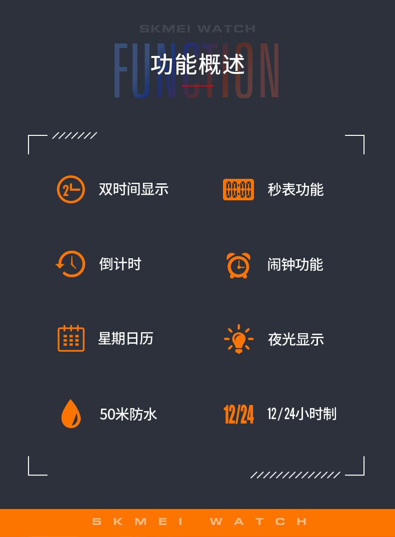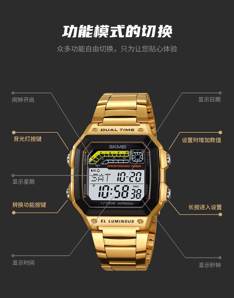 2 Time, stopwatch timing, date, timing noise, week, EL luminous hour, 12/24 hour system, countdown.