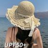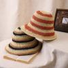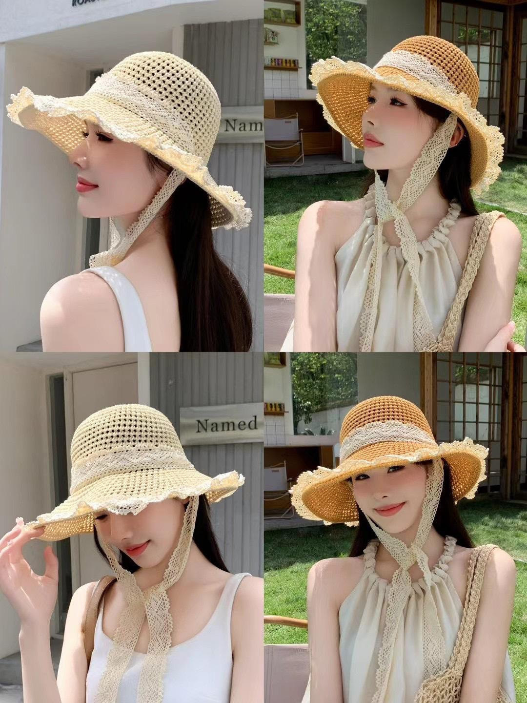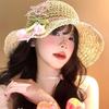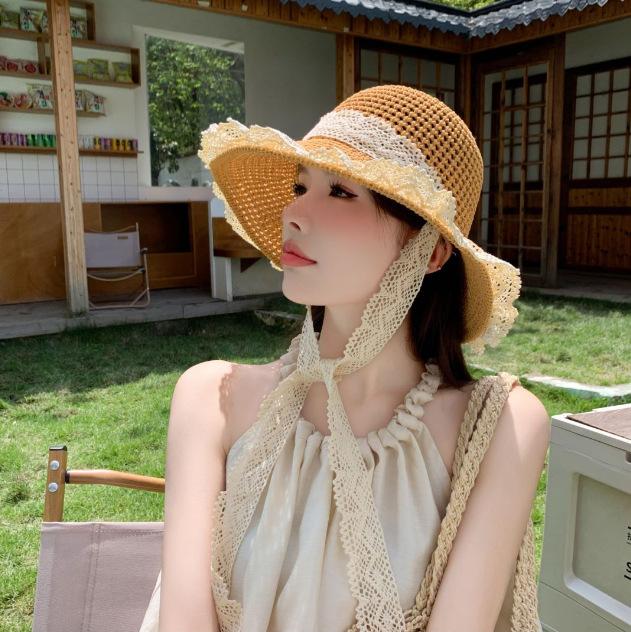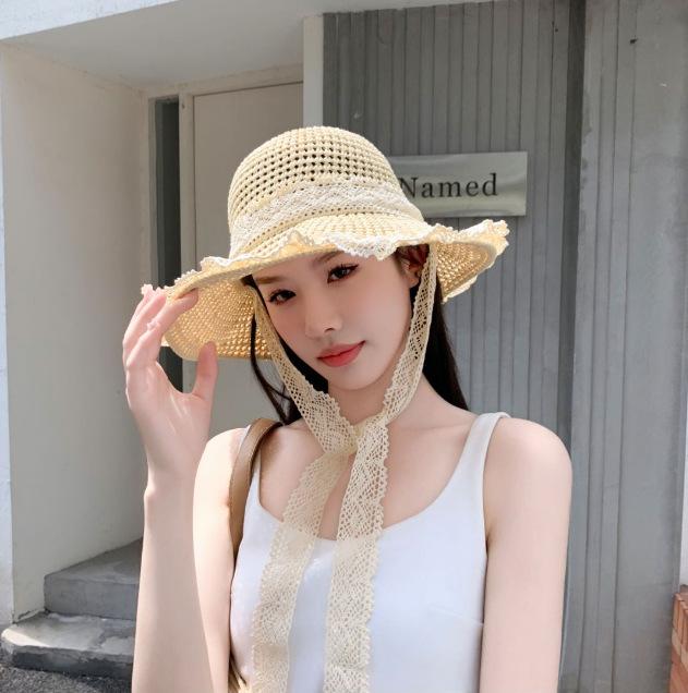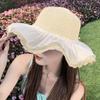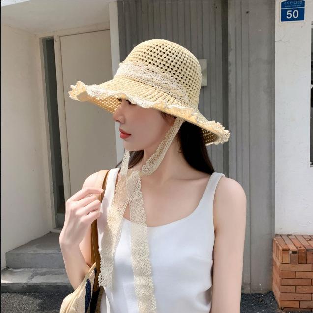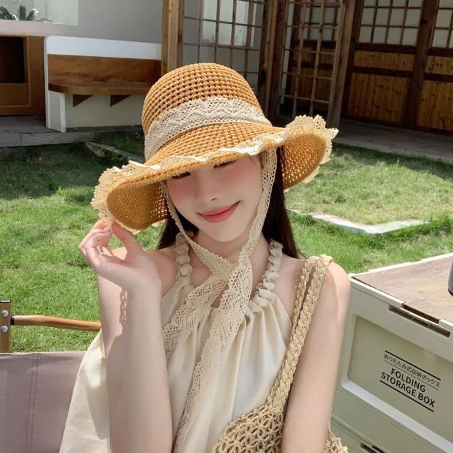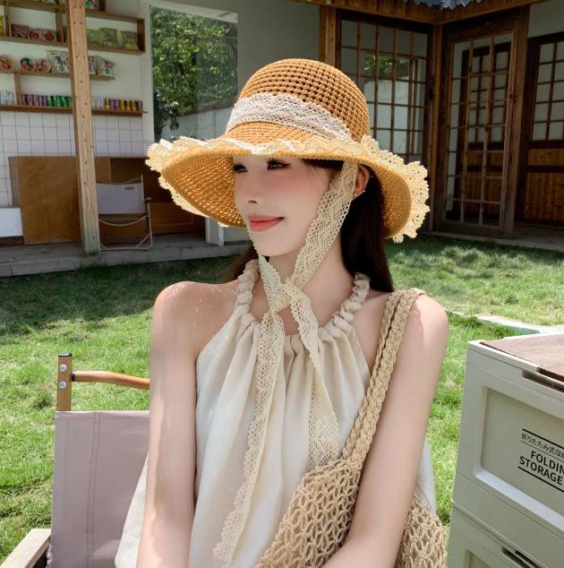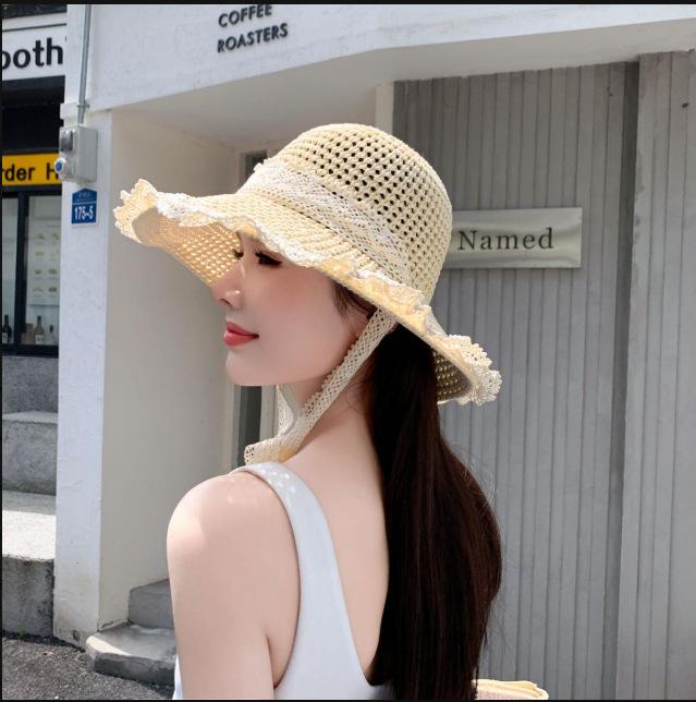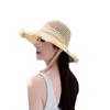 Sombrero de Cubo de Paja Transpirable con Cordones para Mujer, Sombrero de Paja de Playa Marítima de Verano para Exterior, Sombrero para el Sol, Ala Ancha Pastoral