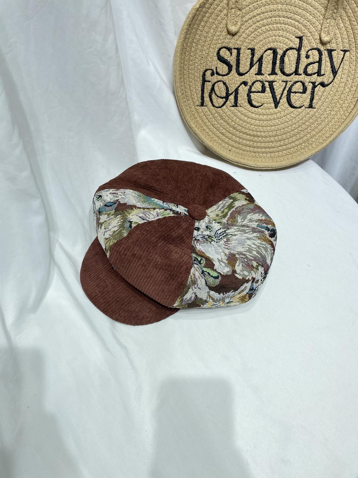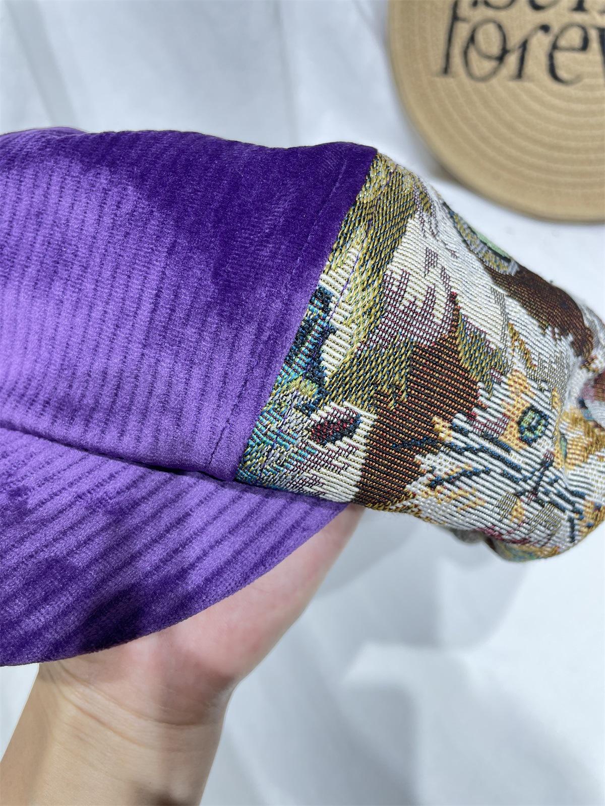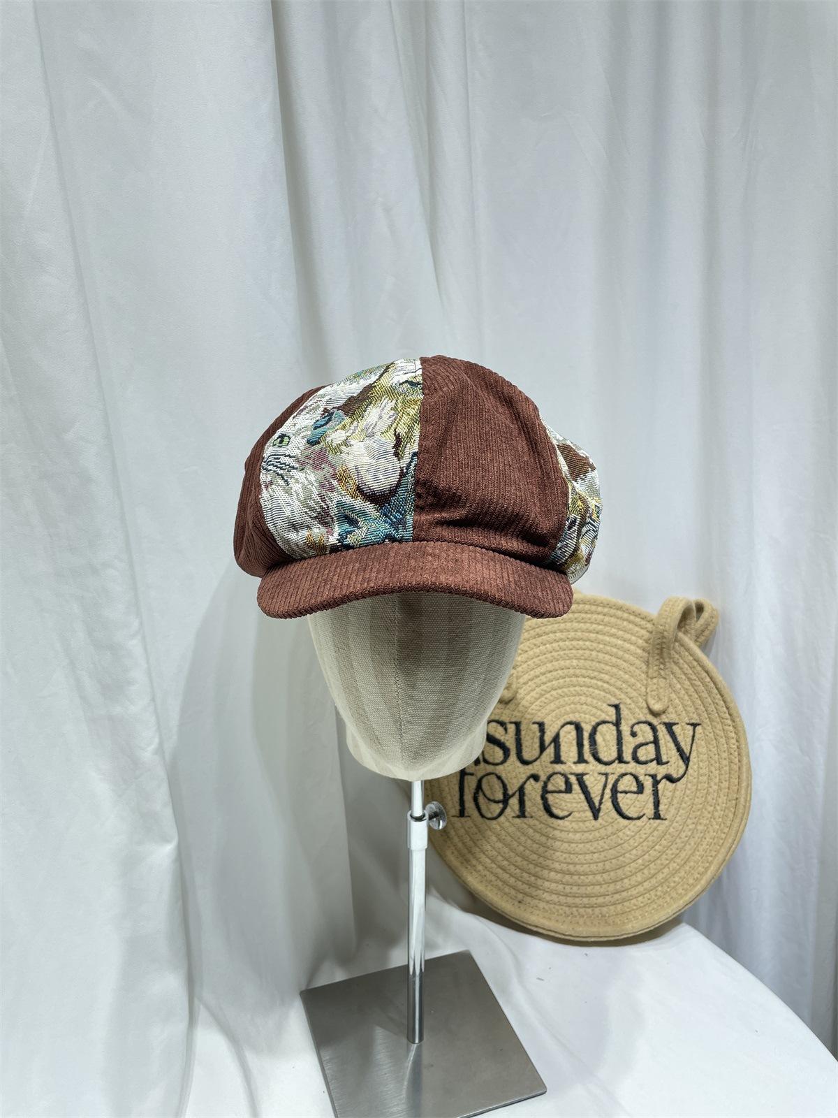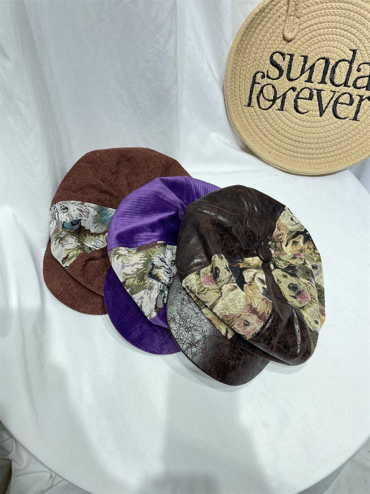 Boina de pana con costuras jacquard de cachorro retro artística para mujer, sombrero octogonal pequeño de vendedor de periódicos con aspecto de calle para otoño e invierno.