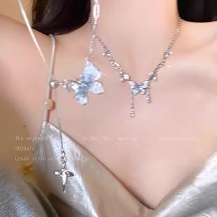 Collar de mariposa azul de doble capa de alta gama, accesorio de verano fresco, collar de clavícula de nicho de lujo ligero para mujer