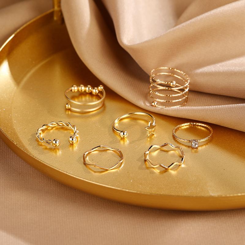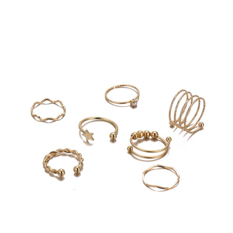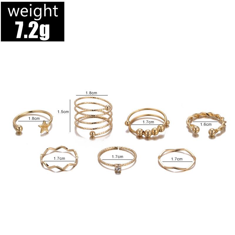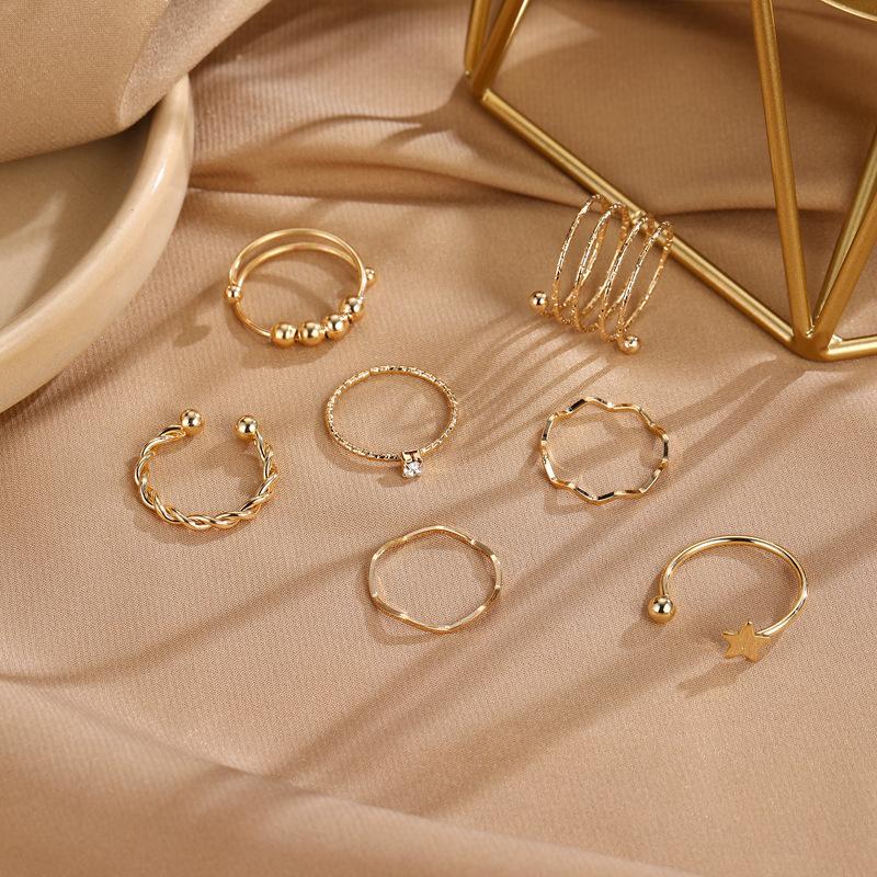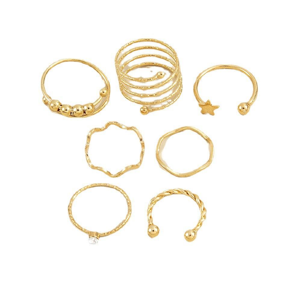 Anillo Transfronterizo de Venta Caliente Simple Geométrico Ola Resorte Estrella de Cinco Puntas Anillo de Unión con Cuentas Combinación Juego de Siete Piezas para Mujer