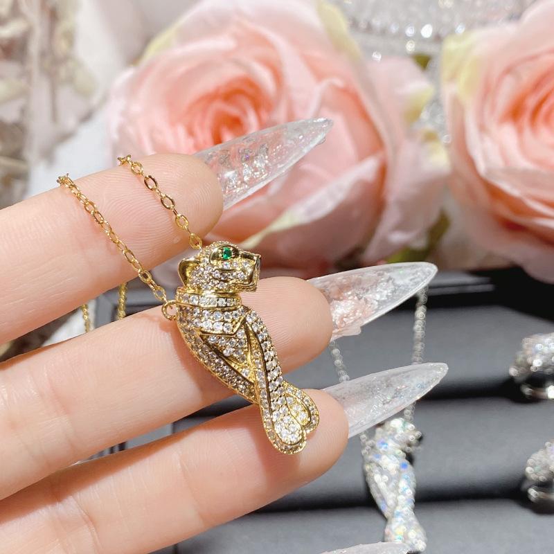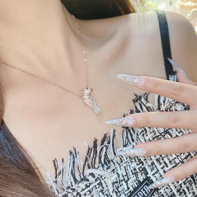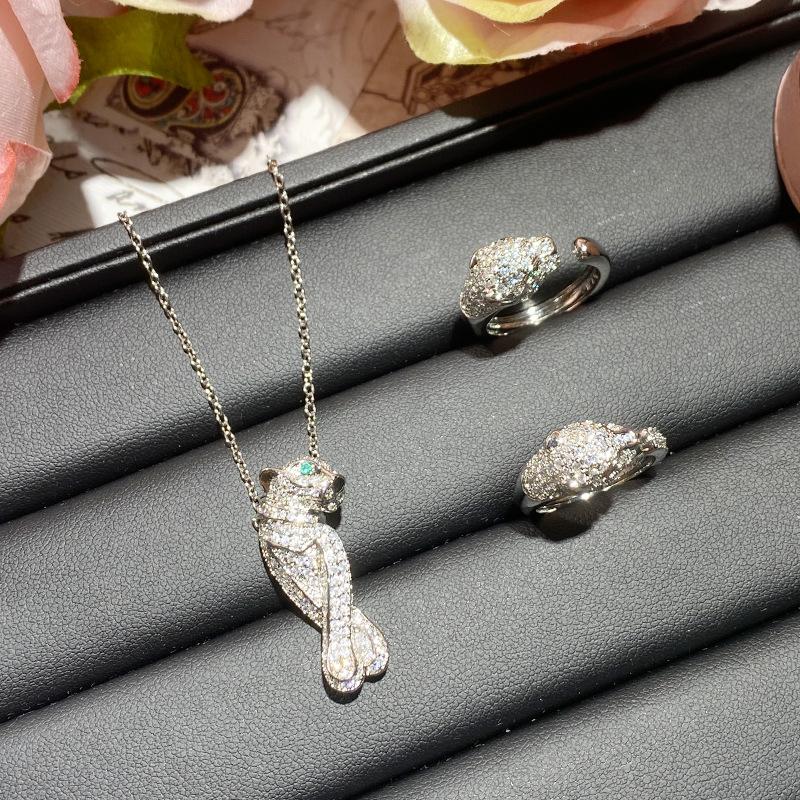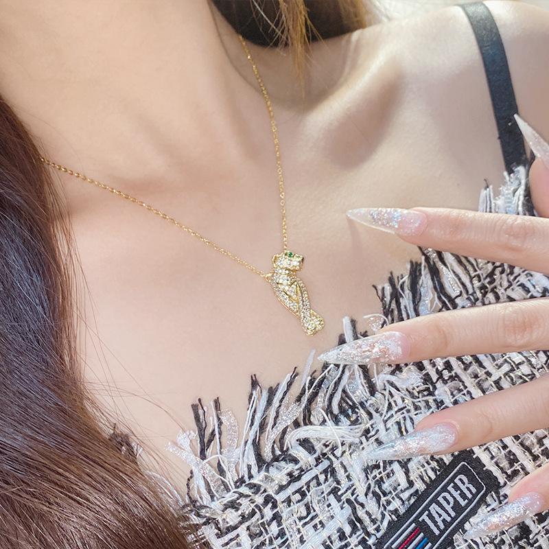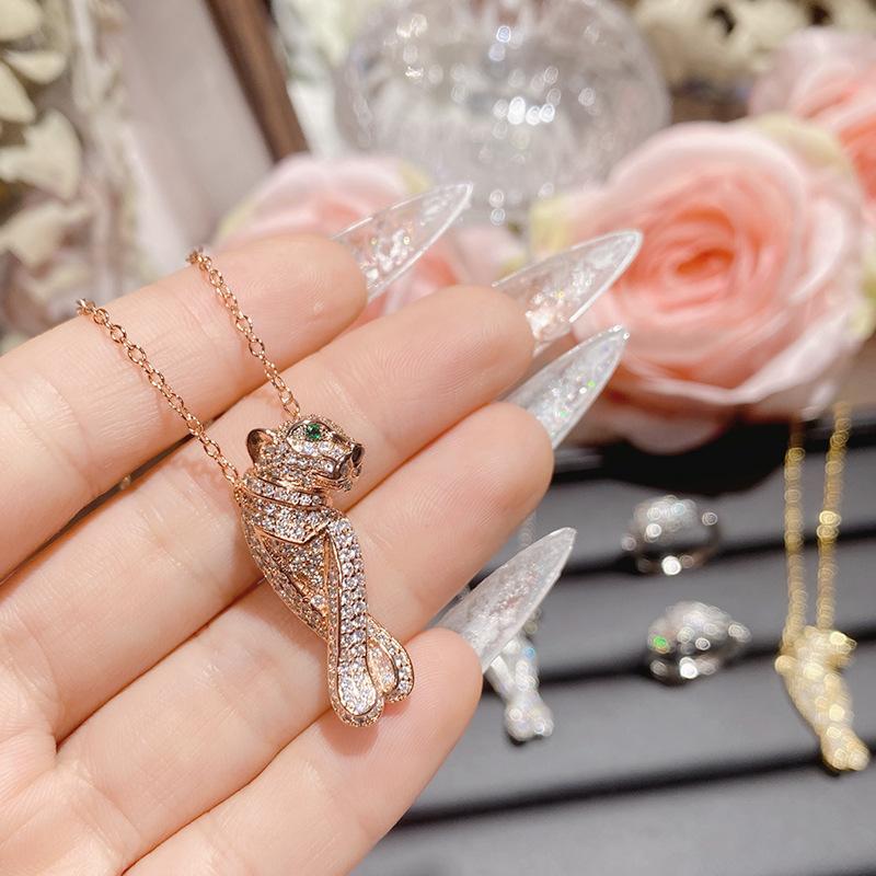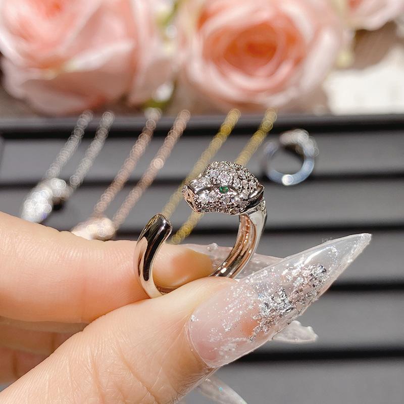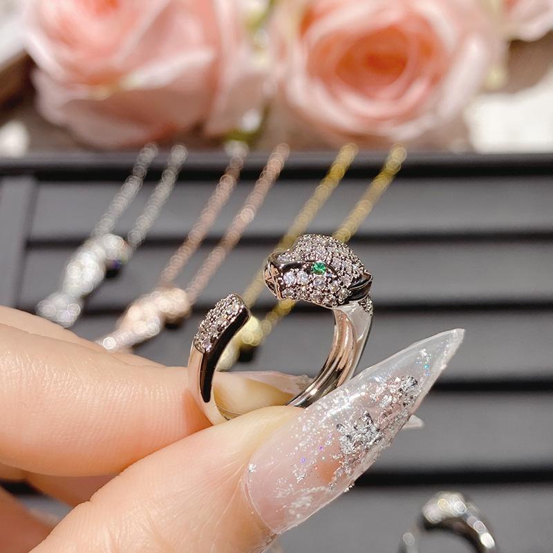 Collar con cabeza de leopardo de diamantes de marca de moda con personalidad europea y americana Camellia para hombres y mujeres, chapado en 18 quilates, anillo de cristal puntiagudo verde con incrustaciones brillantes