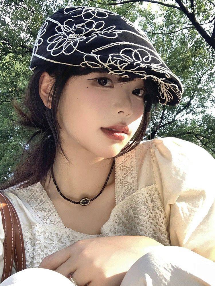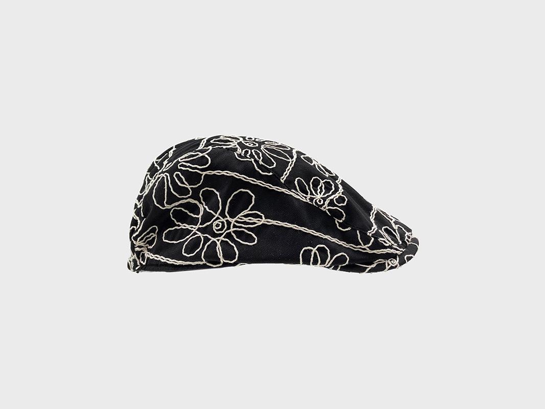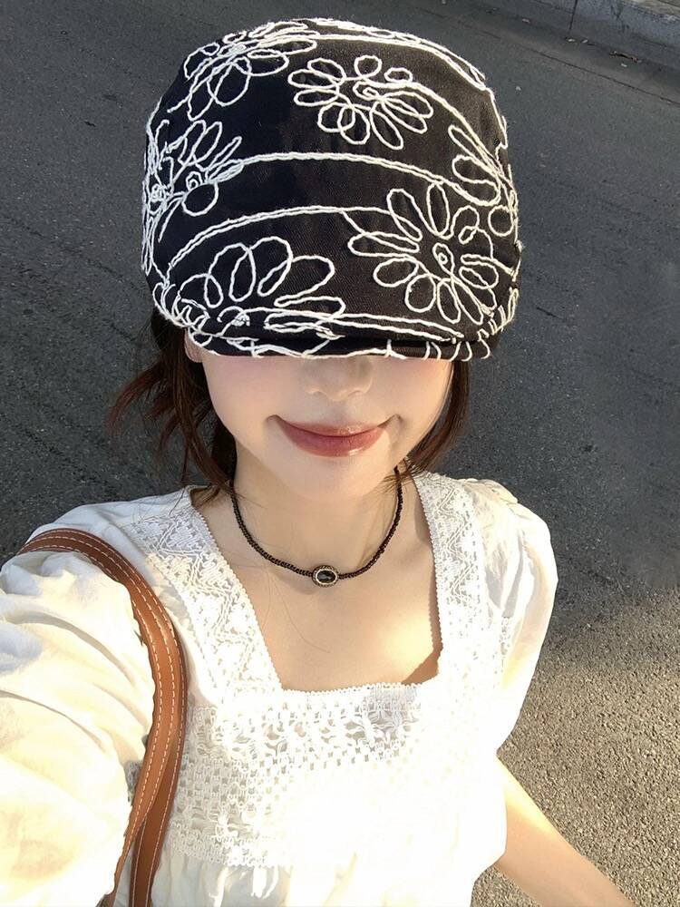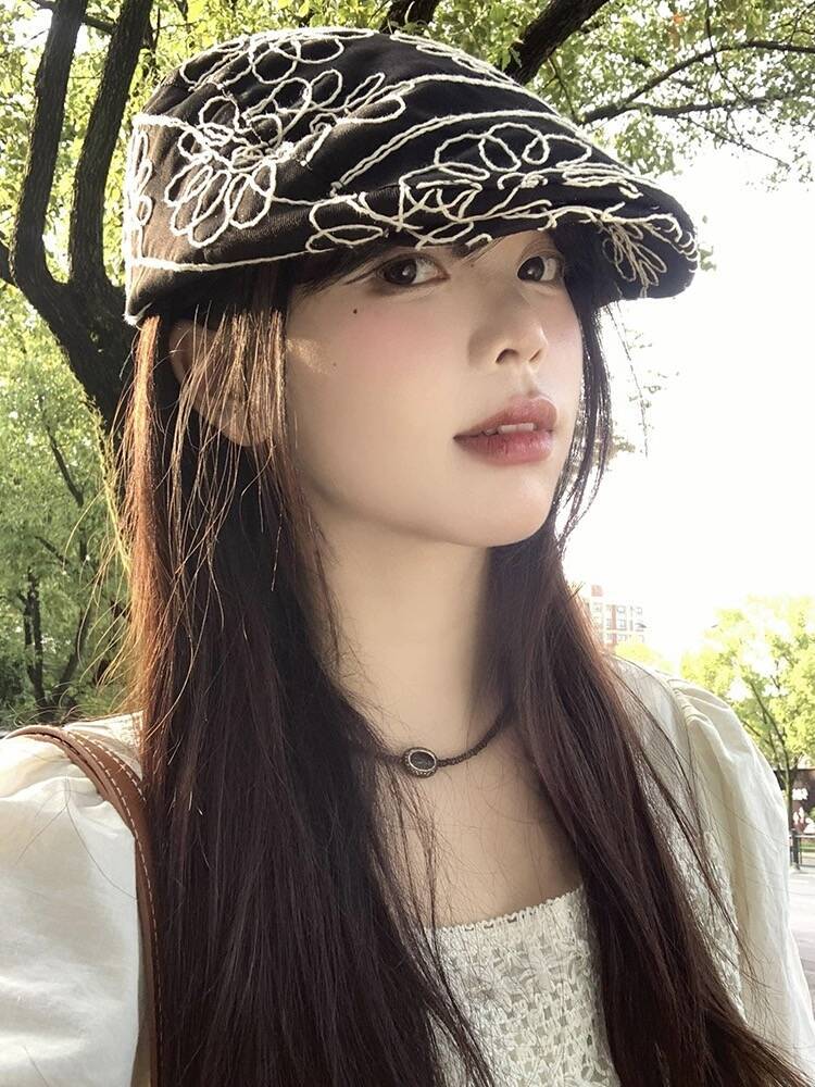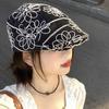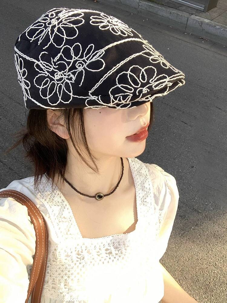 Sombrero negro con bordado de flores vintage para mujer, boina pequeña de verano, estilo japonés, sombrero de pintor de cabeza grande, moderno