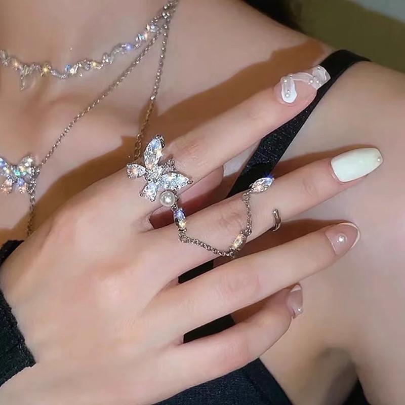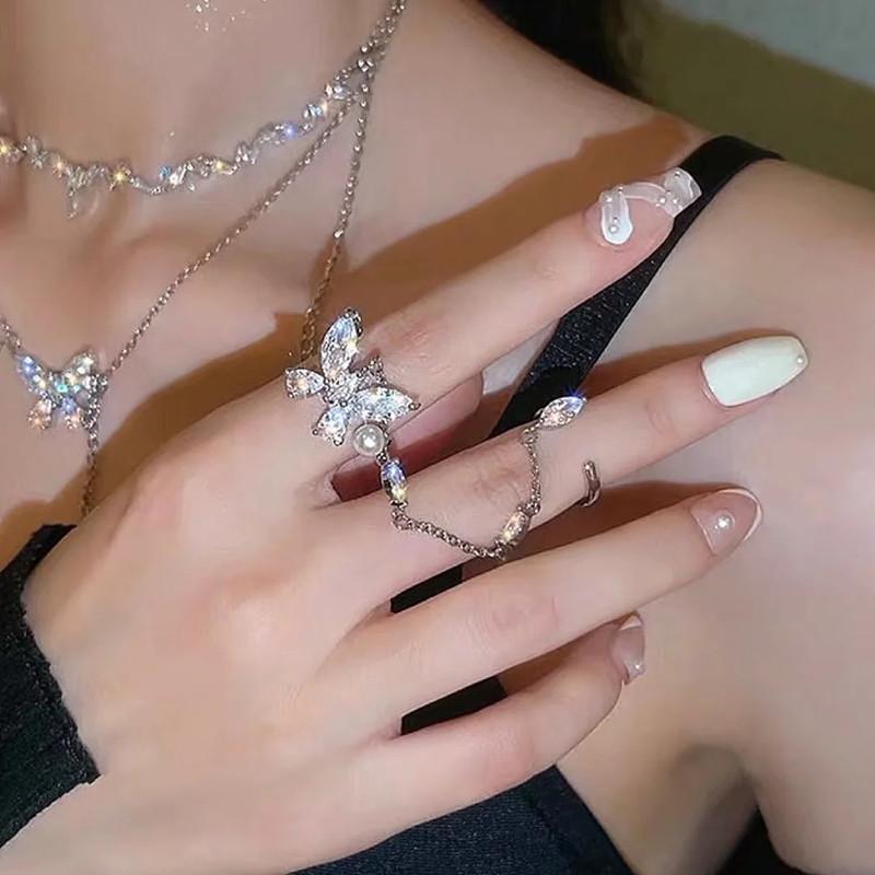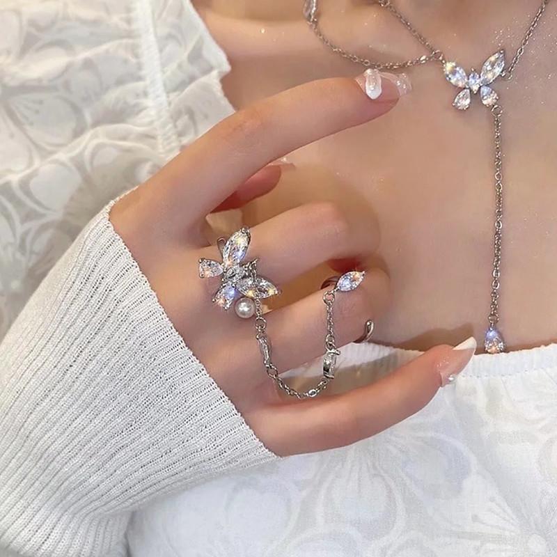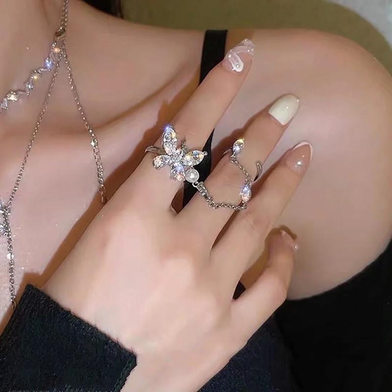 Anillo de mariposa de diamantes de moda, cadena de borlas cosida, anillo abierto, femenino, sentido del diseño avanzado, anillo doble, anillo de moda
