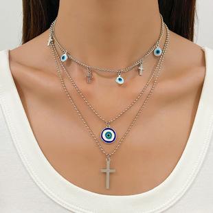 Collar con cruz de cadena de cuentas redondas retro, joyería transfronteriza europea y americana, collar simple multicapa con ojo de diablo azul