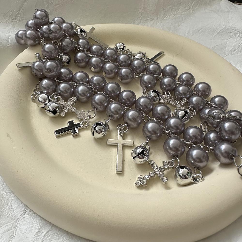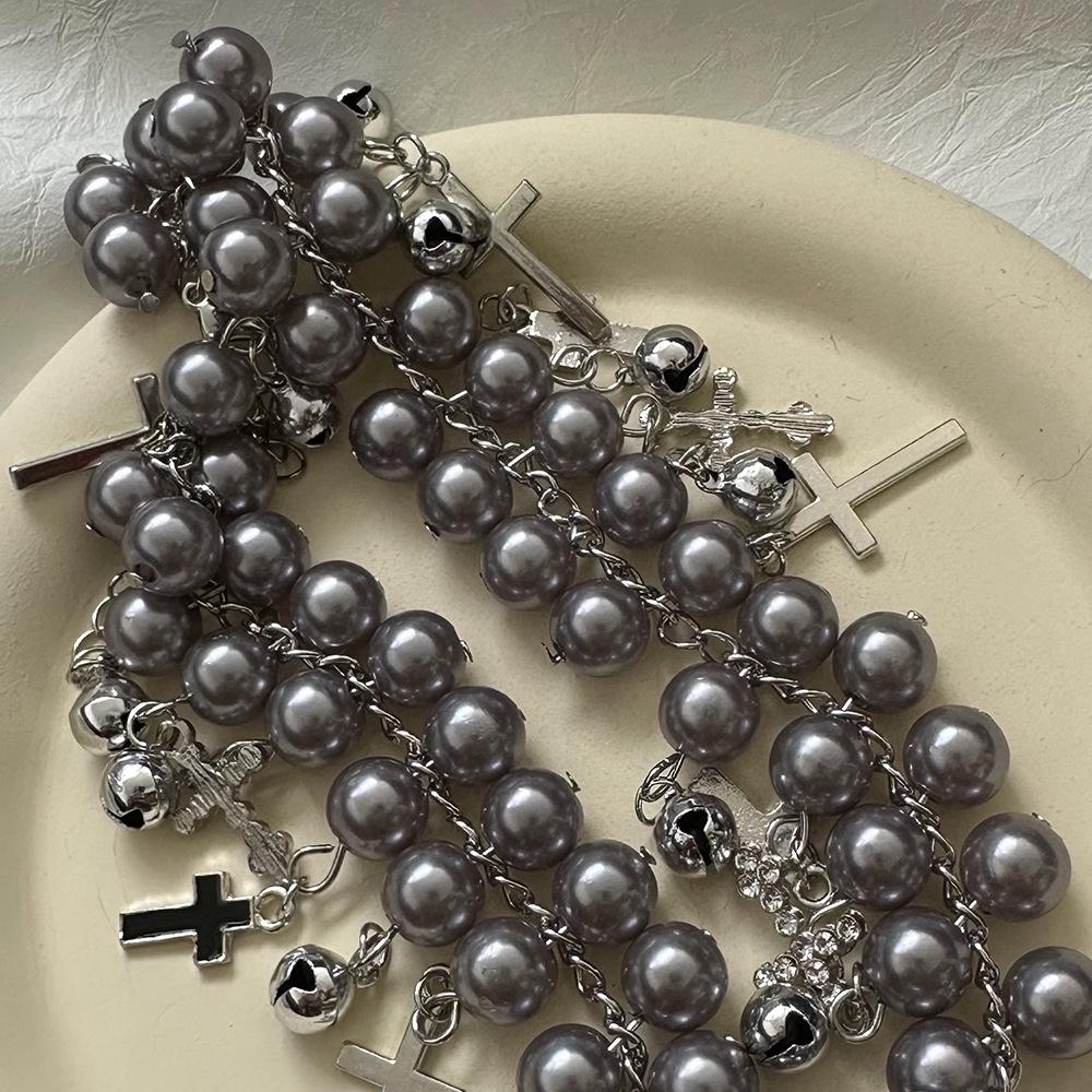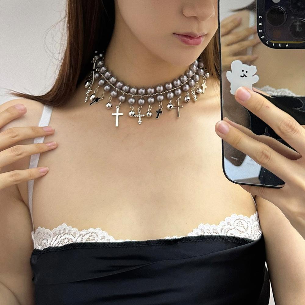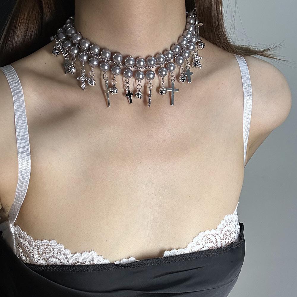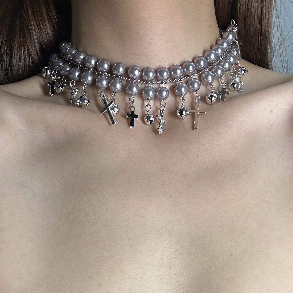 Collar elegante con diseño de nicho, con diseño de cruz de perla fresca y dulce, con campanas, para mujer.