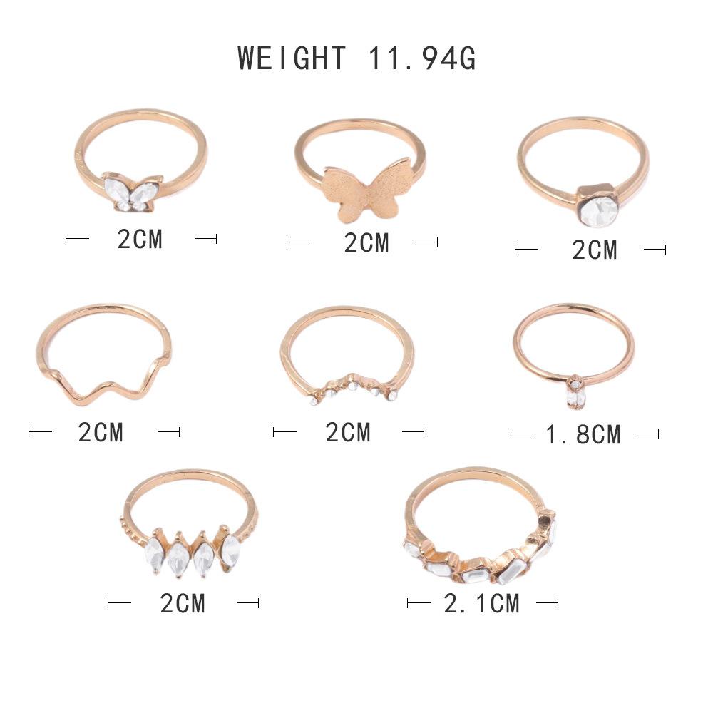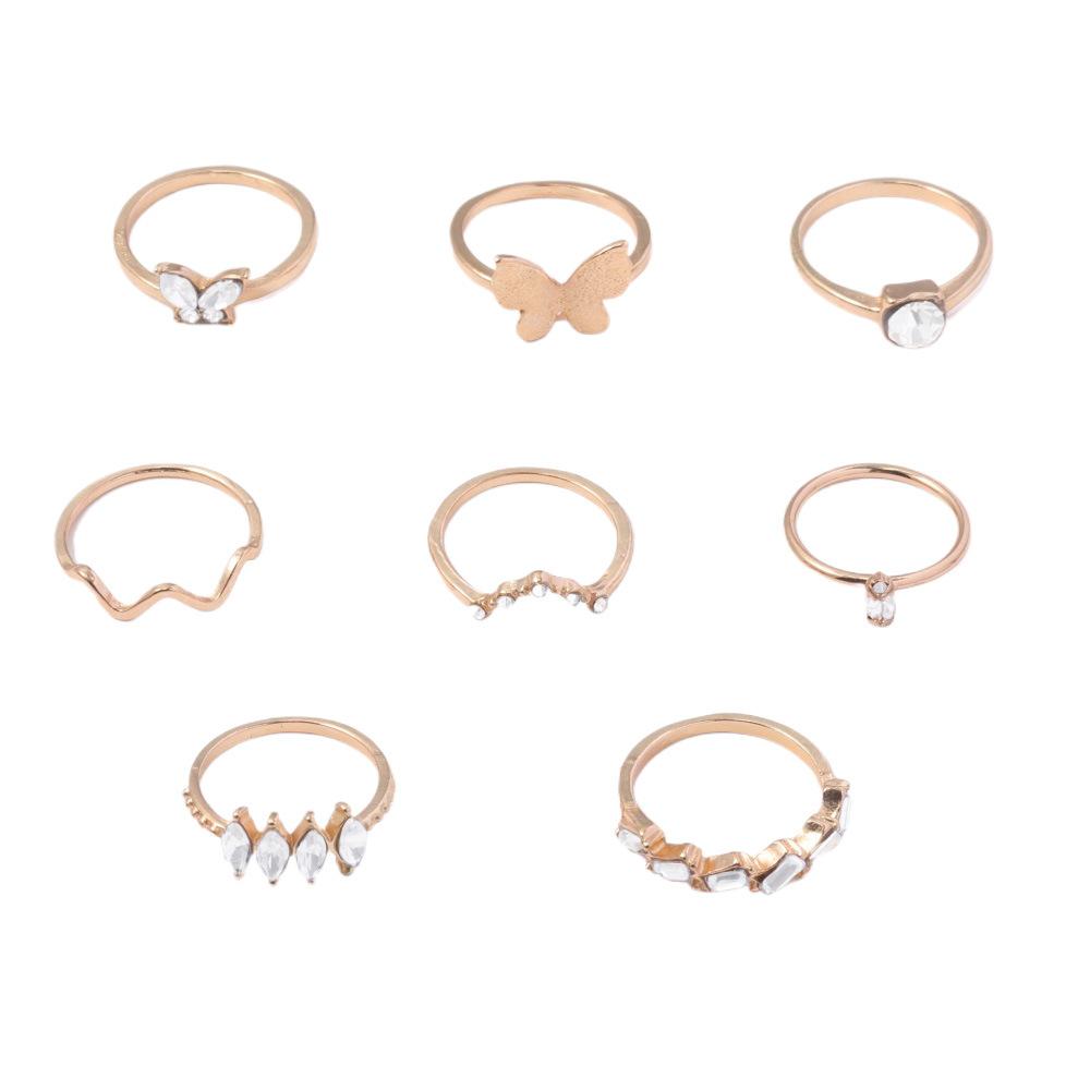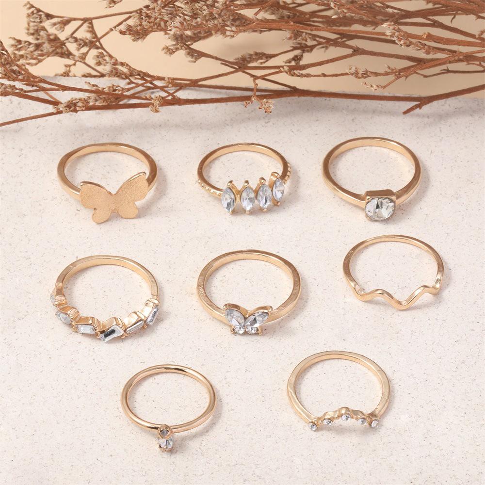 Anillo de combinación nuevo europeo y americano personalidad moda Mariposa dorada punto de onda diamante 8 piezas juego anillo al por mayor