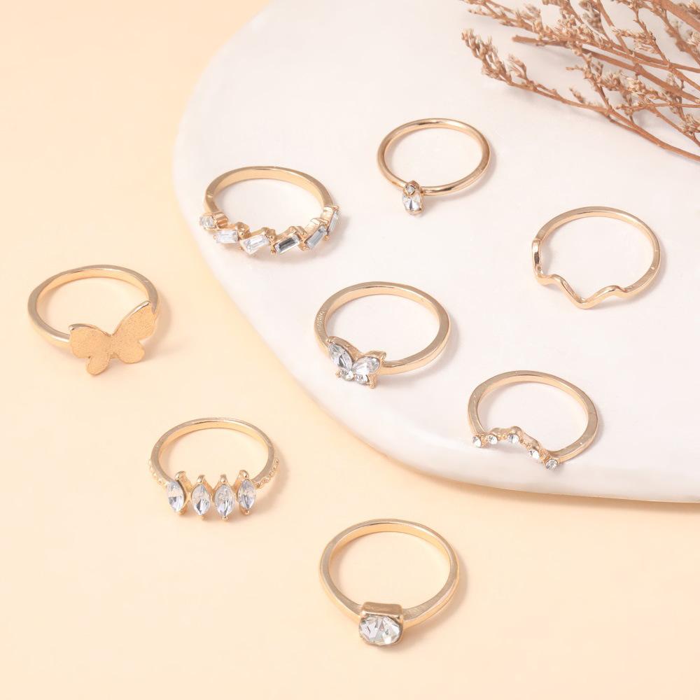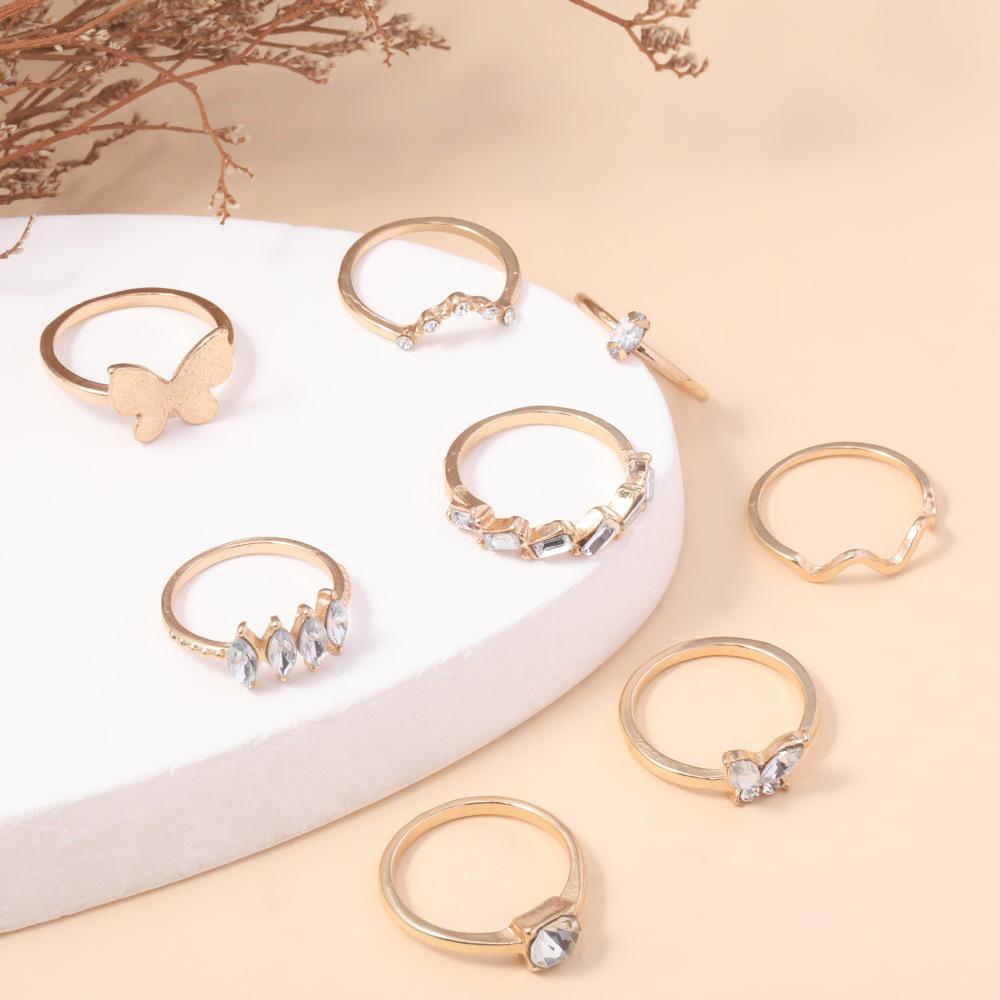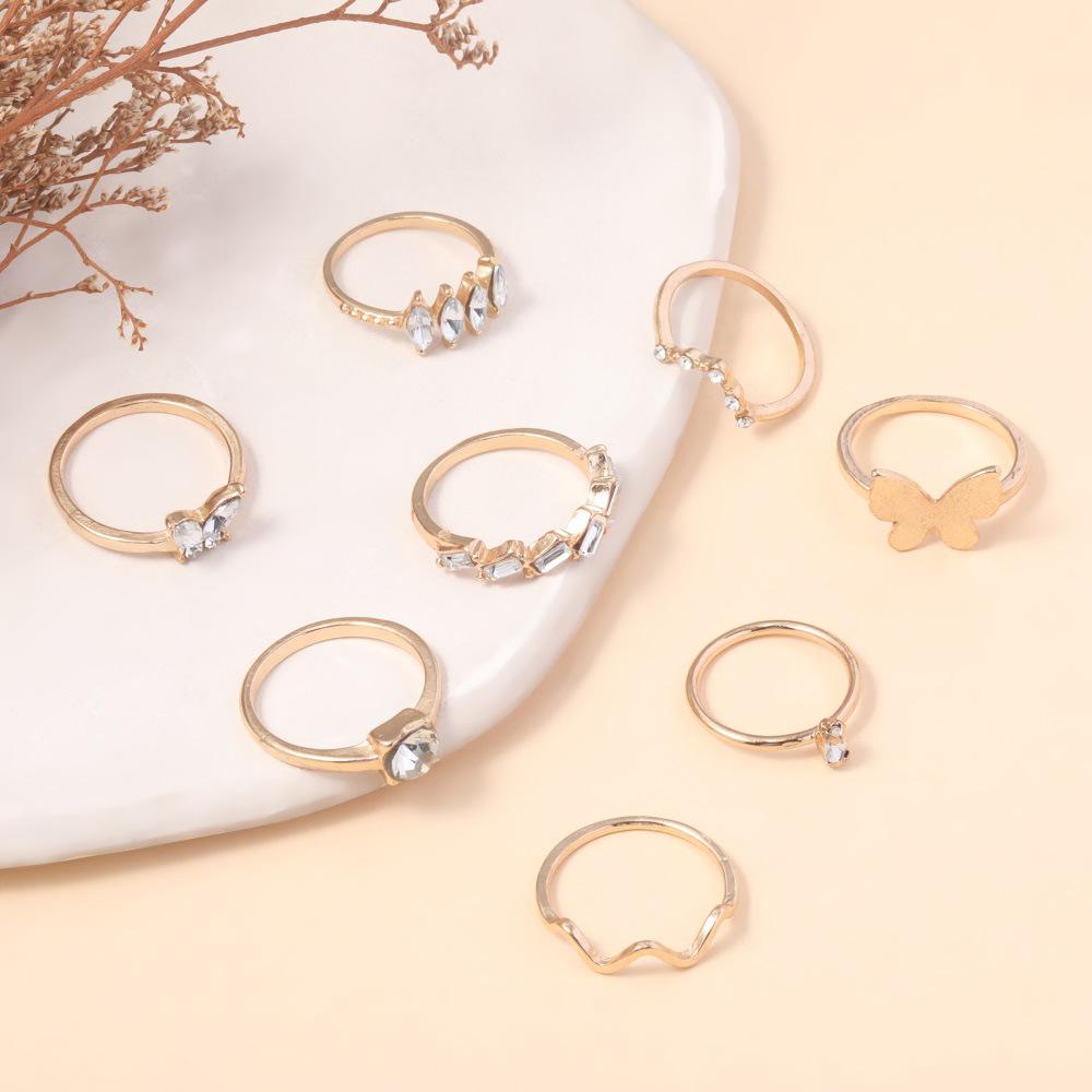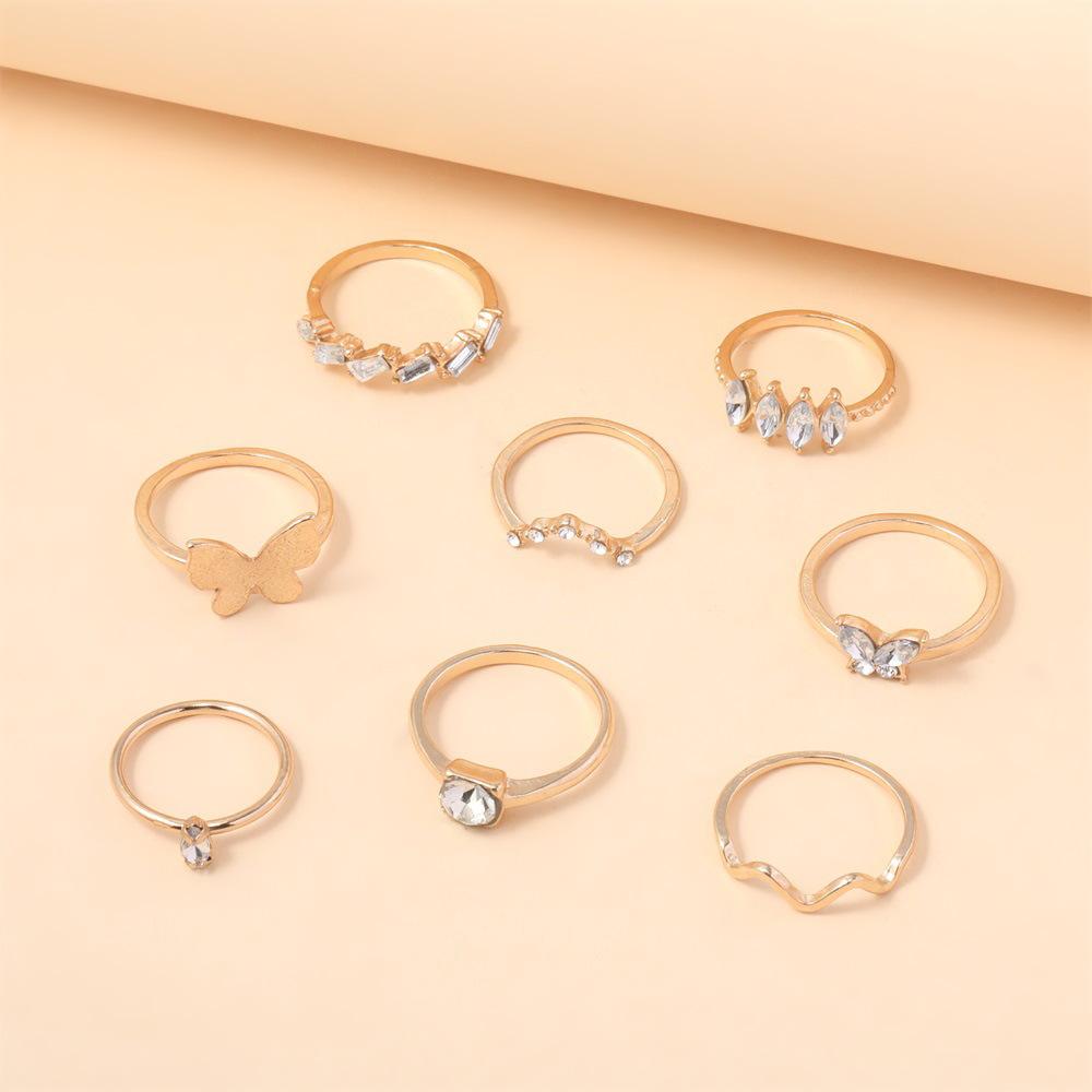Anillo de combinación nuevo europeo y americano personalidad moda Mariposa dorada punto de onda diamante 8 piezas juego anillo al por mayor