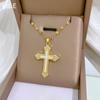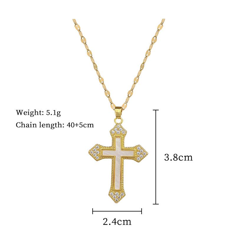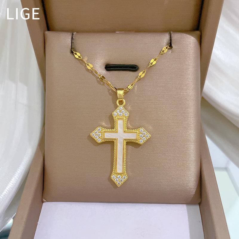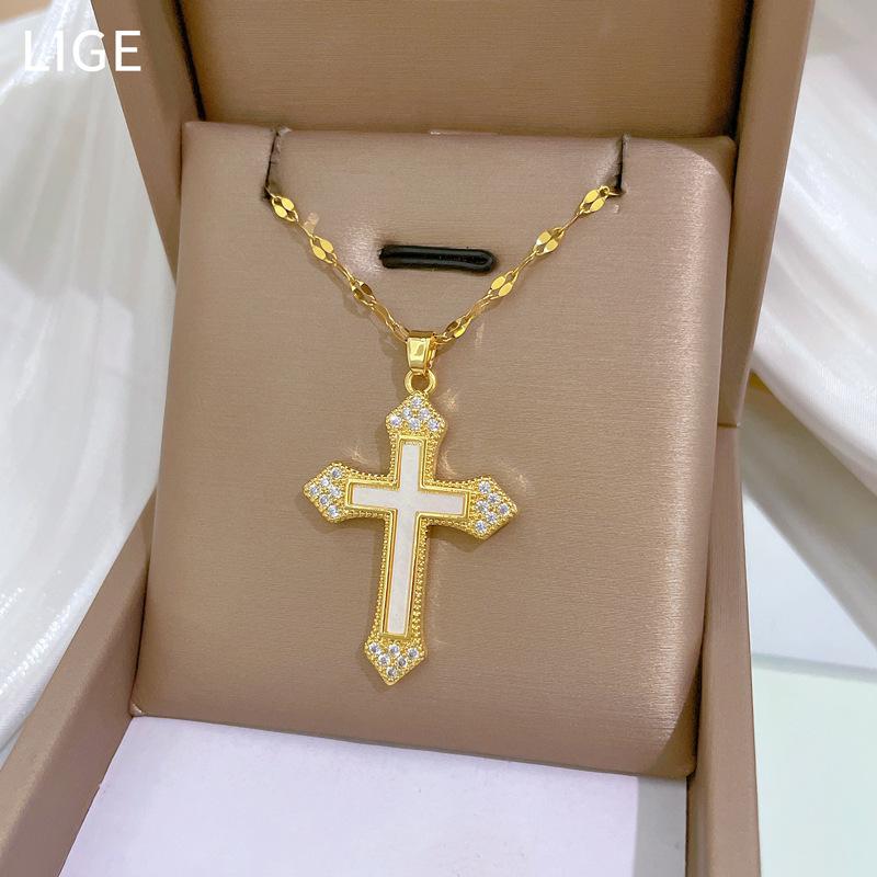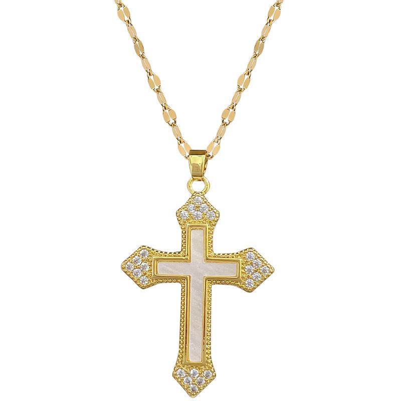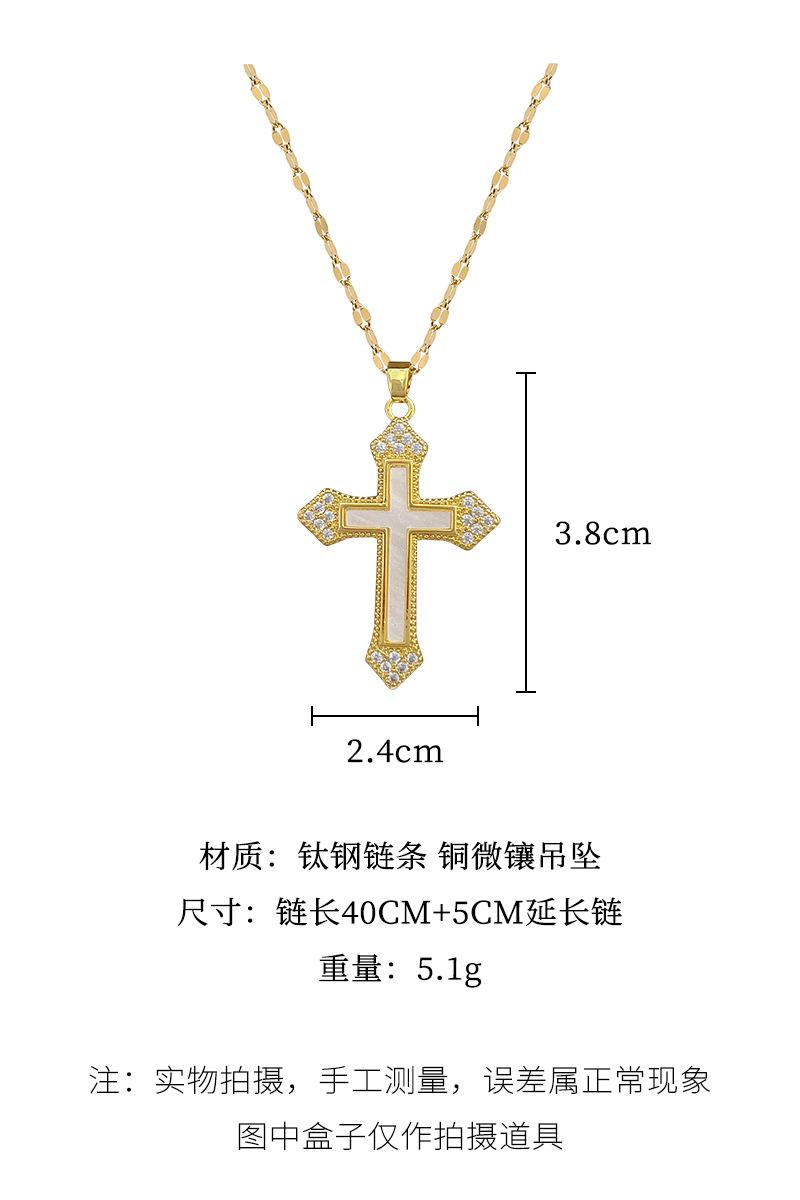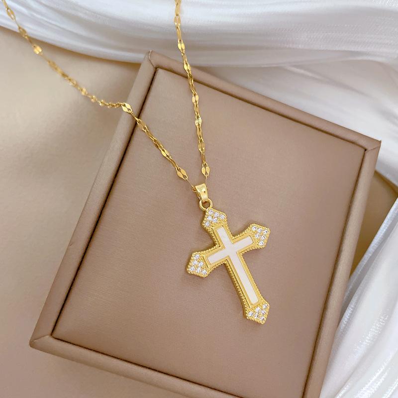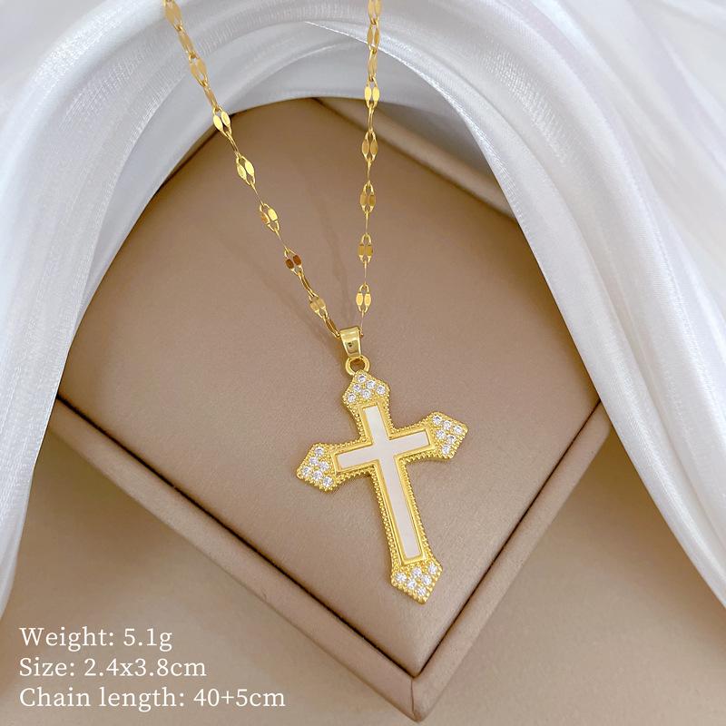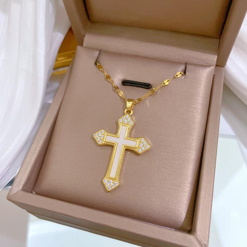 [Acero de titanio] Elegante collar de diamantes con cruz de concha, ligero y lujoso, cadena de clavícula para mujer, cadena de acero de titanio.
