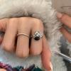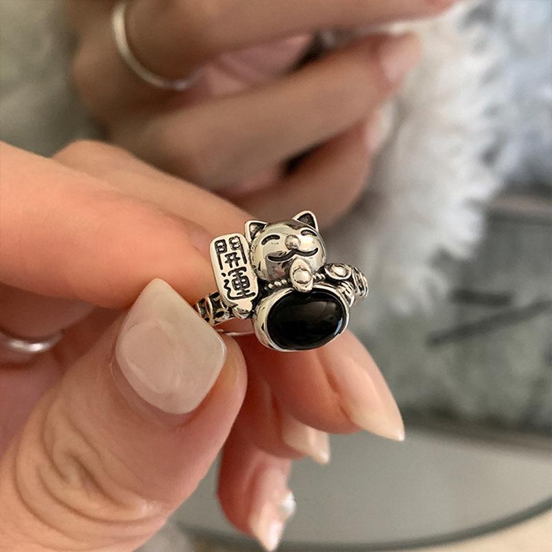 Anillo de Gato de la Suerte de Zircón Negro con Diseño de Nicho Retro Envejecido para Mujer, Elegante, Versátil, de Alta Gama, Abierto