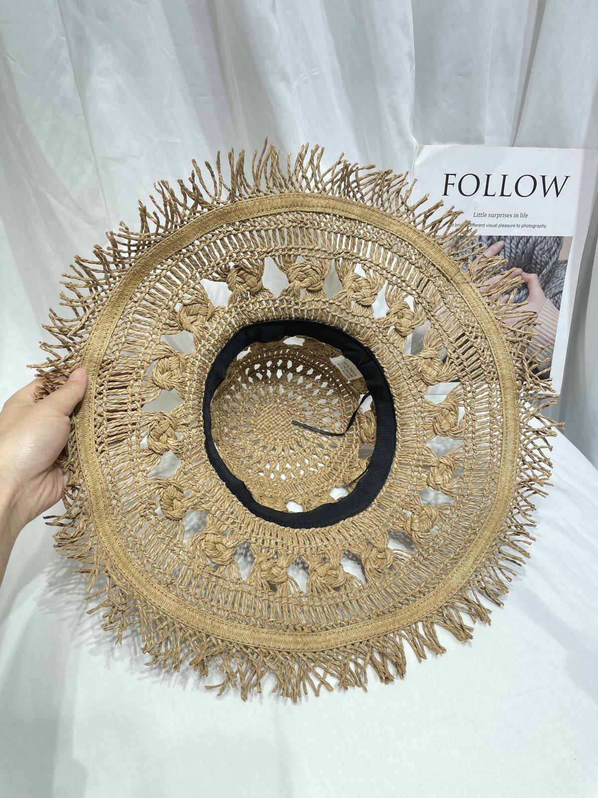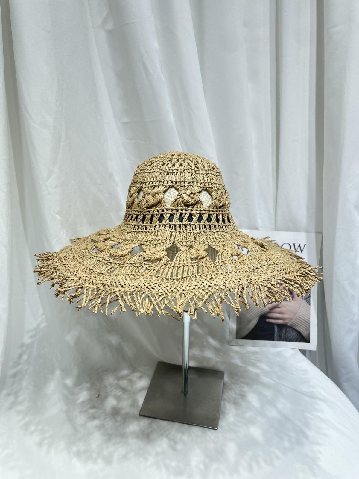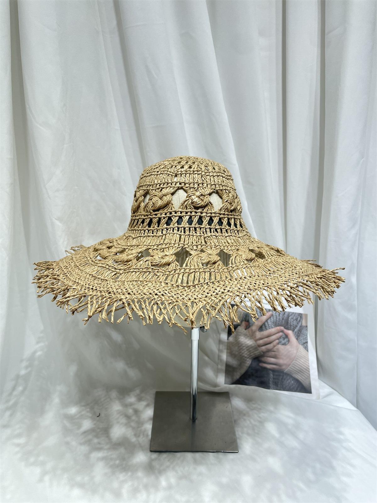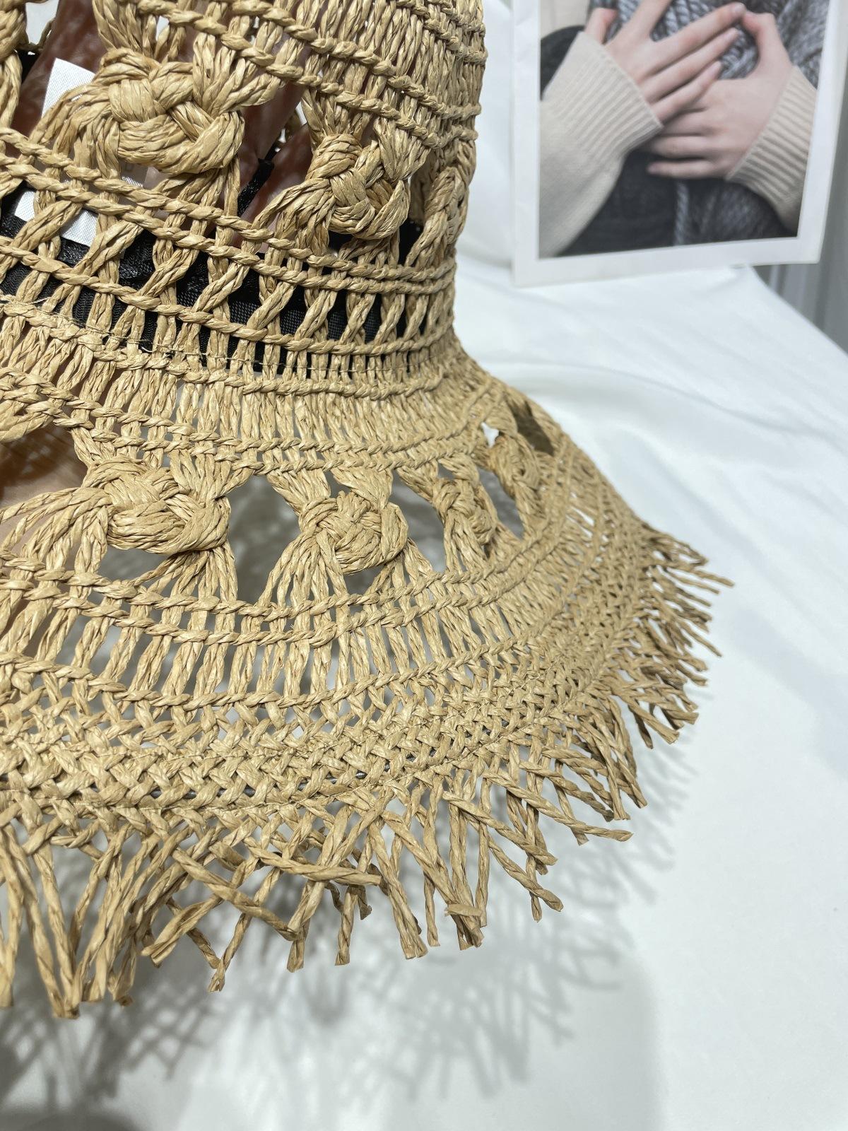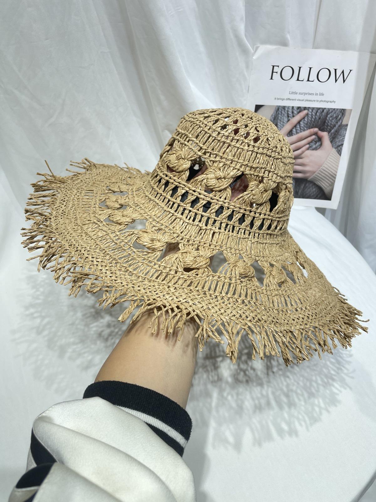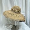 Sombrero de Paja de Ala Ancha Calado Transpirable Tejido a Mano de Estilo Europeo y Americano Sombrero de Playa Protector Solar de Verano para Mujer