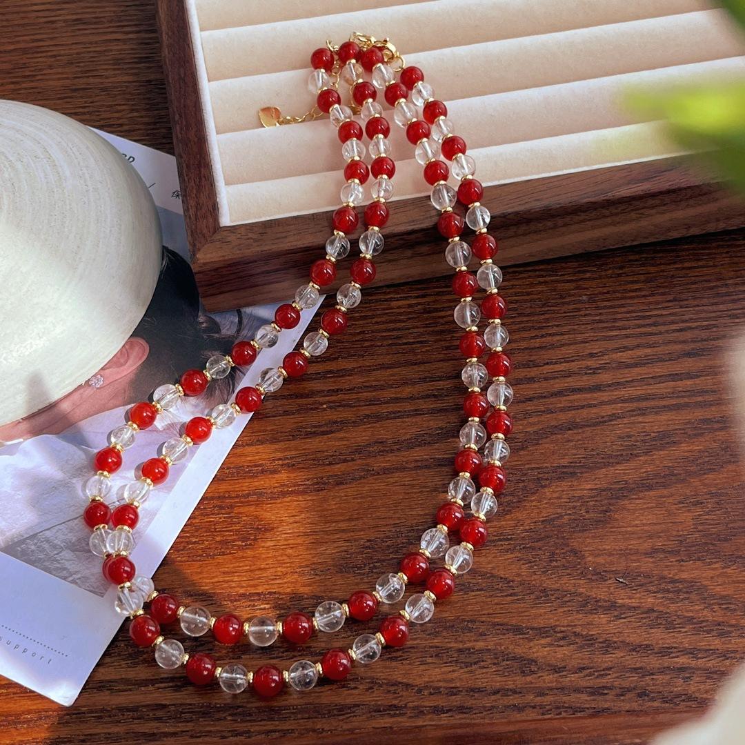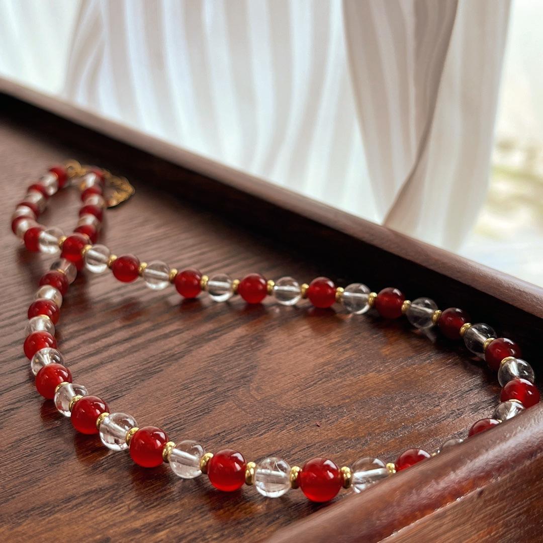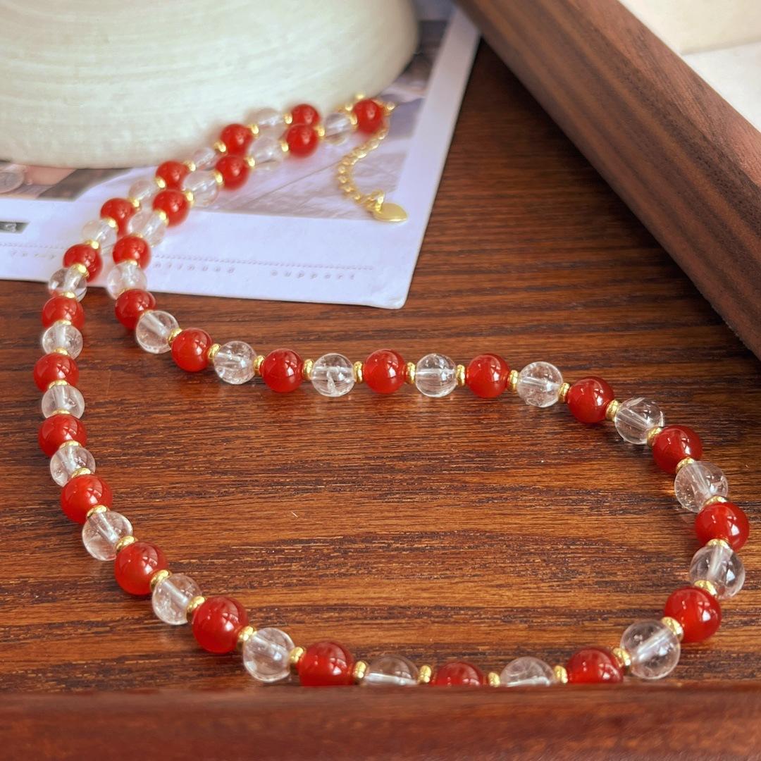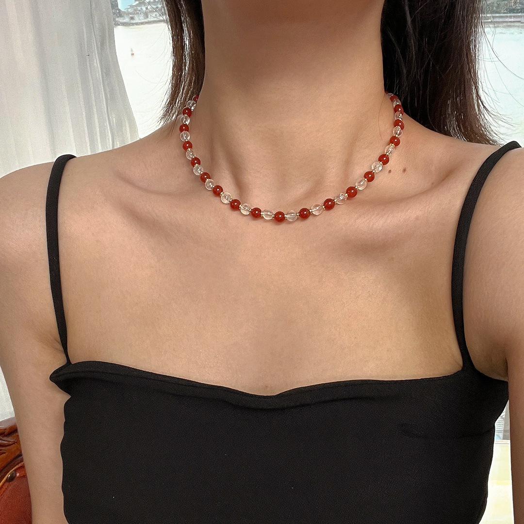 Collar con diseño de contraste de color de calcedonia roja natural y cristal blanco natural, cadena para clavícula y cuello.