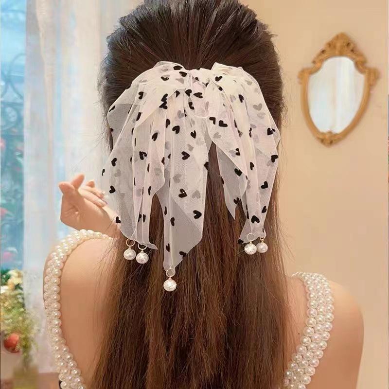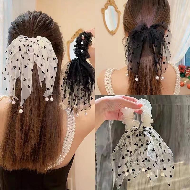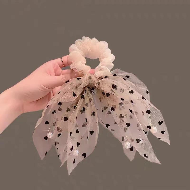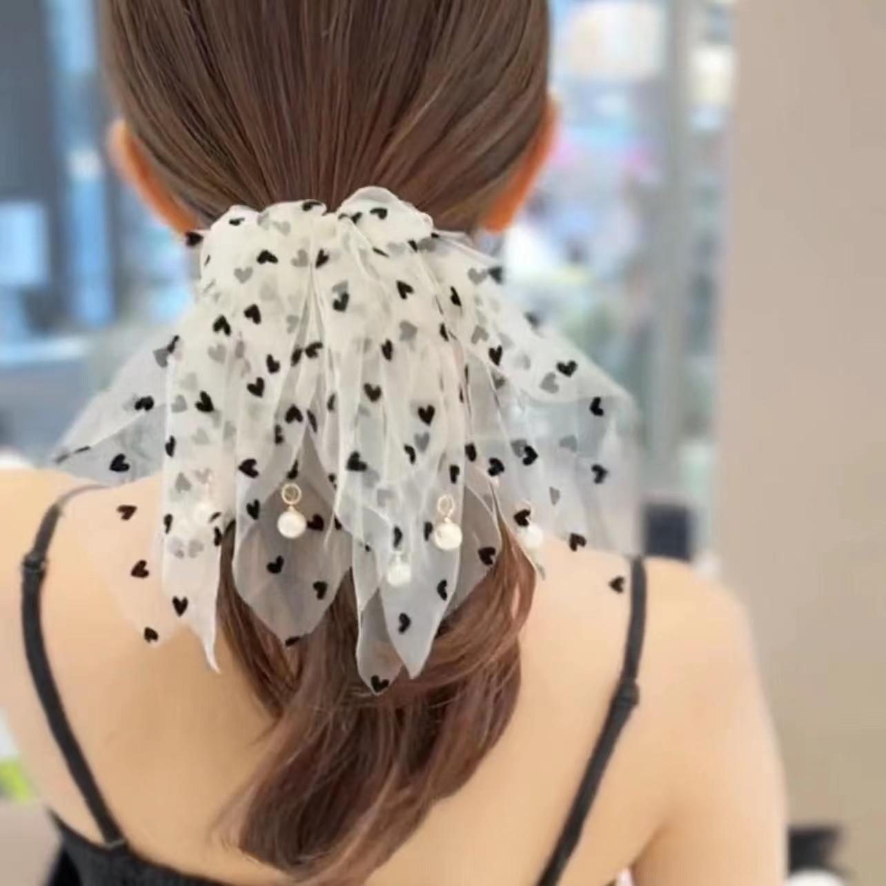 Anillo para el cabello con borla pequeña de lunares y malla de perla, popular, con velo de encaje, para celebridades de Internet, lazo de temperamento para adultos, anillo para intestino grueso para mujer