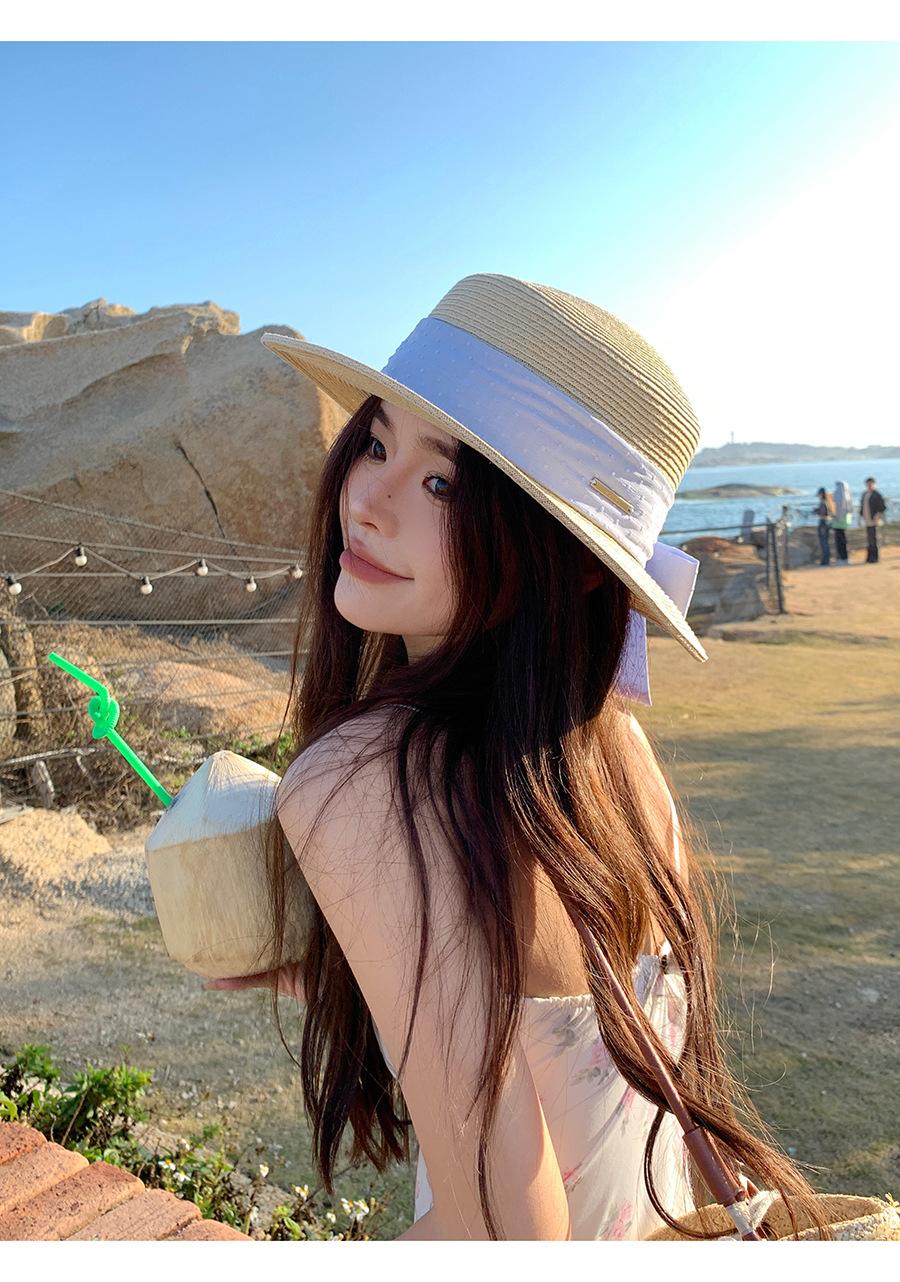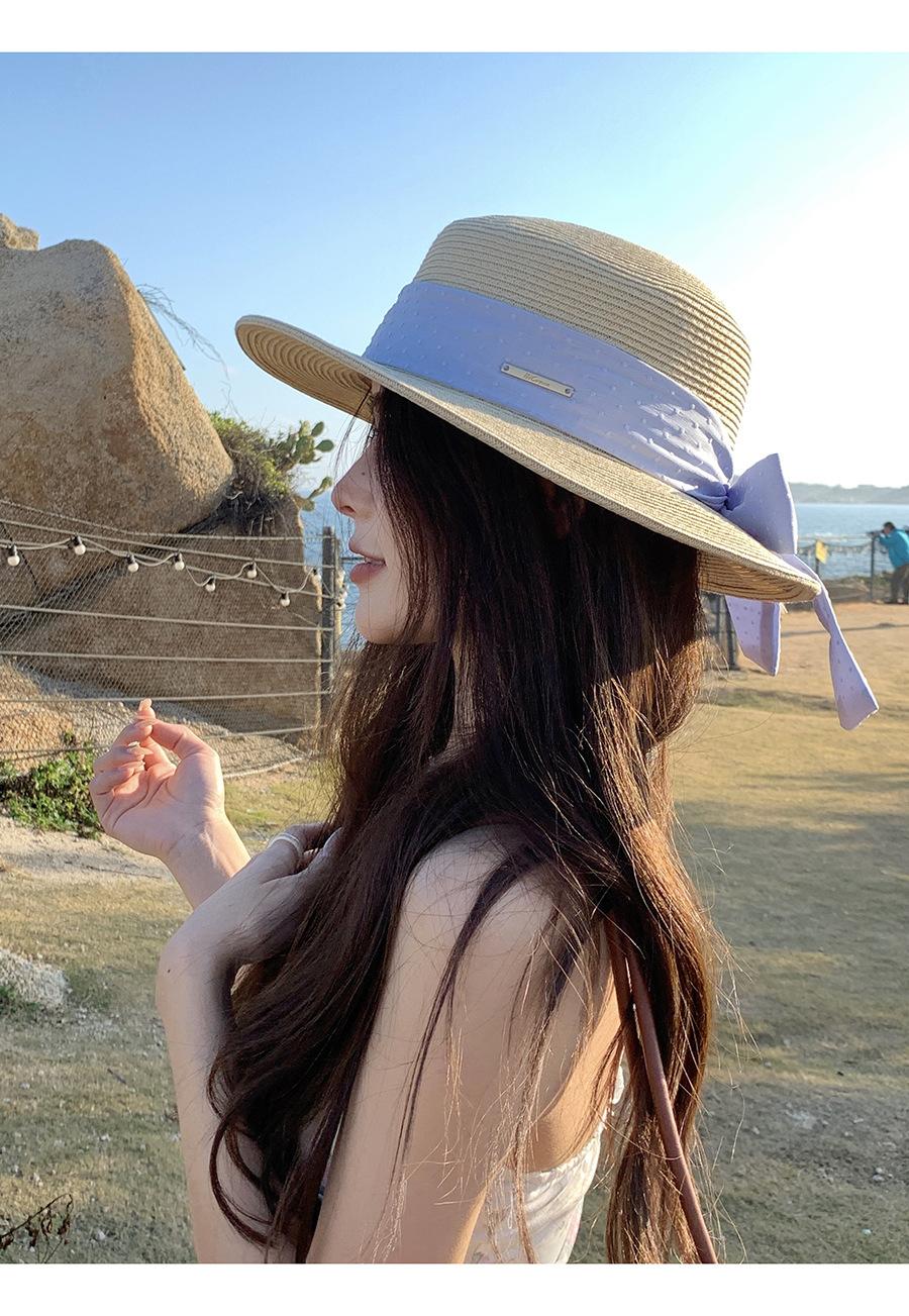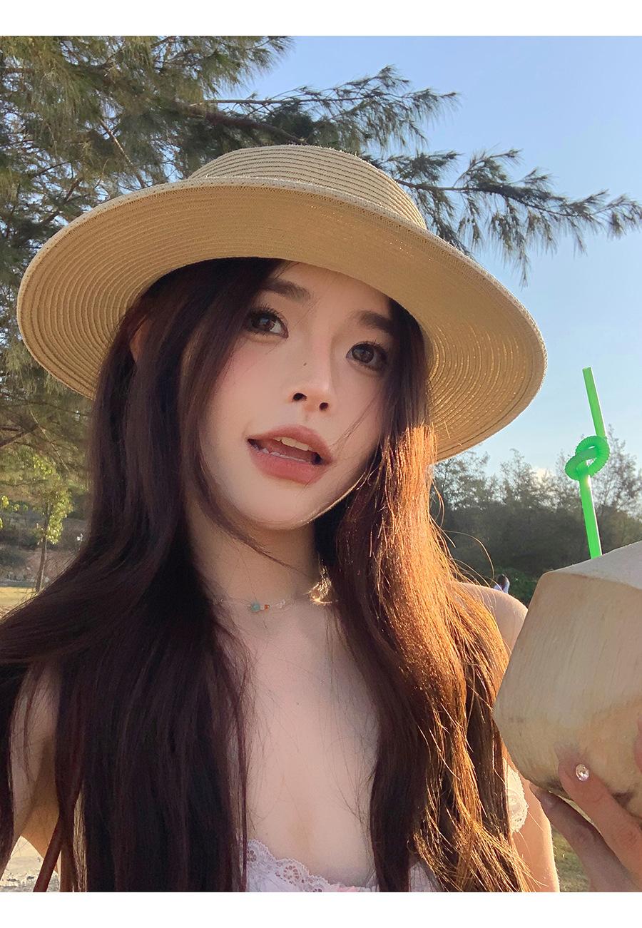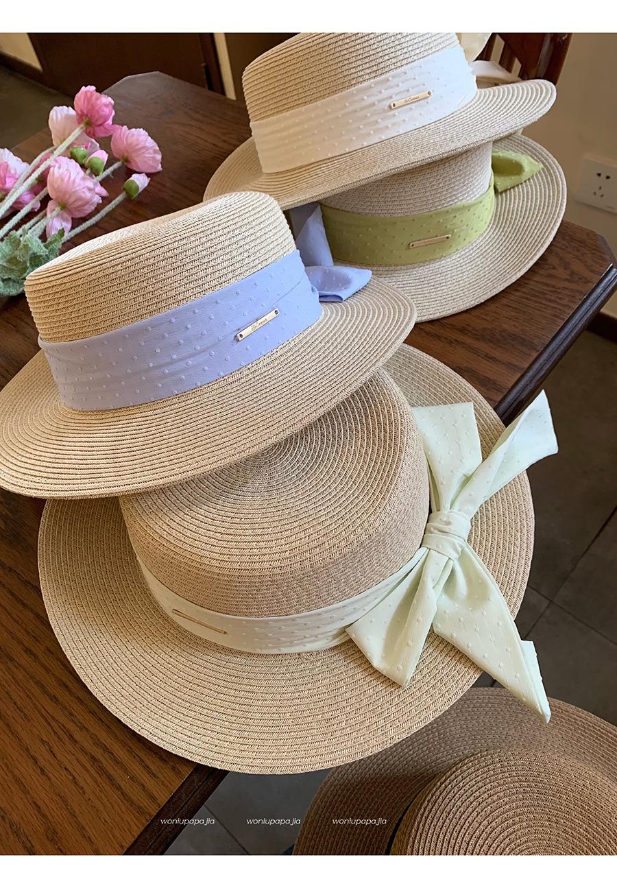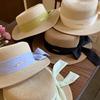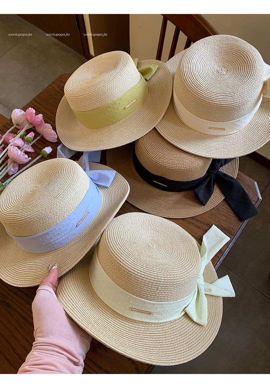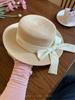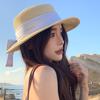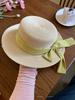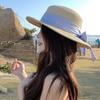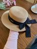 Sombrero de paja con lazo de cinta, sombrero de paja Lafite nuevo de verano para mujer, copa plana, ala ancha, sombrero para protección solar
