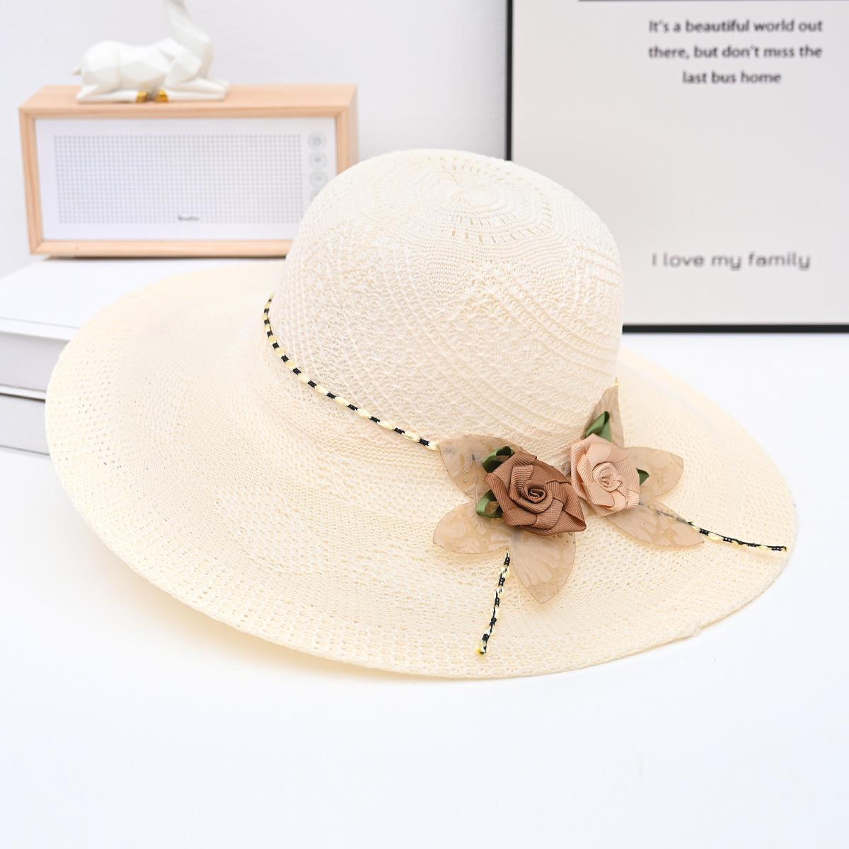 Two-color big flower big brim straw hat beige