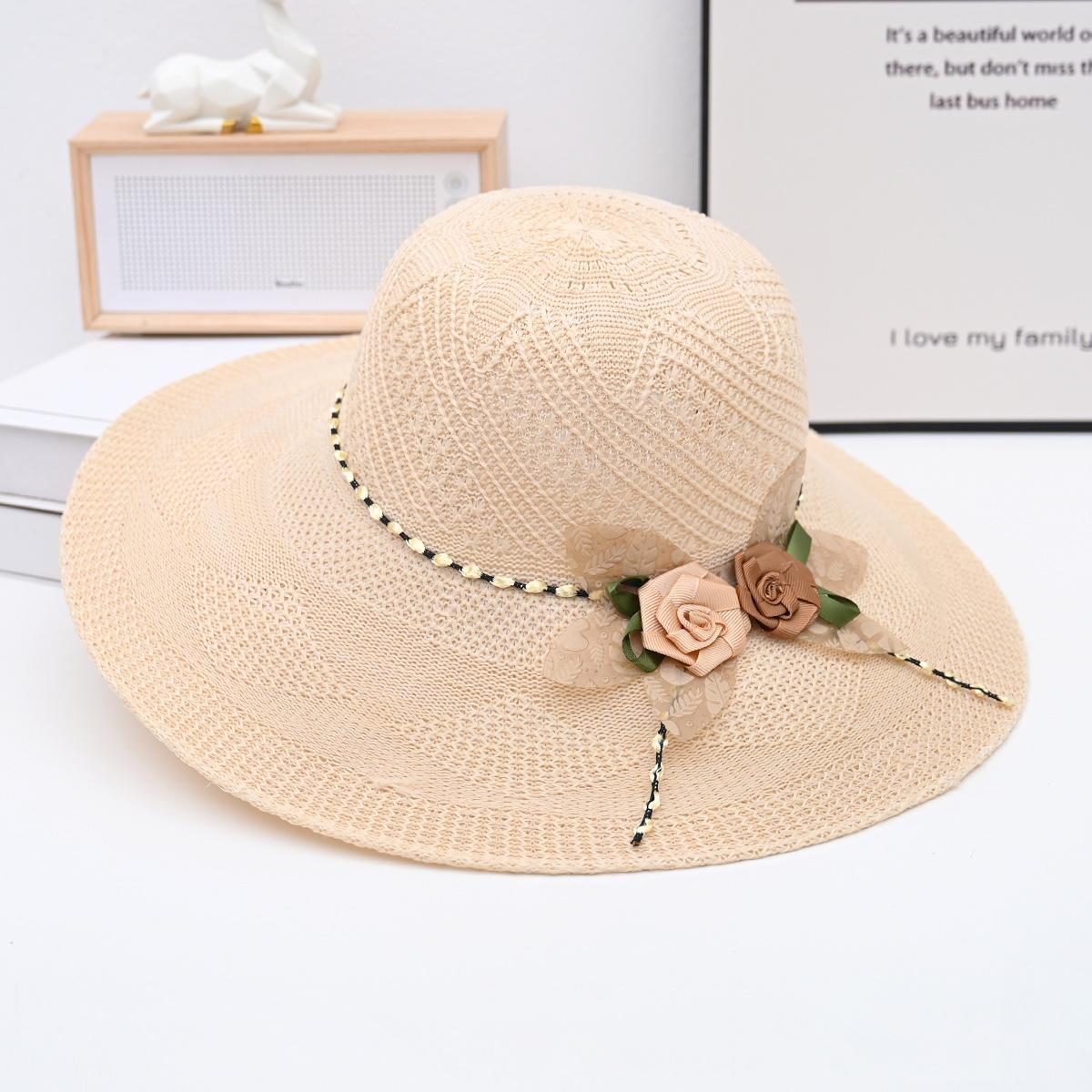 Ribbon flower big brim straw hat light coffee