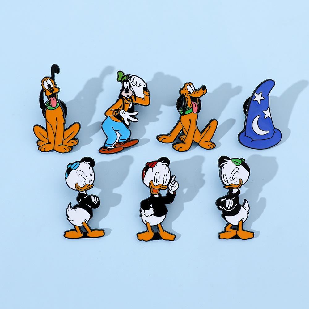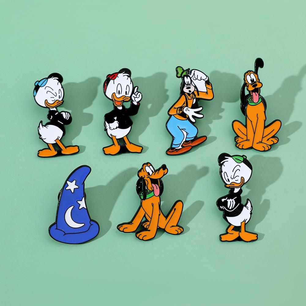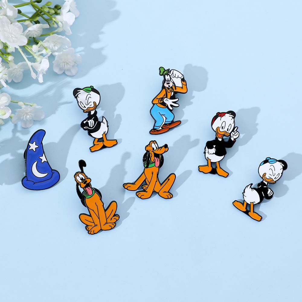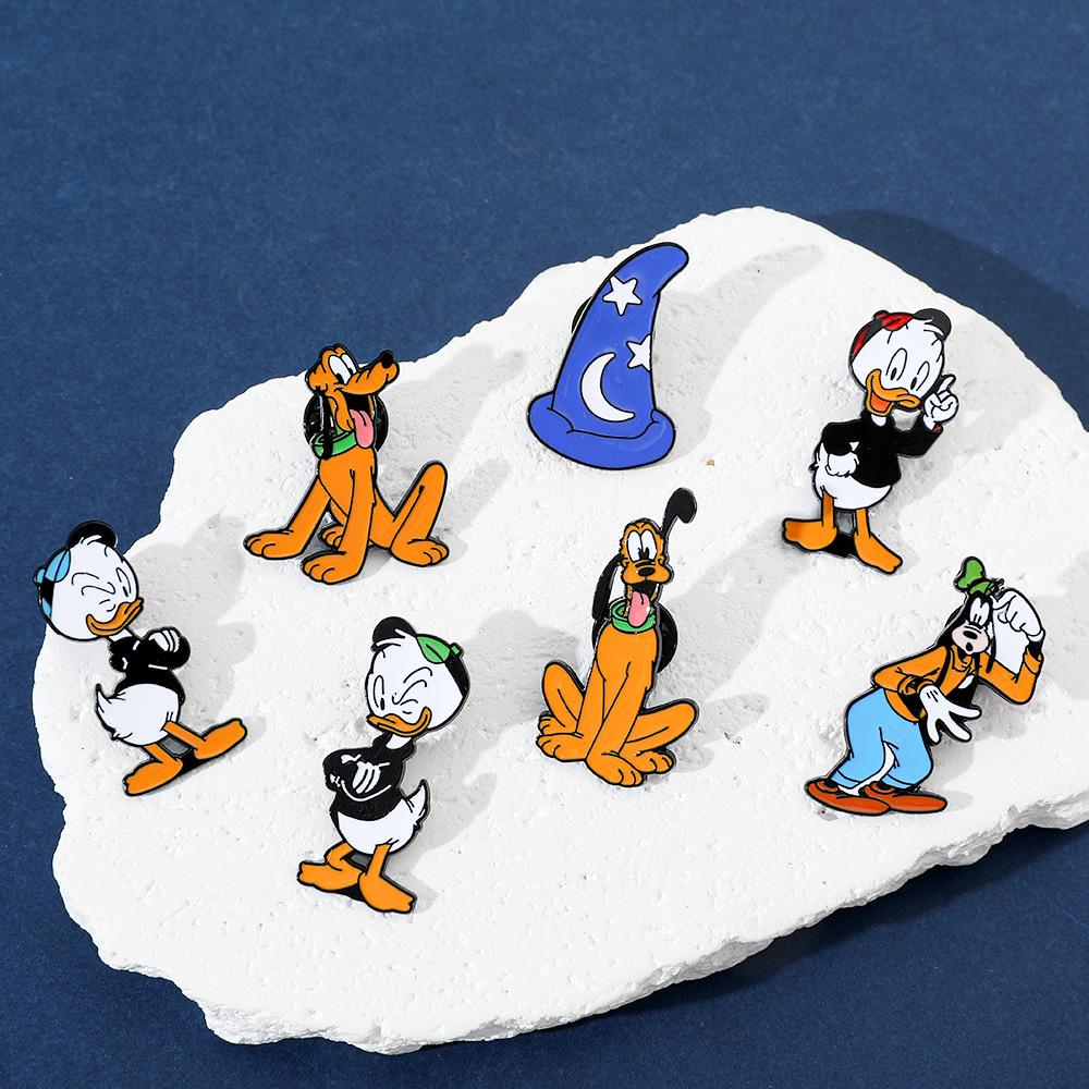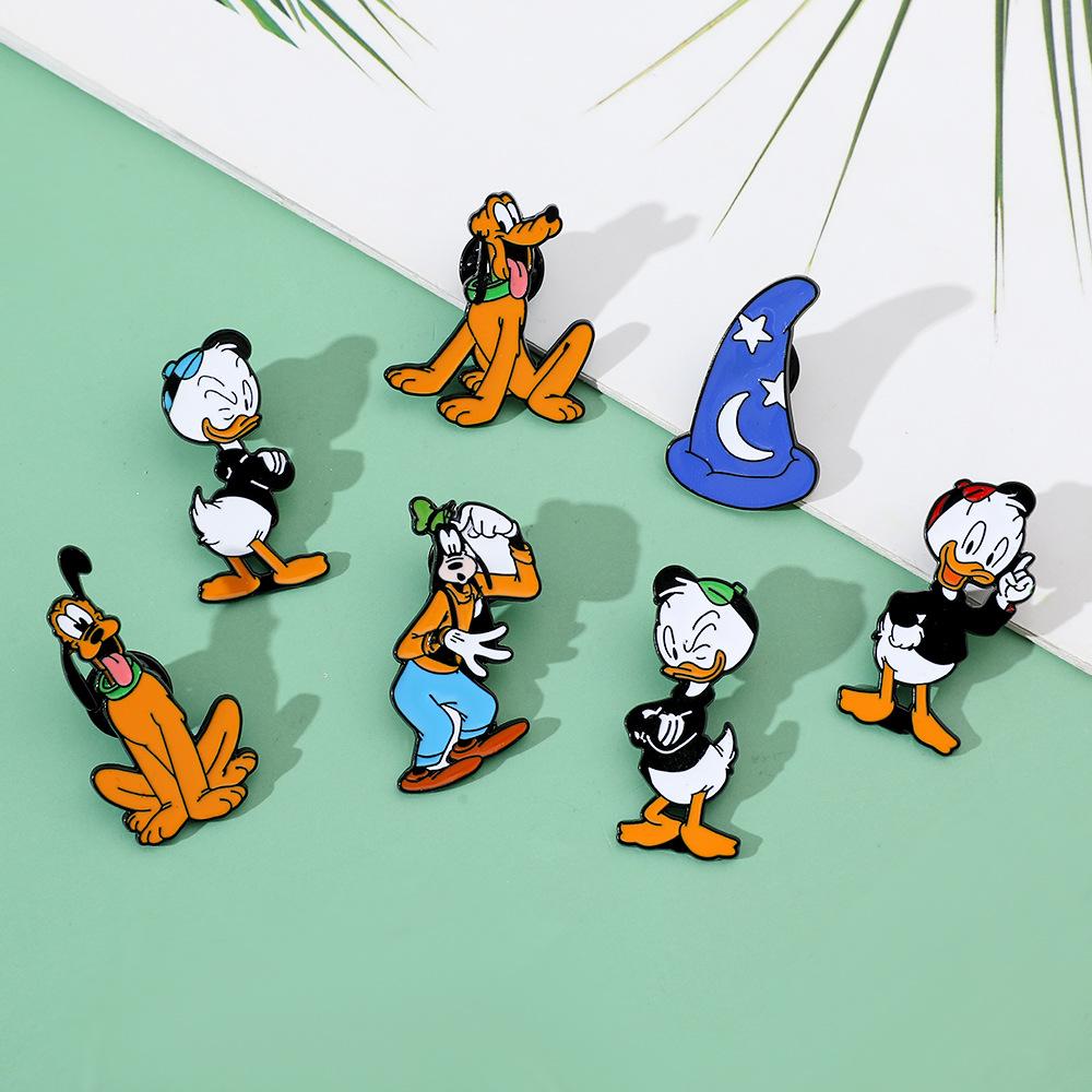 Broche de aleación con forma de gota de aceite y diseño de perro tonto con insignia de metal de pato Donald, personaje de dibujos animados europeo y americano