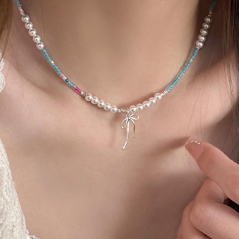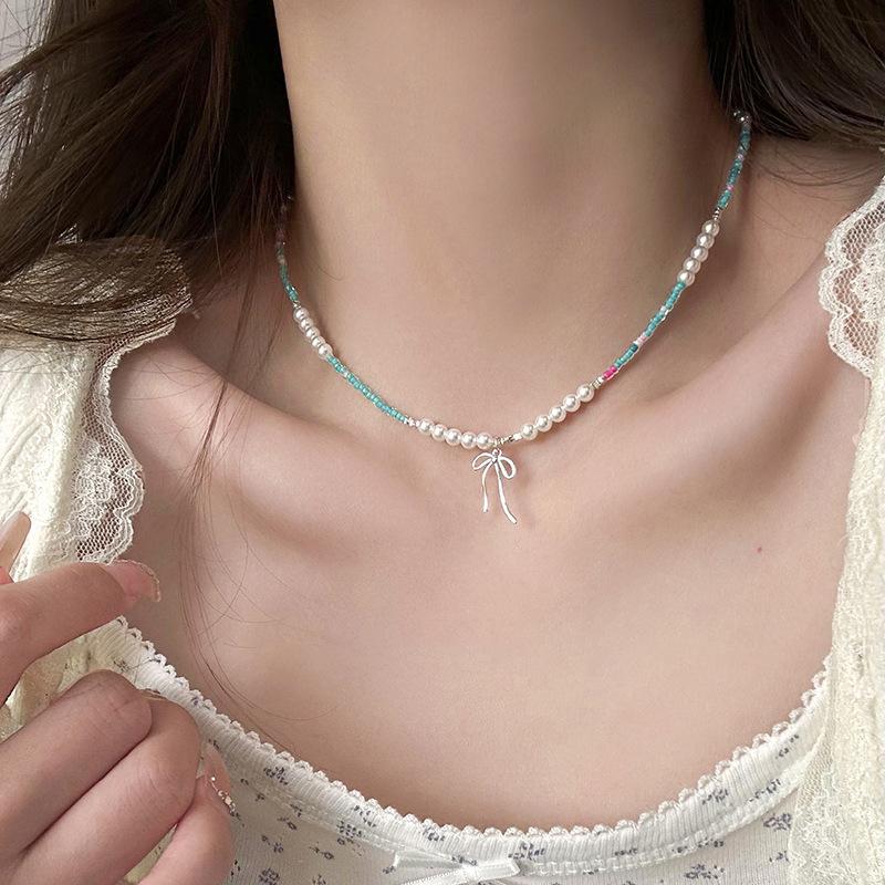 Collar de perlas con cuentas de color dopamina para mujer, cadena de clavícula con lazo de verano, cadena de collar de nicho de lujo ligero de alta calidad