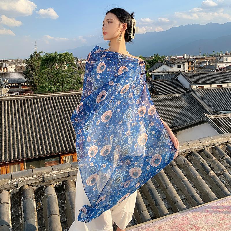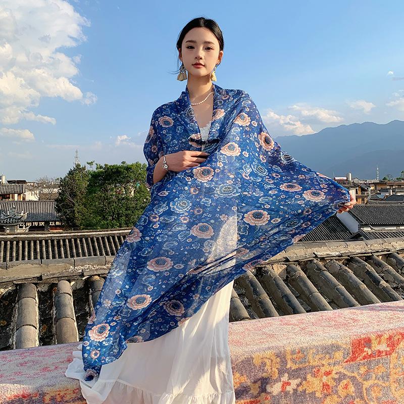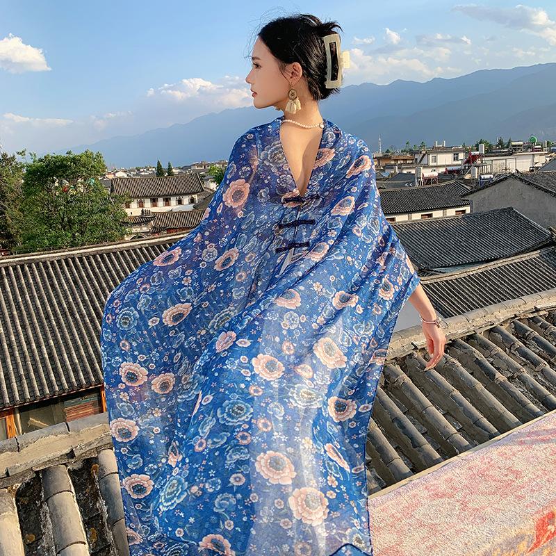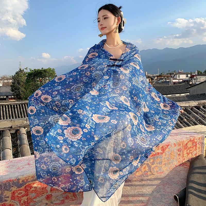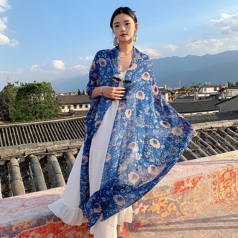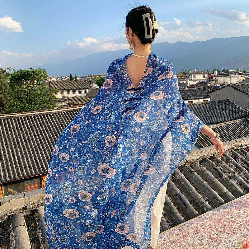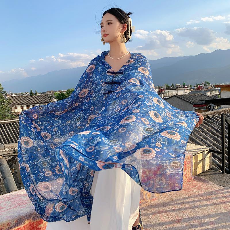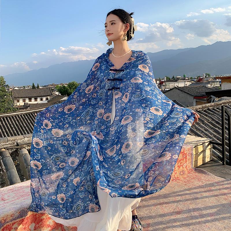 Capa grande personalizada, estilo étnico, cómoda y transpirable, estilo retro, azul marino, floral, para viaje, con hebilla distintiva.