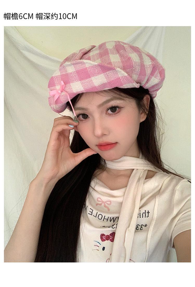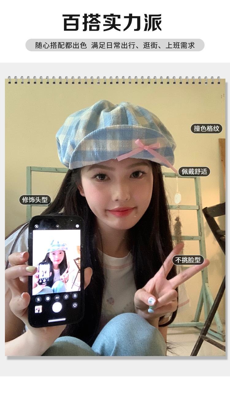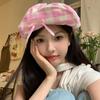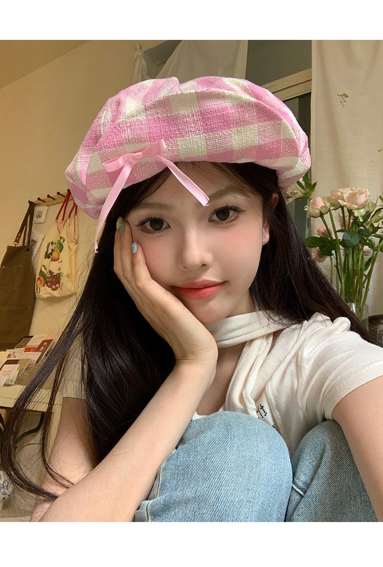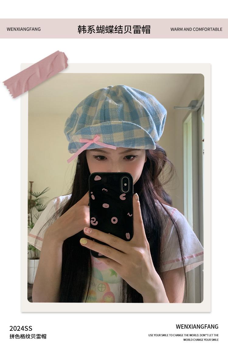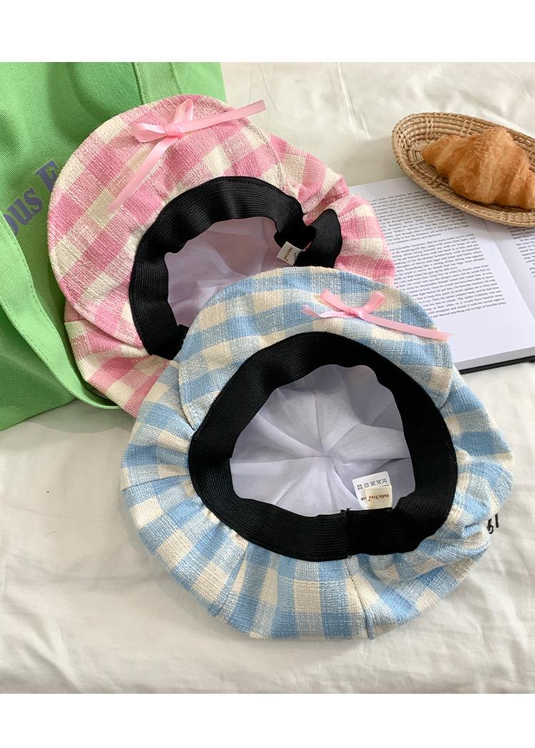 Lindo Boina Octogonal de Nube a Cuadros con Lazo para Mujer Verano Delgada Transpirable Cabeza Grande Nicho Sombrero de Pintor