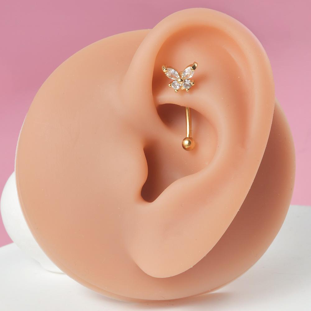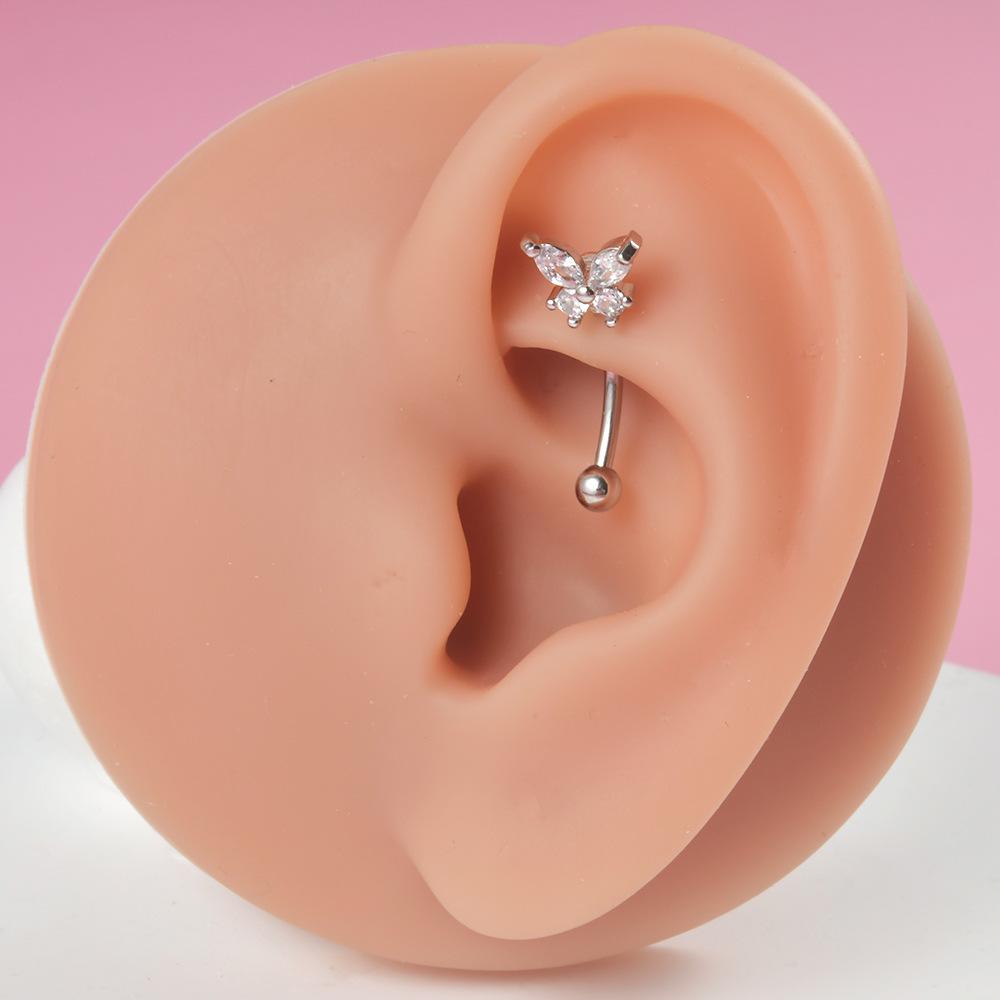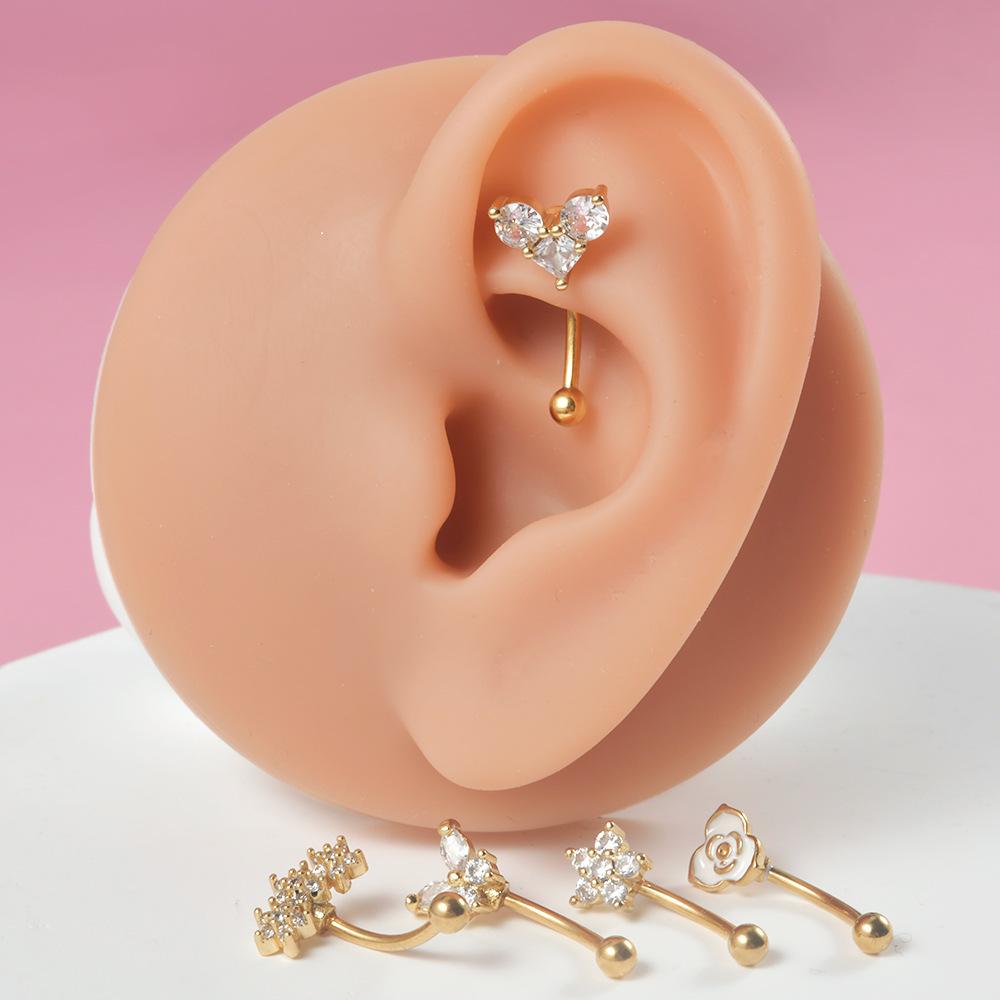 .Nombre: Aretes nuevos de rosca externa de flor de mariposa transfronteriza, tachuelas para el hueso de la oreja, aretes de circonita en forma de corazón, aretes piercing de rosca externa