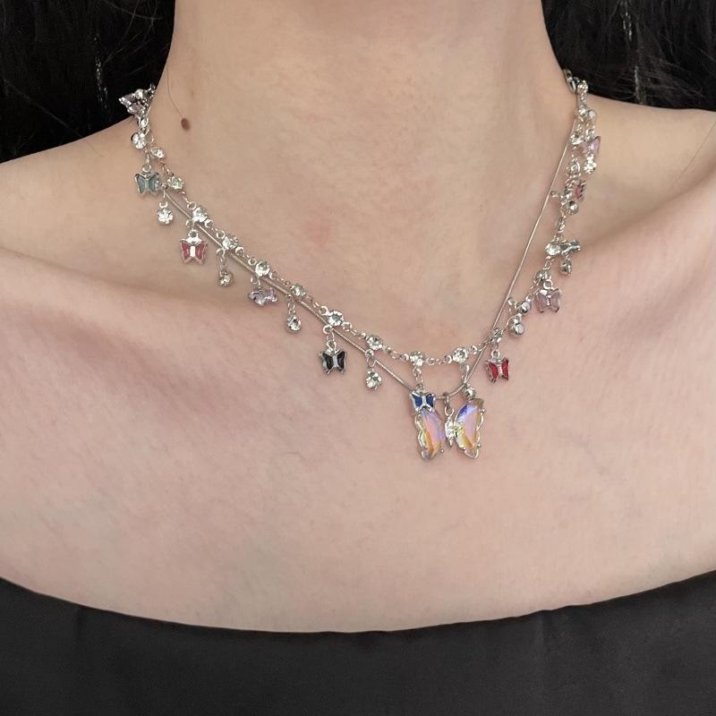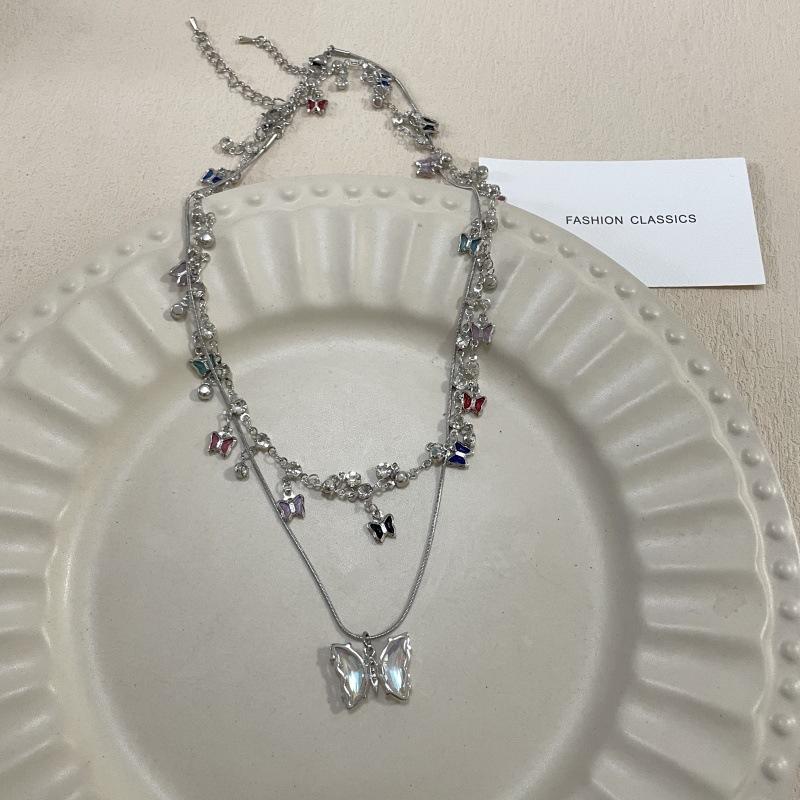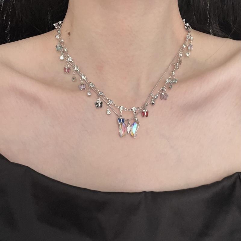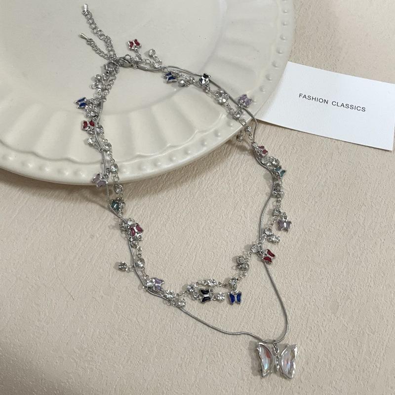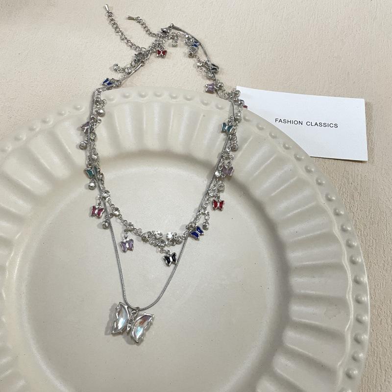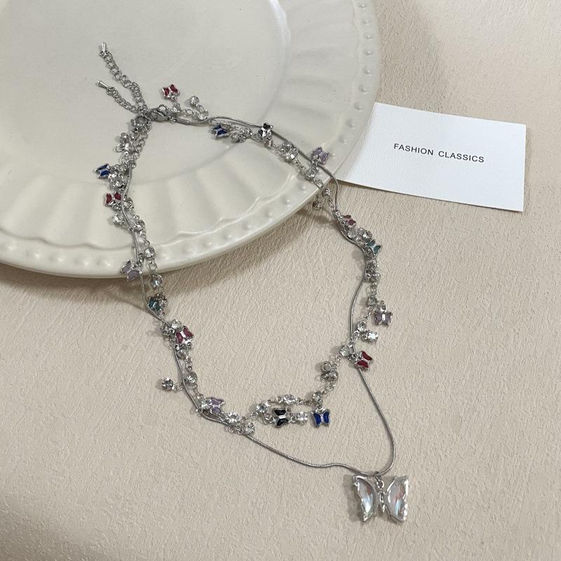 Dulce Pequeño Fresco Super Flash Pedrería Mariposa Borla Doble Cadena Clavícula Exquisito de Alta Calidad Femenino Nuevo Collar de Moda