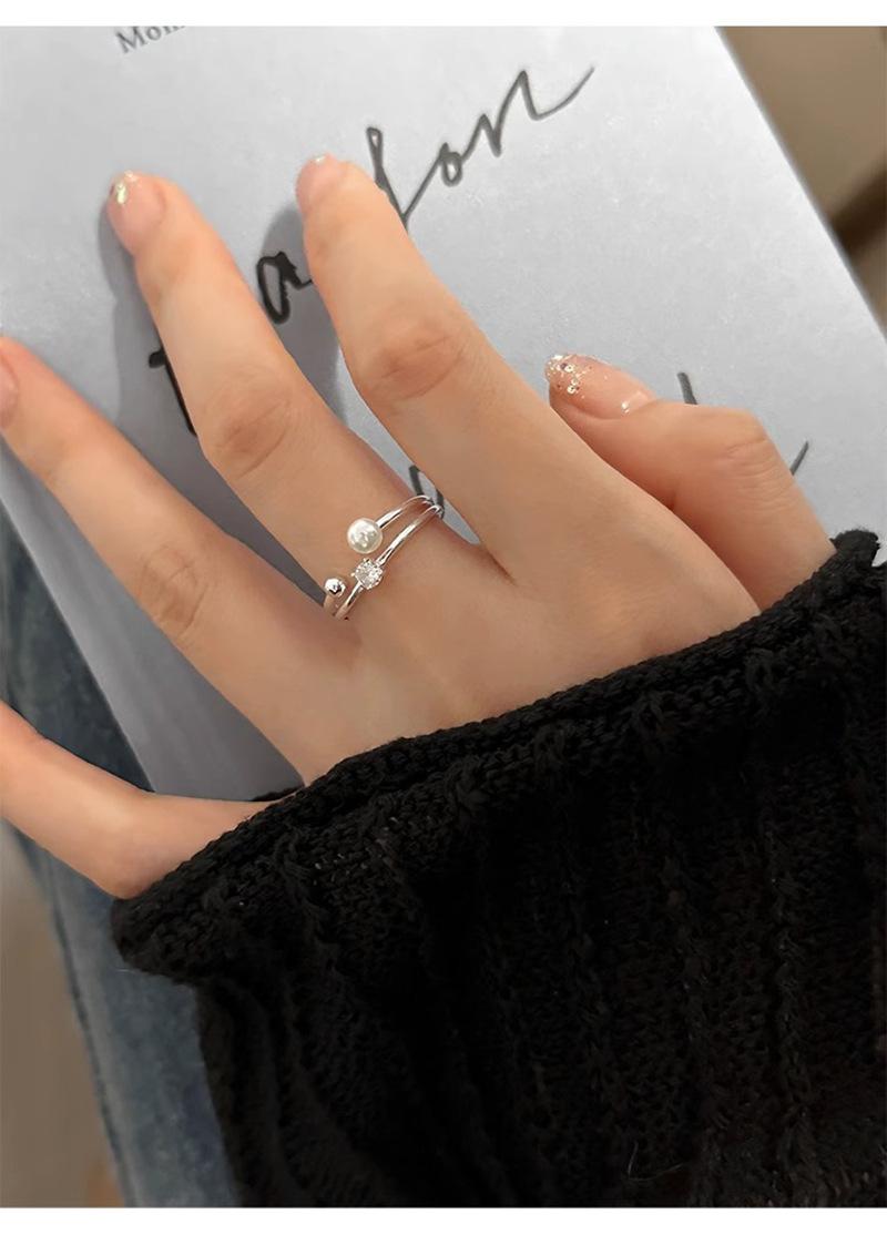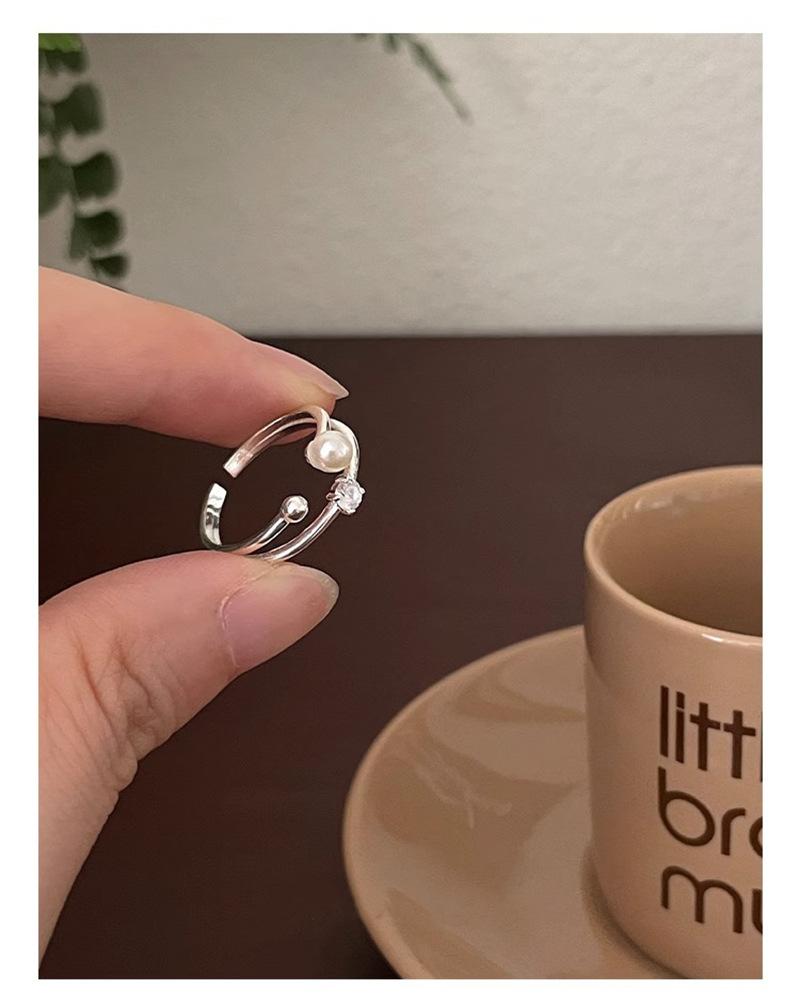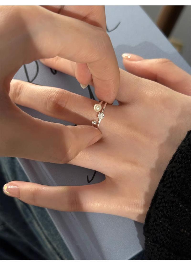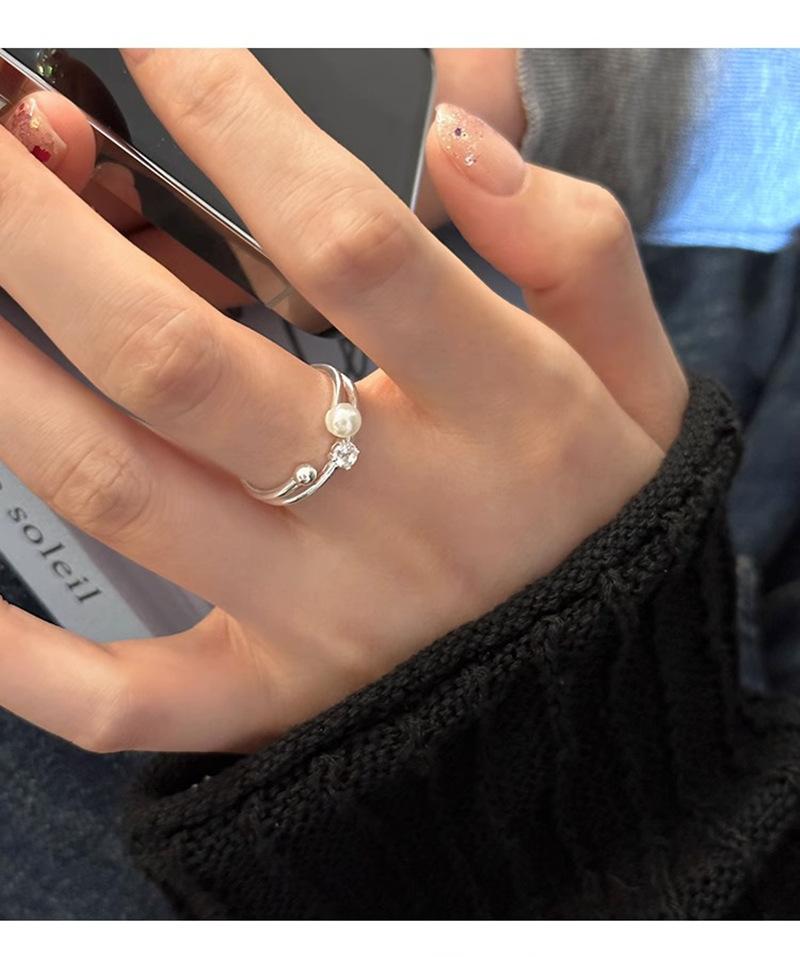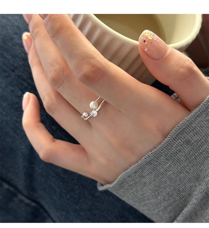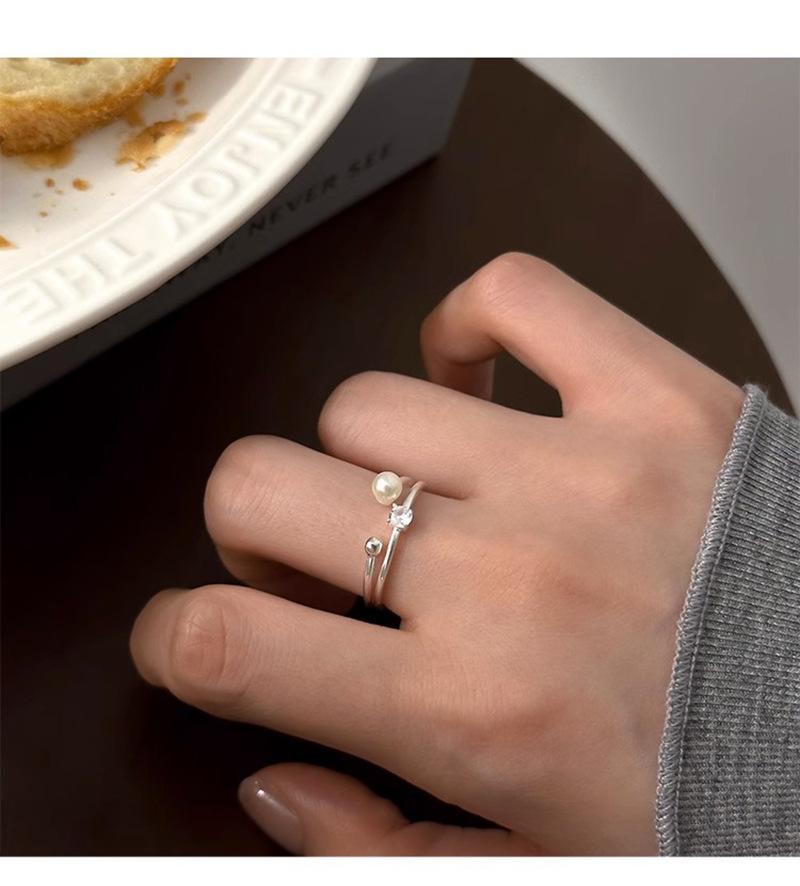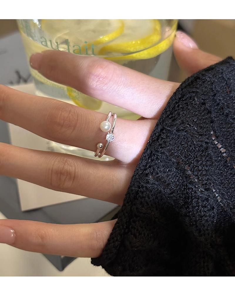 Anillo de Perla de Imitación de Zircón de Doble Capa para Mujer, Diseño Nicho de Lujo Ligero, Diamante Brillante, Estilo Commuter, Anillo Abierto Ajustable para el Dedo Índice