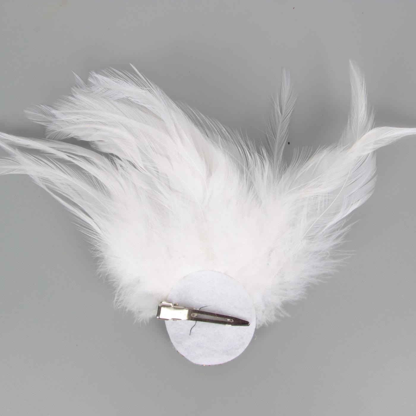 Material: diamantes de imitación de vidrio, plumas, cinta.
