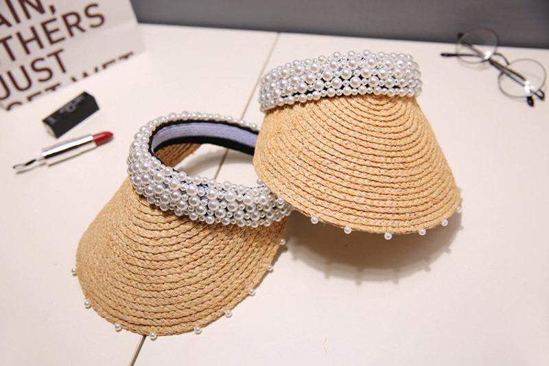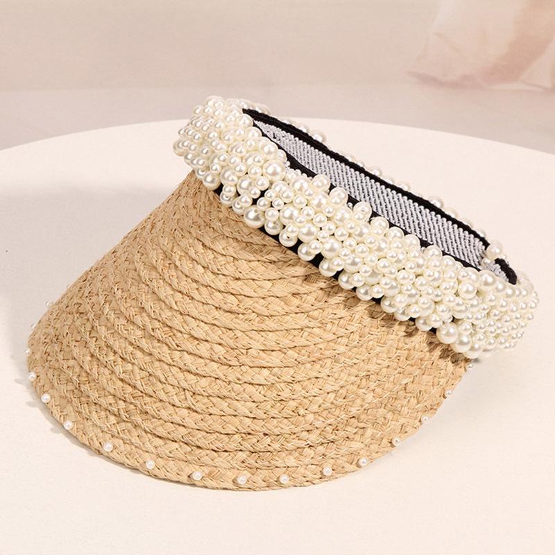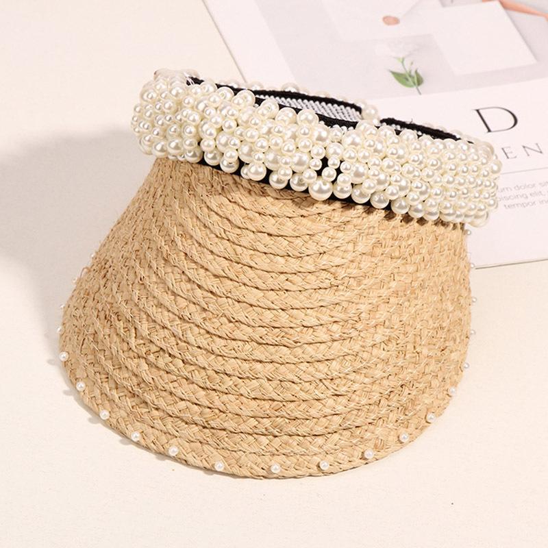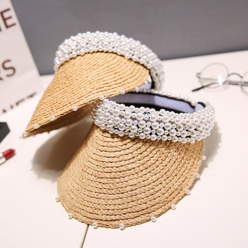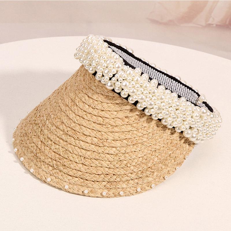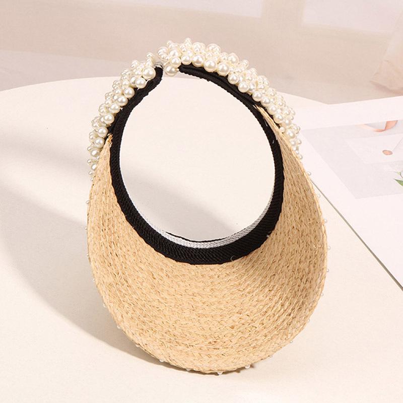 Sombrero Visera de Rafia con Perlas Hecho a Mano para Mujer, Sombrero para el Sol, Gorra de Béisbol, Sombrero de Paja Coreano Cubre Rostro con Ala Ancha