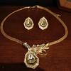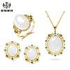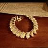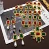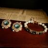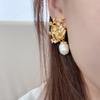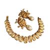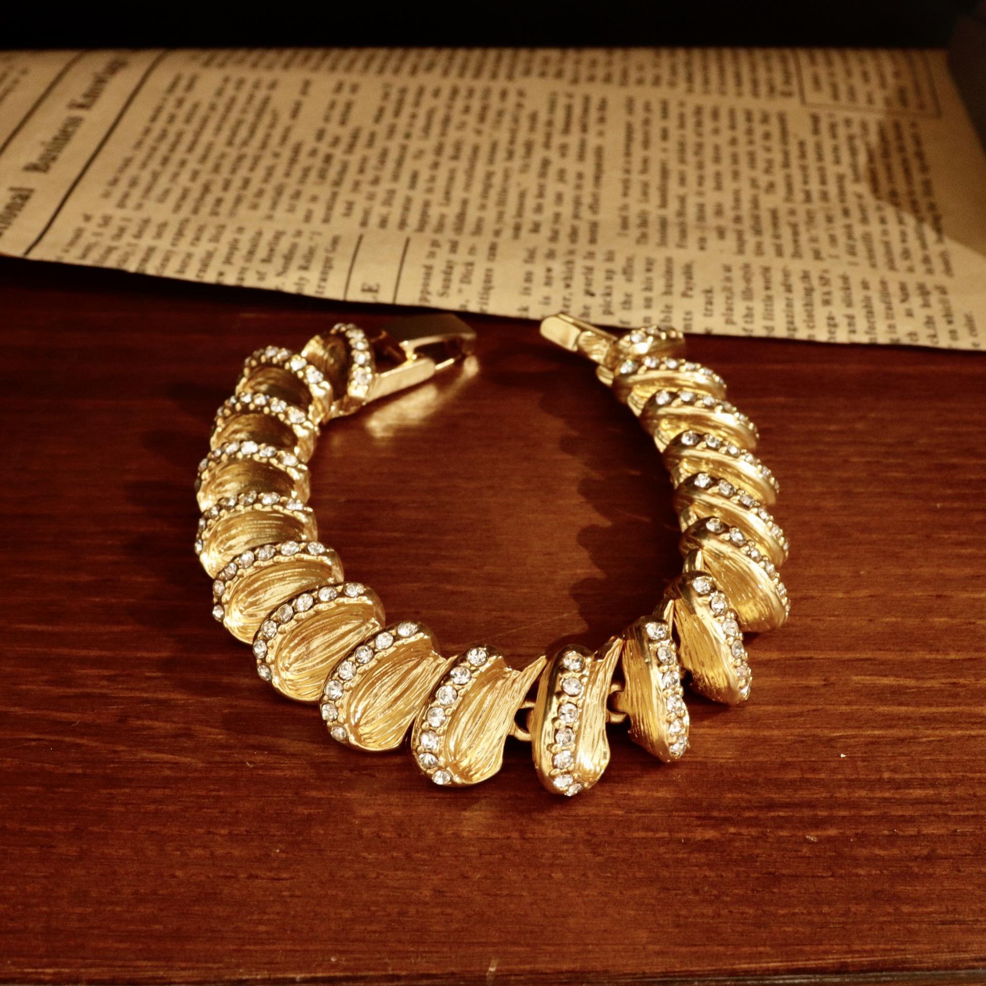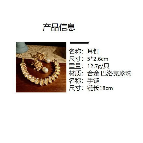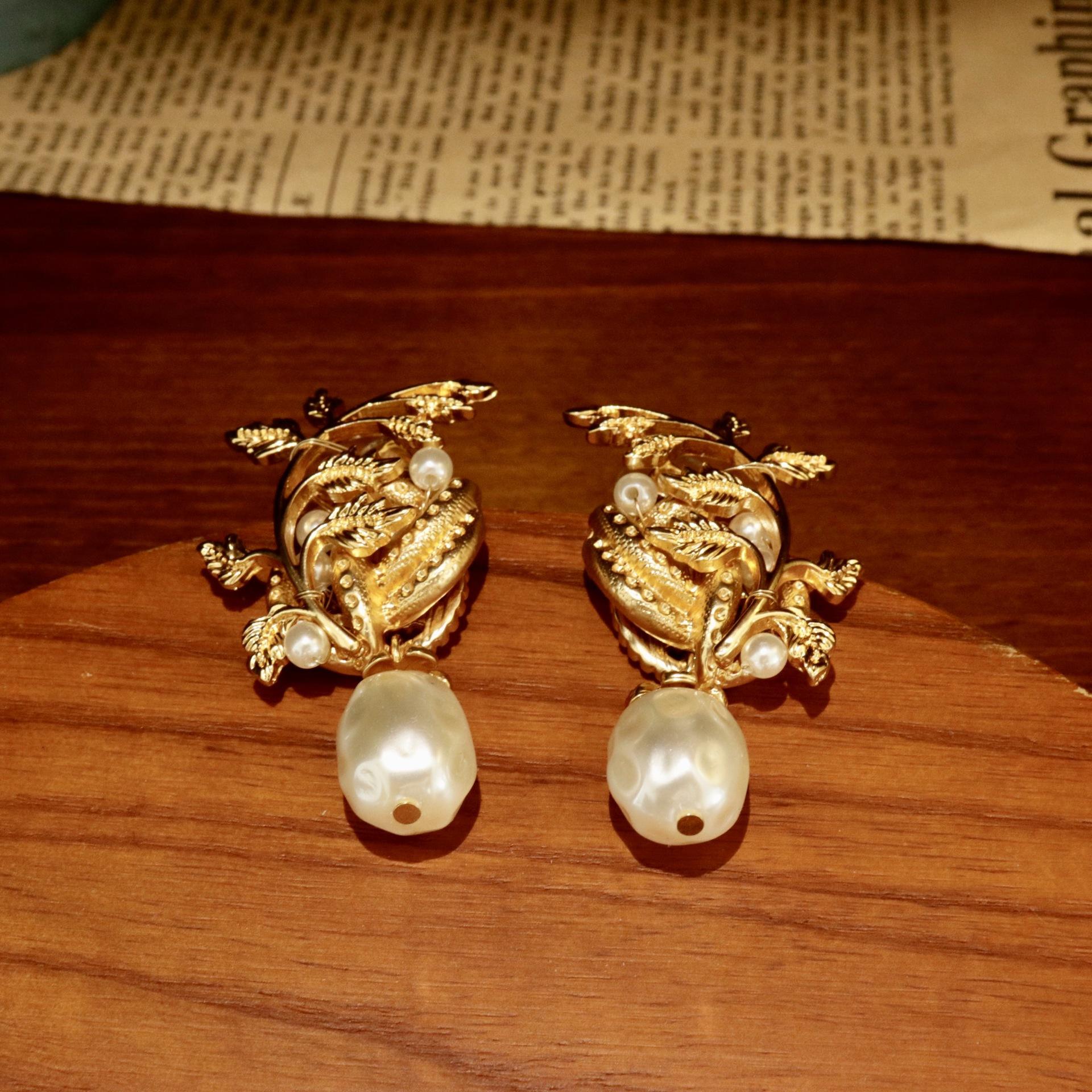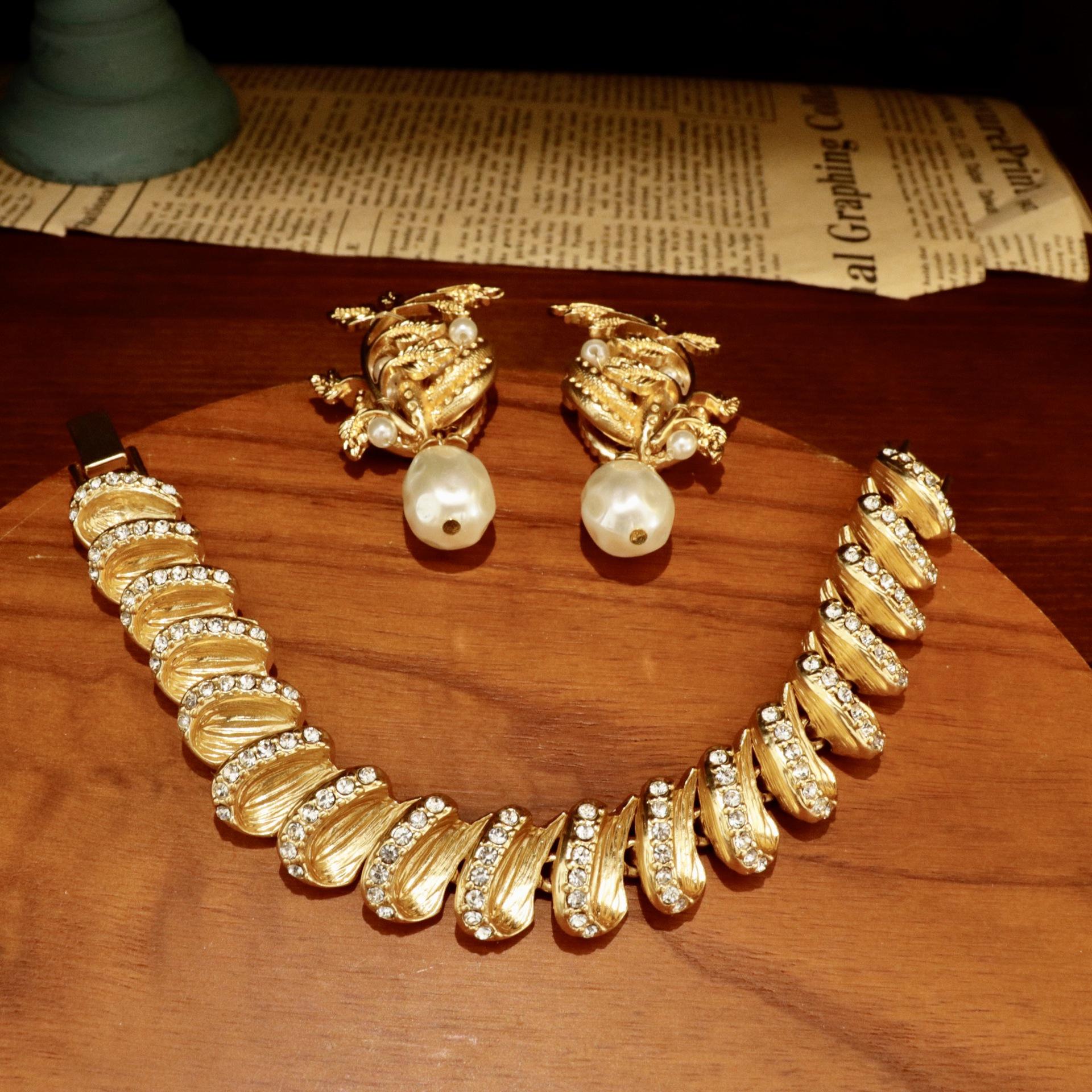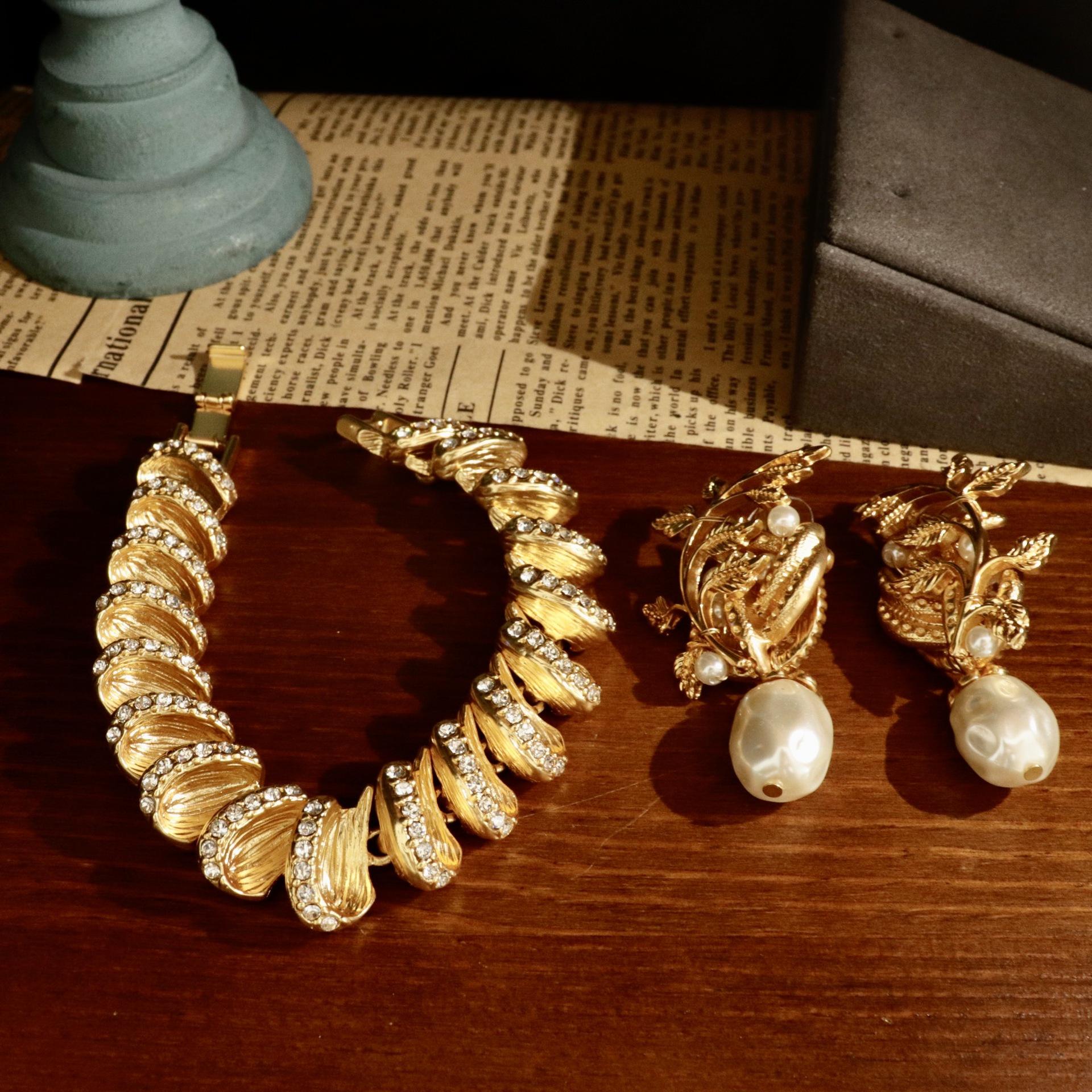 Pendientes de perla con colgante de hoja hueca vintage francesa, exquisito traje chapado en oro auténtico, pulsera de diamantes a juego.