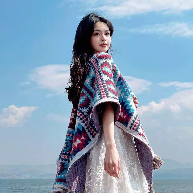 Nuevo Chal Cálido Estilo Retro Bohemio Holgado Ocio Viaje Sesión de Fotos Capa de Punto Estilo Étnico para Mujer