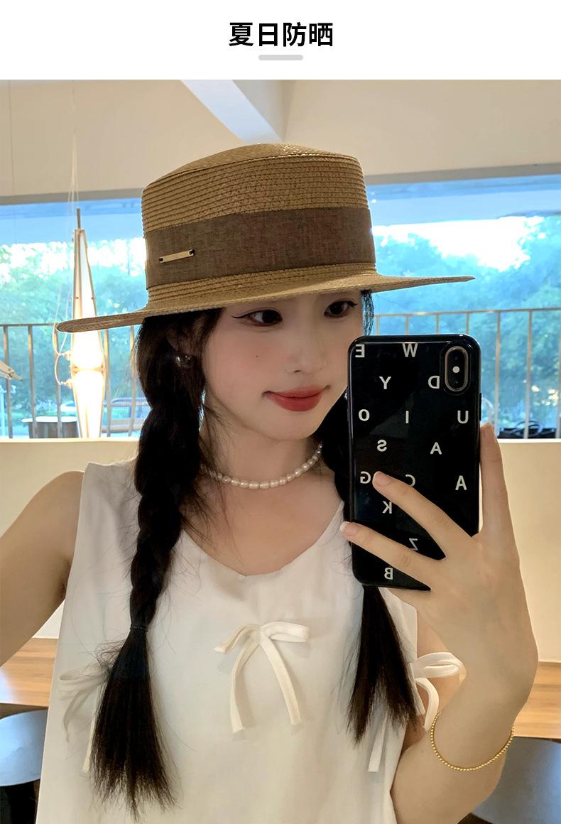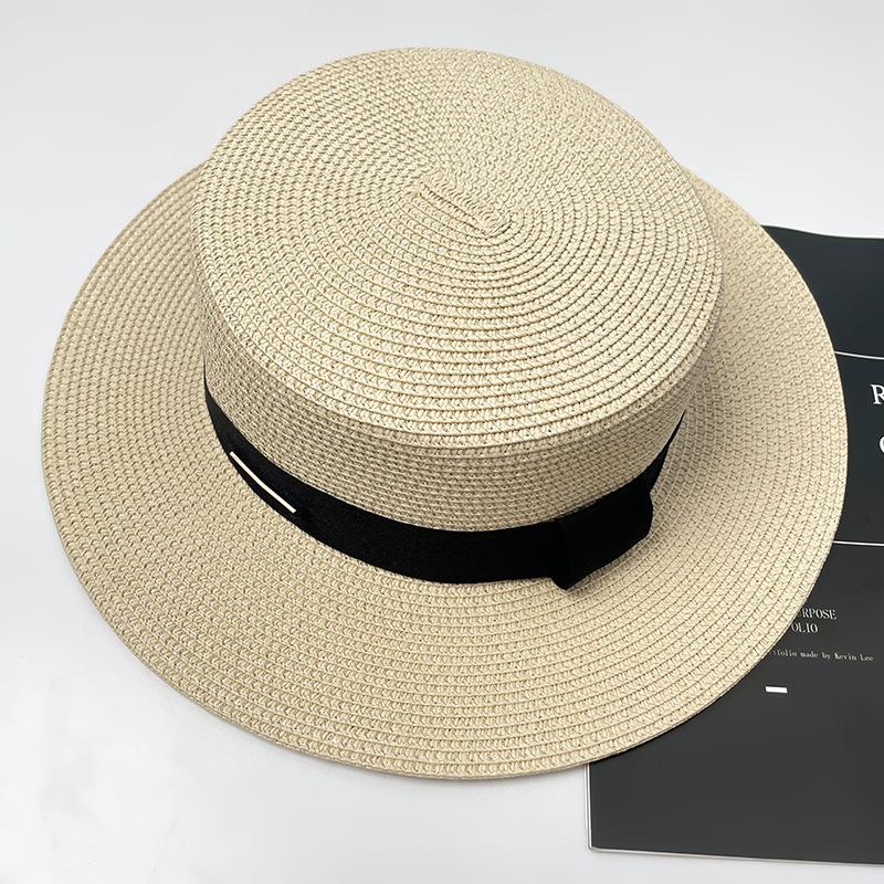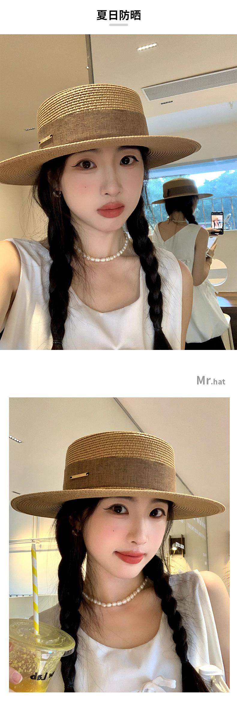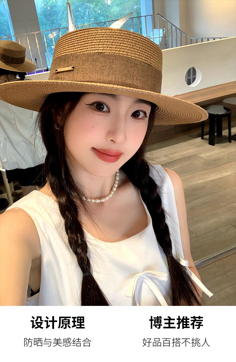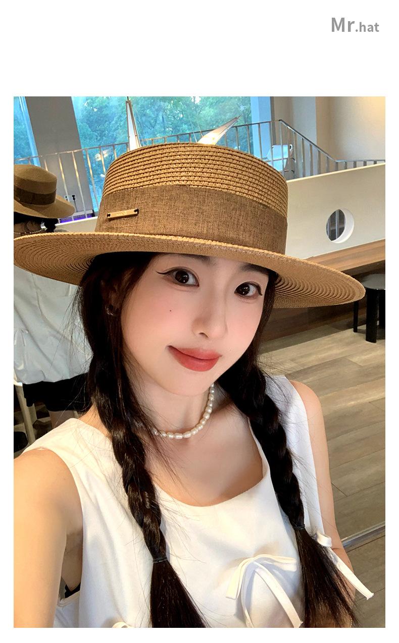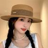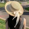 Sombrero de Paja Coreano de Copa Plana Sombrero de Paja para Mujer Sombrero Retro de Verano Sombrero de Playa para la Costa Sombrero de Sol de Ala Ancha para Protección Solar